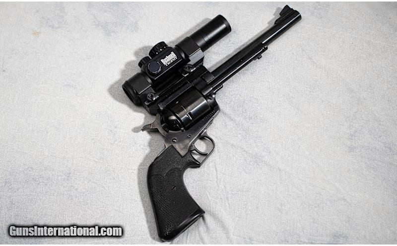 Description: This Ruger New Model Super Blackhawk w/Bushnell Trophy red dot is in very good condition and comes with Pachmayr grips. Cylinder has a light wear ring. Accepts .44 Special for less recoil. The Ruger Super Blackhawk revolver features a patented transfer bar mechanism and loading gate interlock which provide an unparalleled measure of security against accidental discharge. The Super Blackhawk also feature a standard 7.5 Inch cold hammer-forged barrel, adjustable rear and fixed front sights, and is reliable with coil springs throughout for durability. No box. .44 Magnum SOLD Barrels: 7.5 inches Weight: 4 lbs Item Location: Morgantown, WV |