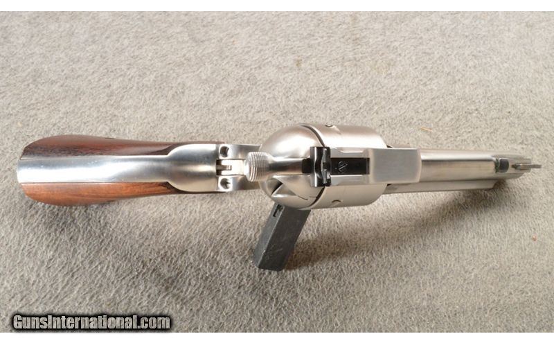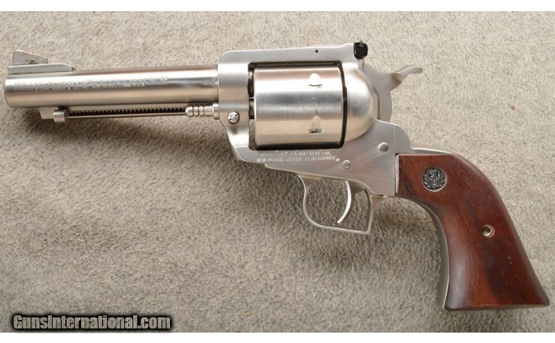Description: This is a very nice Ruger NM Super Blackhawk in .22 Mag. The revolver has been fired some but is still in great condition. The stainless steel has a few very tiny marks and the wood grips have 1 small ding. All in all a very nice revolver. Made in 1988. .44 Magnum SOLD Chambers: 6 shot revolver. Metal Condition: Very good + with a faint turn line and a couple of micro scratches. Wood Condition: Excellent with 1 tiny ding. Bore Condition: Very good. Barrels: 5.5" stainless steel with sights. Triggers: Single stainless steel for single action only. Weight: 44 oz. Sights: Adjustable target rear and a heavy blade front. Item Location: Owatonna, MN |