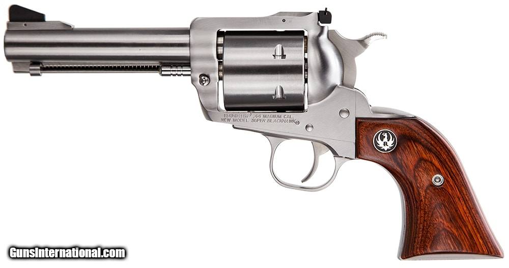 Description: Guns Listing ID: 1070 The Ruger Super Blackhawk Standard is a single-action 6-shot revolver similar to the Blackhawk but designed to handle the 44 Magnum cartridge. A slightly larger-sized steel grip frame adds weight and balance helping to more evenly disperse felt recoil while the squared-off trigger guard aids in protecting knuckles. In addition the hammer spur and trigger are wider and all coil springs contribute to durability. Available in different barrel lengths and finishes the Super Blackhawk Standard is an ideal large-framed revolver to carry on big game hunts. Details Caliber 44 Rem Mag - Grips Hardwood - Front Sight Ramp - Barrel Length 4.62 - Material Stainless Steel - Capacity 6 - Rear Sight Adjustable - Twist 120 RH - Finish Satin Stainless - Overall Length 10.50 - Weight 45 oz. - Grooves 6 SOLD Manufacturer: RUGER Model: SUPER BLACKHAWK Caliber Info: .44 MAGNUM Condition: new Barrels: 4.6 BARREL |