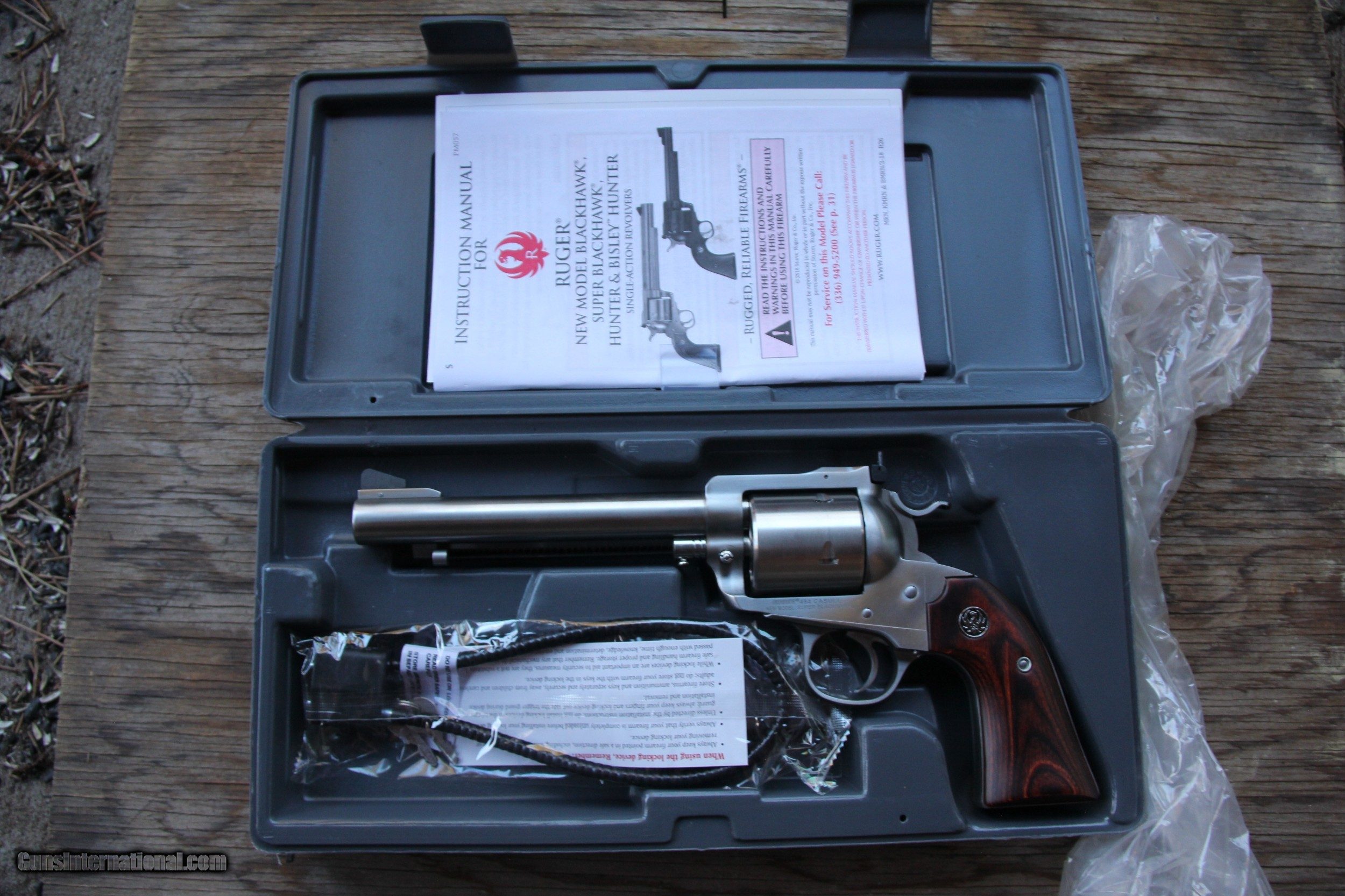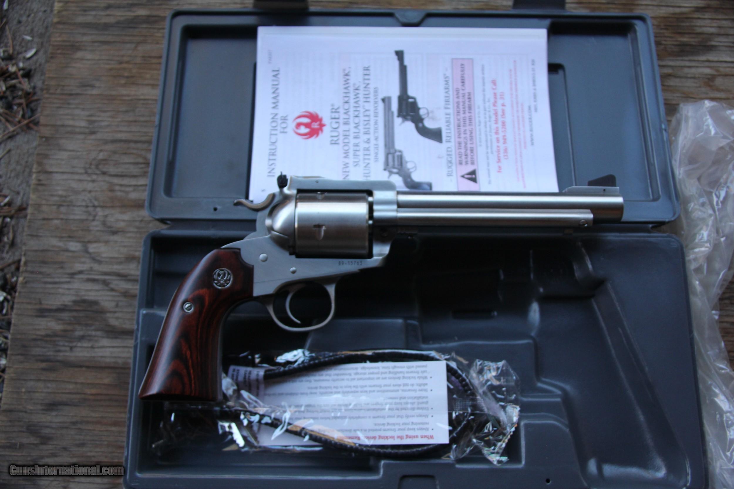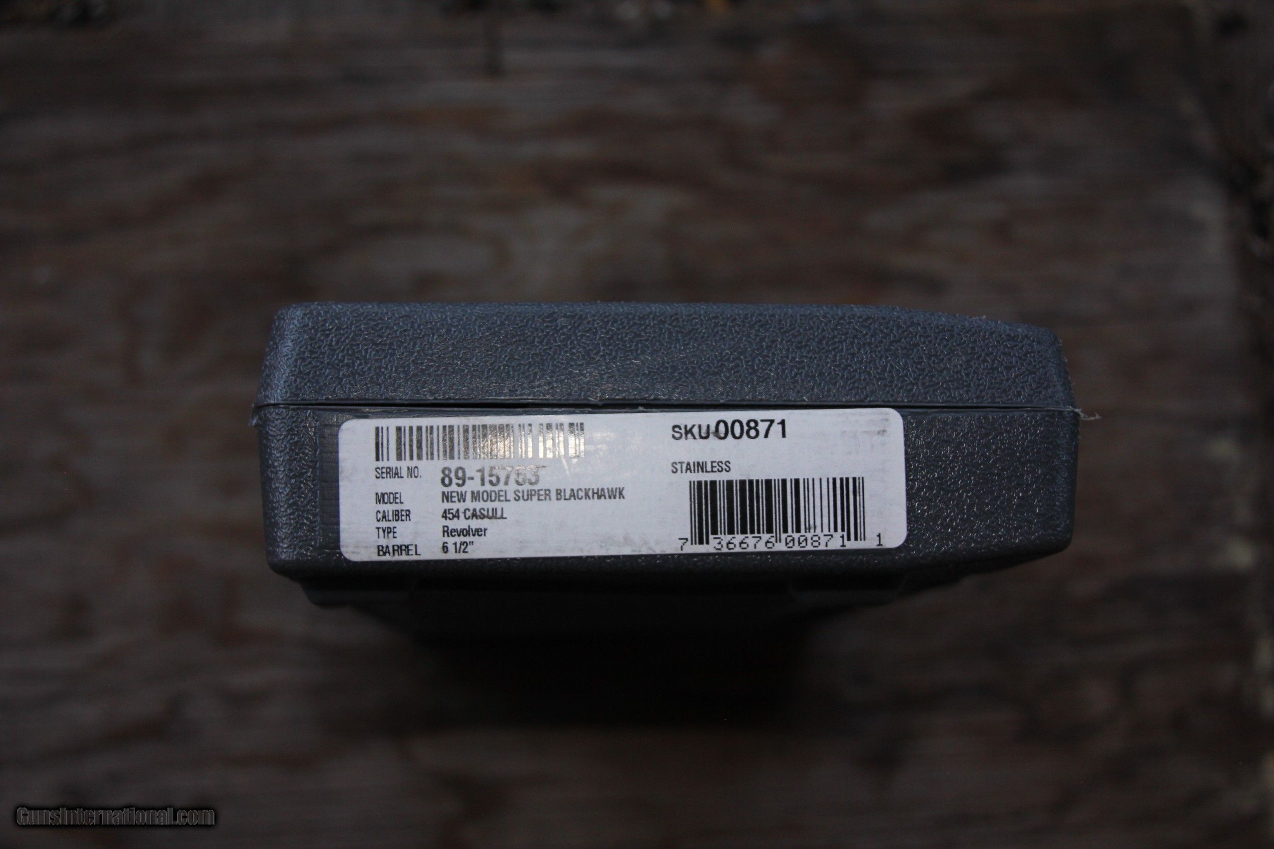 Description: SOLD!! Ruger New Super Blackhawk 454 Casull new in its original box with all of its paperwork and "all important" lock. Shipping $69.00 SOLD Handgun Caliber: .454 Casull Manufacturer: Ruger Model: Super Blakhawk Serial Number: 89-15763 Barrel Length: 61/2 Condition: New Metal Condition: New Wood Condition: New Bore Condition: New Weight: 31/2 |