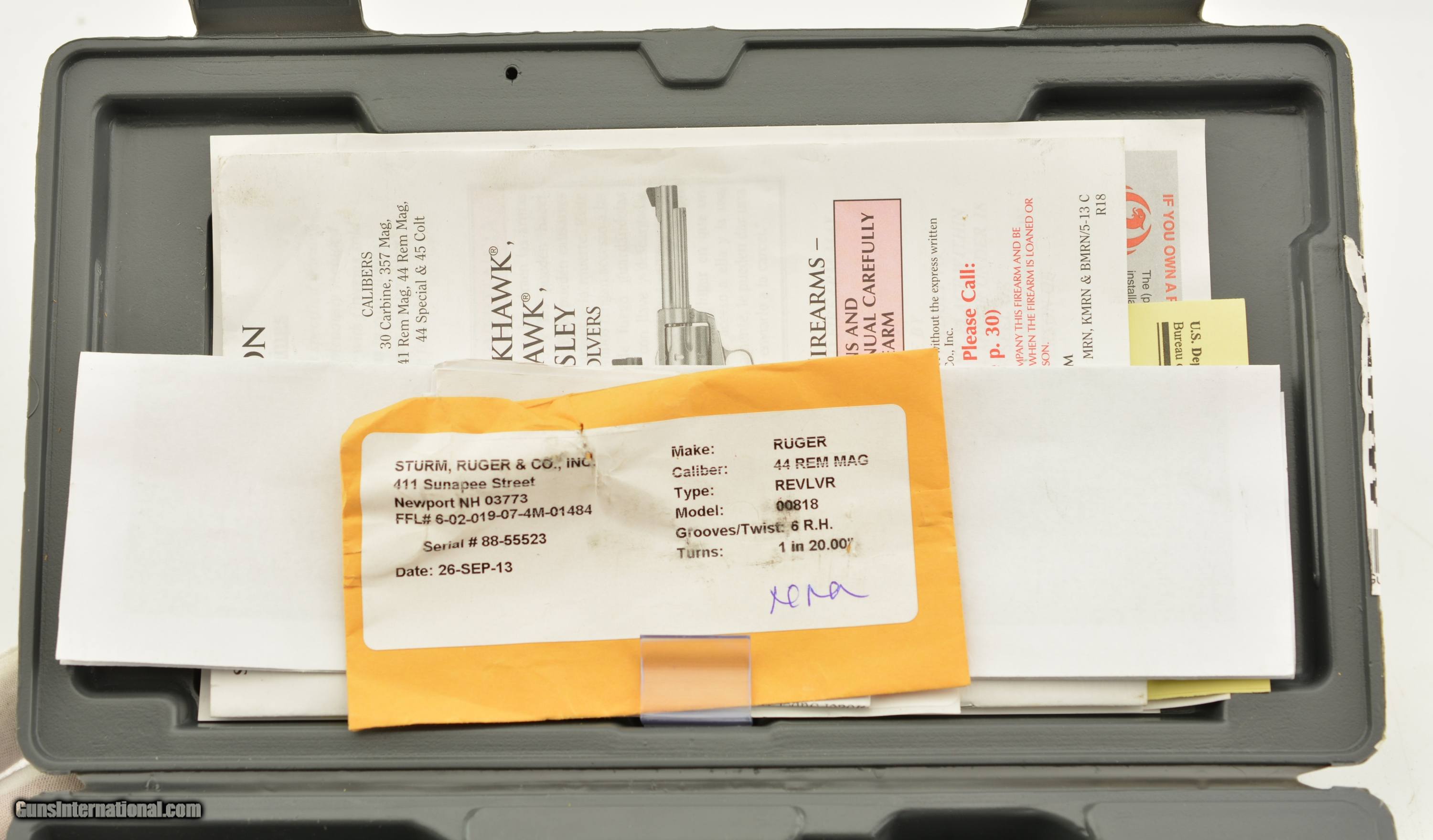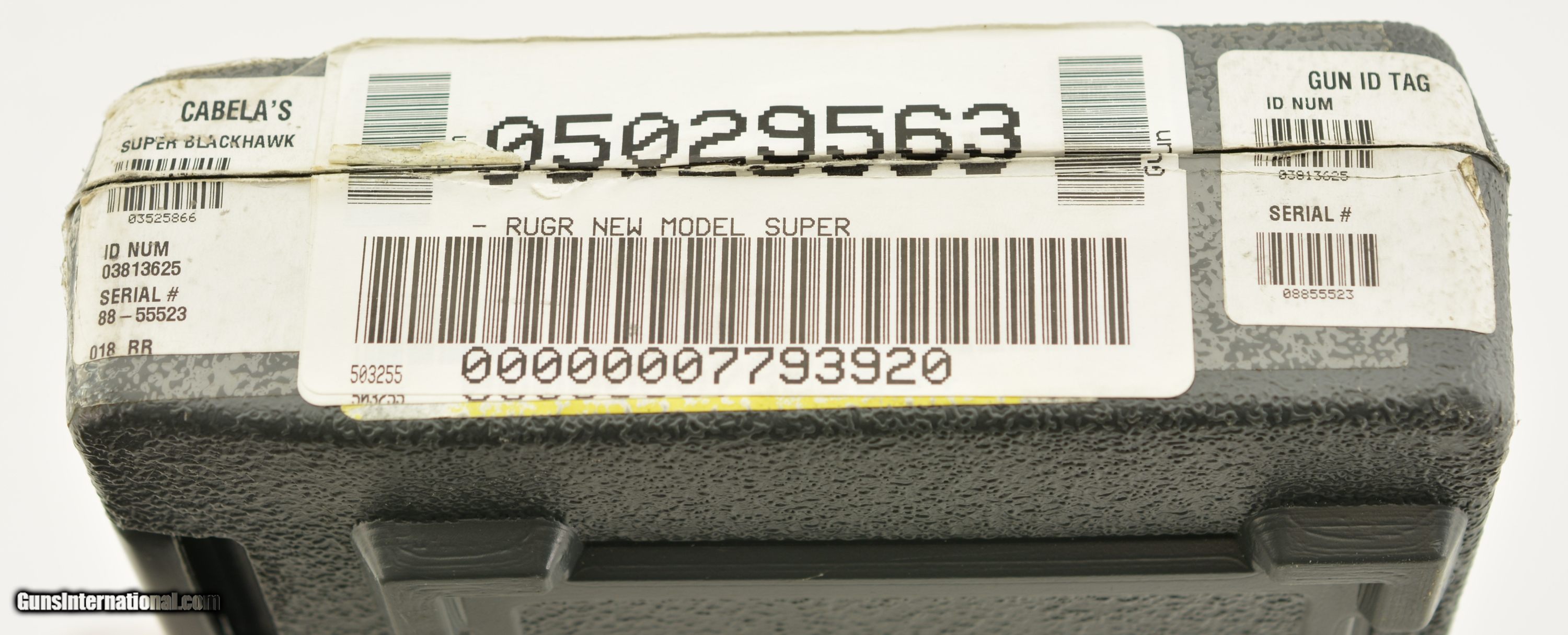 Description: Serial #88-55523, .44 Magnum, 3 ¾ inch barrel with a bright, excellent bore. This is a Ruger New Model Super Blackhawk Bisley (#00818) revolver manufactured in 2013 featuring the Bisley grip frame with brown laminate Ruger logo grips. The special run Distributor Exclusive single action remains in excellent plus condition with virtually all 98-99% of the original matte stainless finish on the barrel and frame showing only a very faint drag line on the cylinder. The brown laminate grips are likewise excellent with some very minor handling marks. It comes in the original Ruger hard plastic case with lock, manual, and spent cartridge. FFL SOLD Manufacturer: Ruger Model: Blackhawk Serial Number: 88-55523 Caliber Info: .44 Magnum Gauge Info: .44 Magnum |