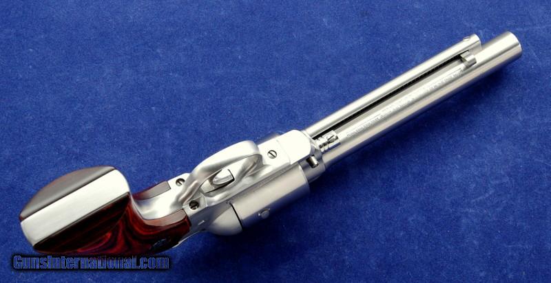 Description: Ruger Stainless steel Bisley Super Blackhawk, chambered in .454 Casull and is Brand New. Features include a 6-1/2” barrel, non fluted 5 shot cylinder, adjustable rear sight, pinned blade front sight, brushed stainless steel finish and laminated wood grips with Ruger medallion inserts. You are not limited to shoot only .454 Casull, it will also shoot .45 Long Colt. SOLD |
