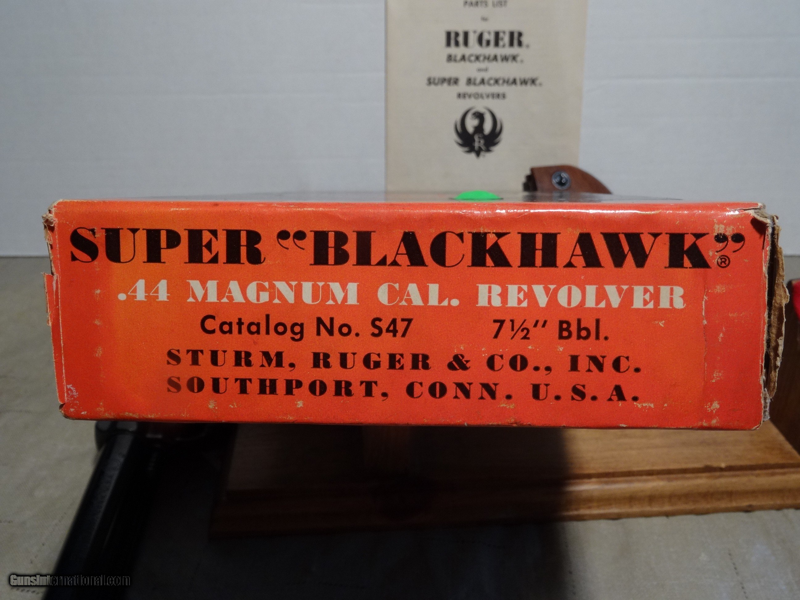 Description: RUGER SUPER BLACKHAWK 44 MAG THREE SCREW NOT UPDATED BARREL LENGTH 7 1/2" WITH FACTORY BOX AND PAPERS. BLUE 99% WITH BOTH CUSTOM GRIPS AND FACTORY GRIPS INCLUDED. NEED MORE INFORMATION ALWAYS BEST TO CALL OUR OFFICE 716-941-3946 SOLD |