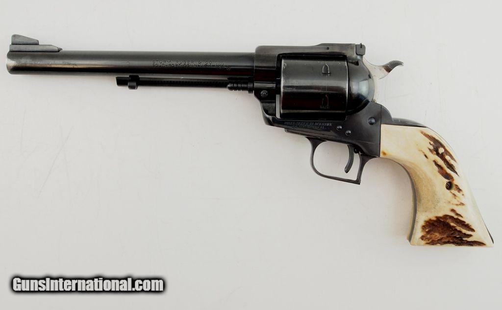 Description: Ruger Super Black Hawk S/N 5742 .44 MAG, 7.5" bbl, bright shiny bore, good rifling, blued finish, adjustable rear notch sight, ramp front sight, and genuine stag grips. Add 3% for Credit Card Shipping $25.00 SOLD |