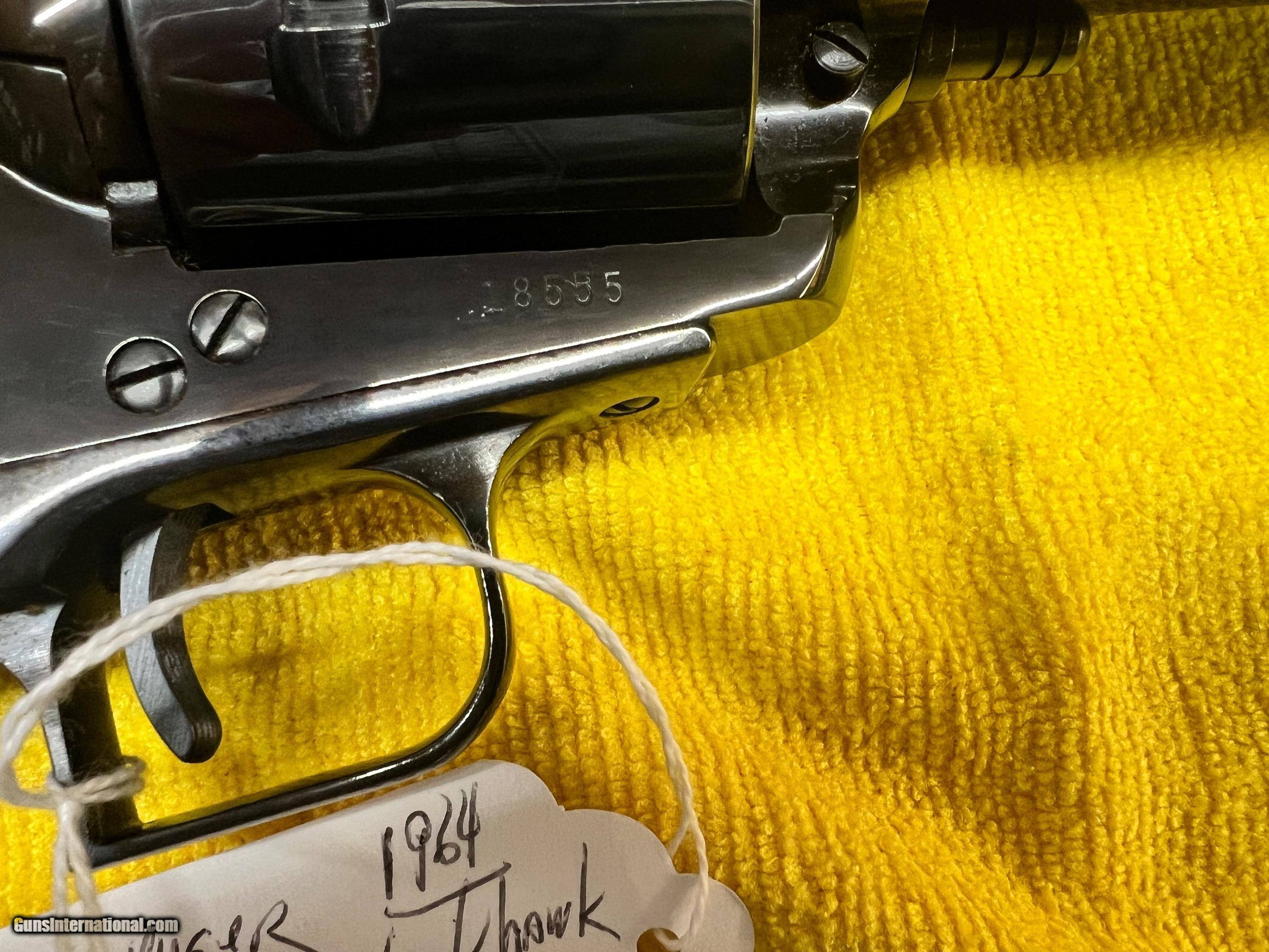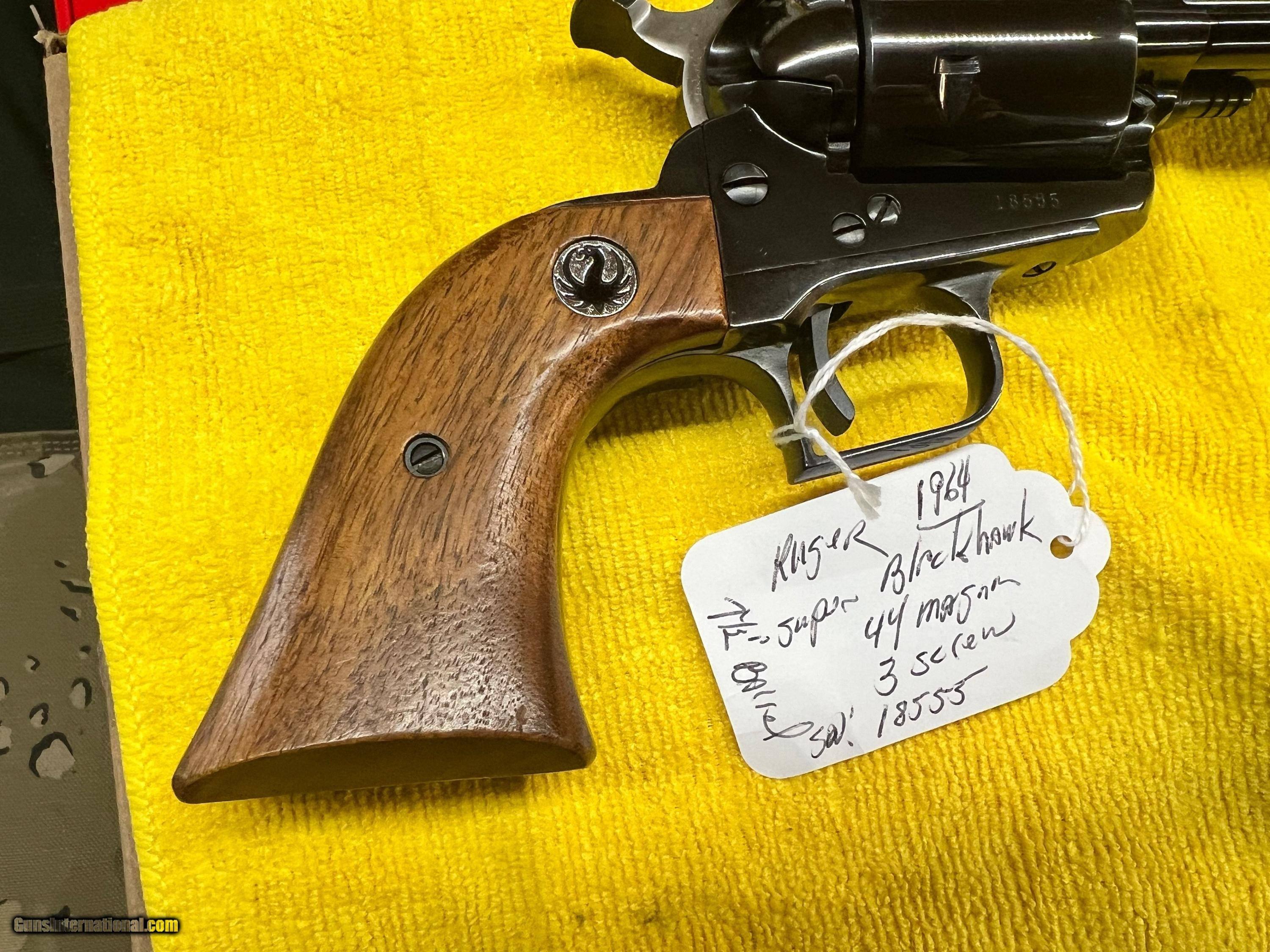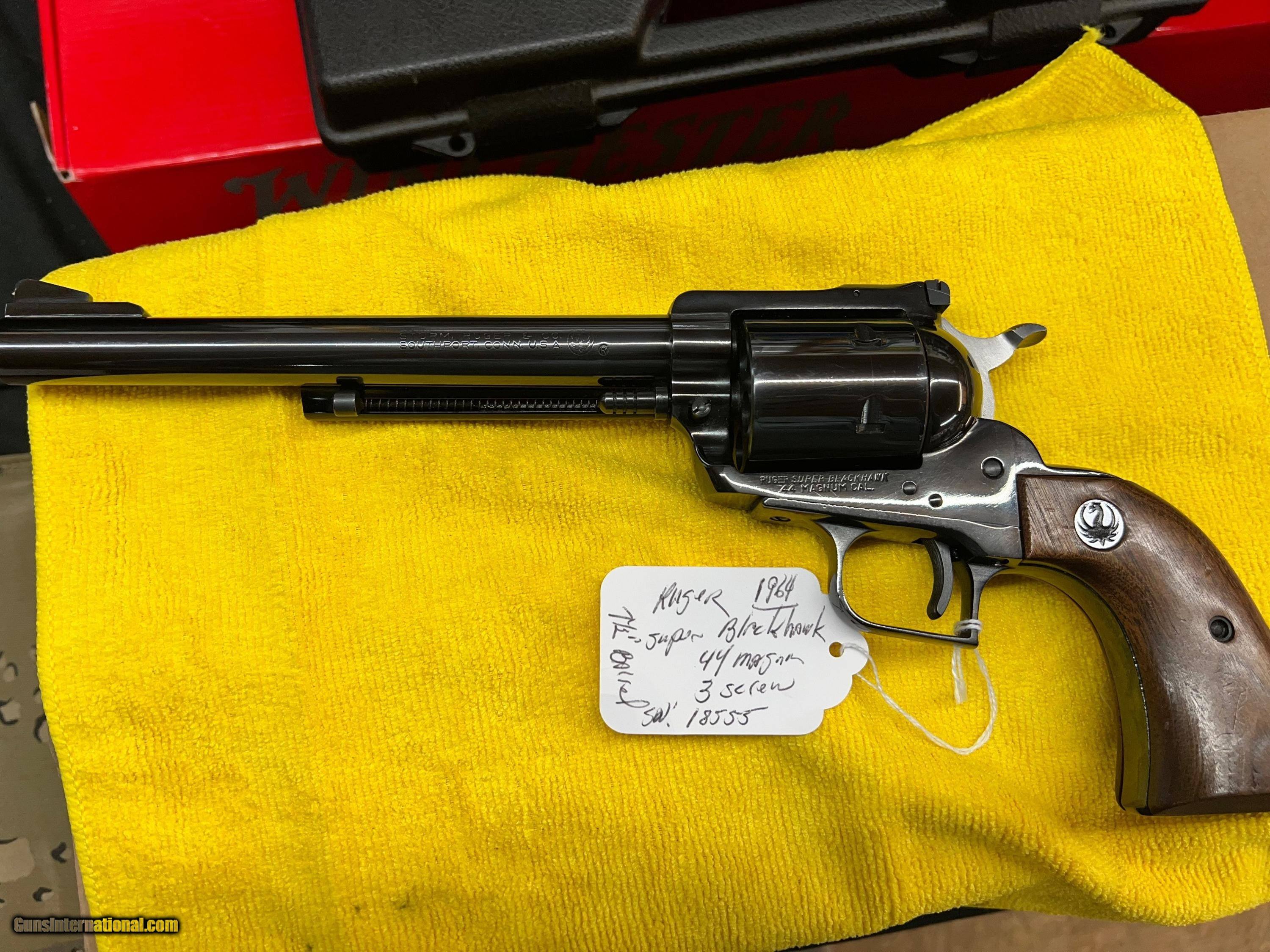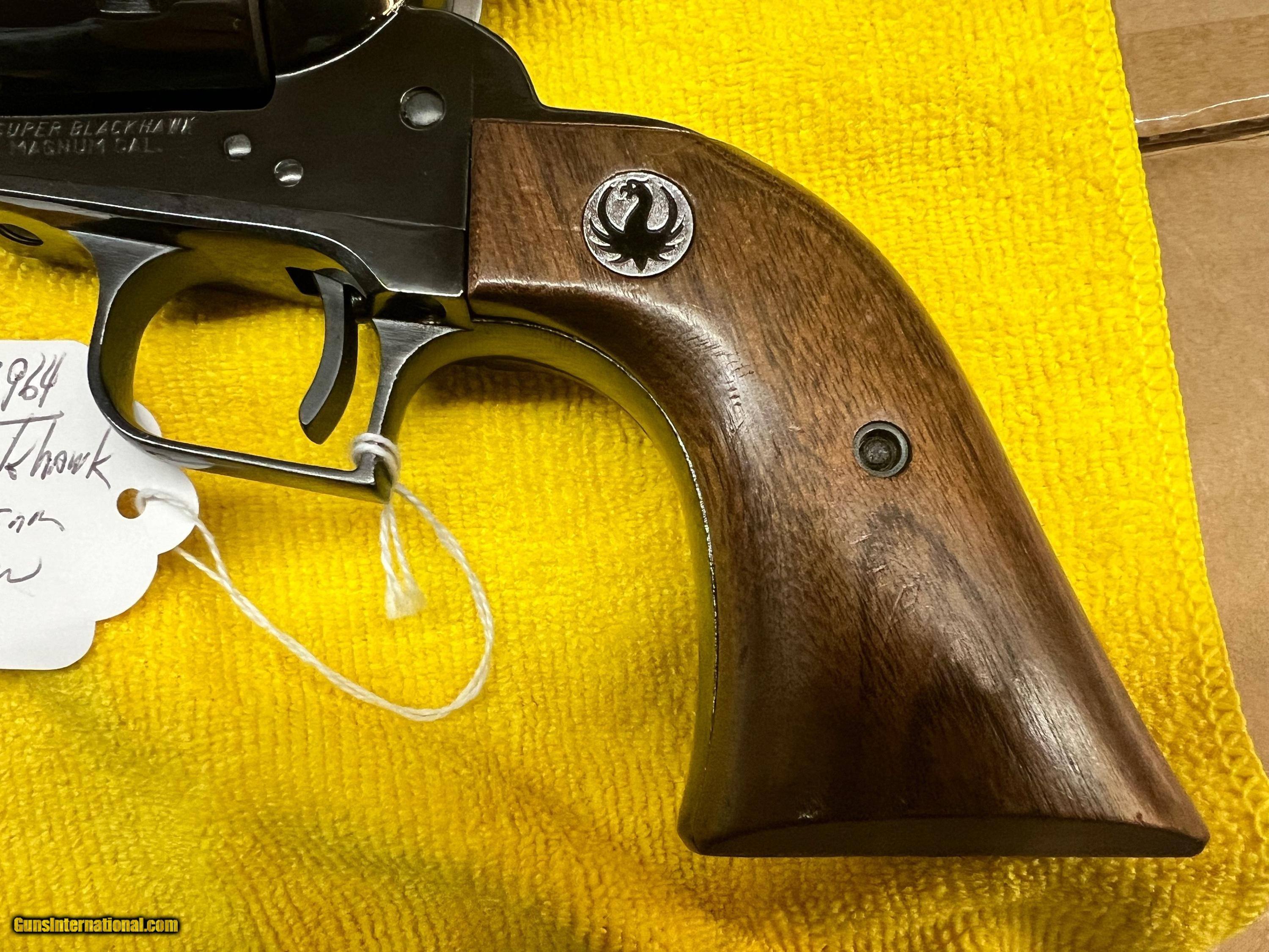 Description: LIKE NEW RUGER SUPER BLACKHAWK, 3 SCREW, .44 MAGNUM, 7 1/2" BARREL, LIKE NEW, MANUFACTURE YEAR 1964, BLACK GLOSS ORIGINAL FINISH, SOFT CASE INCLUDED, SHIPPING $25.00, CREDIT CARD FEE 3%, WON'T SEE ANOTHER ONE THIS CLEAN, SOLD |