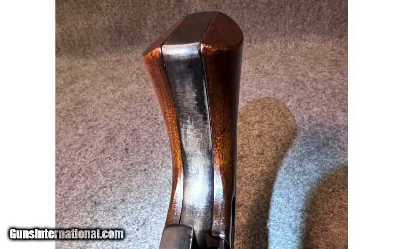 Description: This 1971 single-action magnum revolver is a Sturm, Ruger & Co Super Blackhawk chambered in .44 Magnum with the Ruger factory-installed trigger "Conversion Kit." It has a fixed serrated ramp front sight, adjustable square notch rear sight, gloss blue finish, non-fluted cylinder, original Ruger emblem wood grips, a 7½"" barrel, and a bright and shiny bore with excellent rifling. The bluing is in very good condition, with some bluing loss to the left side of the muzzle, to the right-side area above and inside the trigger guard, backstrap, forestrap, and with some freckling on right side of frame adjacent to the right grip. The wood grips are in good condition with some minor marring in a few places, but nothing that breaks the finish. It comes with the original orange and black Ruger factory box, parts from the "replaced" trigger conversion kit, and manual for the conversion kit. .44 Remington Magnum SOLD Chambers: 6-round cylinder Metal Condition: "Metal bluing is in very good condition, with bluing loss to muzzle, to area above and inside trigger guard, backstrap, forestrap, and with some freckling on right side of frame adjacent to the right grip Wood Condition: "Wood grips are in good condition with some minor marring in a few places, but nothing that breaks the finish Bore Condition: "Bore is very clean, bright, and shiny with very excellent rifling intact (see photo) Barrels: 7½" barrel Triggers: Ruger factory-installed "Conversion Kit" trigger and mechanism Stock Dimensions: 13½" overall length Butt Pad: Original Ruger emblem wood grips Weight: 2 lb 15 oz Sights: "Serrated ramp fixed front sight, adjustable square notch rear sight Item Location: Wichita, KS |