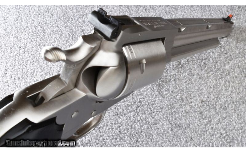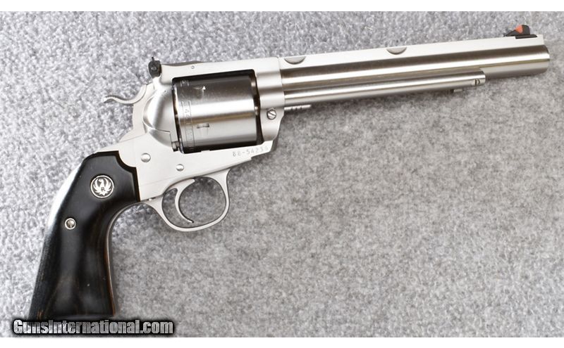 Description: Wood grips have small dings on both sides. Unfluted cylider has light drag ring and gun remains excellent showing very little use. Integral scope mounts on top rib. Complete with box, paperwork and scope rings. Very nice gun. .44 Remington Magnum SOLD Metal Condition: Excellent Wood Condition: Excellent Bore Condition: Excellent Barrels: 7 1/2" Ribbed Triggers: Original Butt Pad: Uncheckered Grey Laminate Grips with Ruger Medallion Weight: 52 oz. Sights: Ramp Front with Orange Insert - Adjustable Square Notch Rear Item Location: Wheeling |