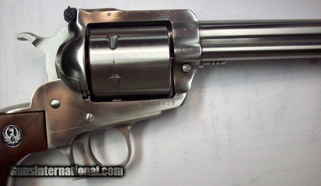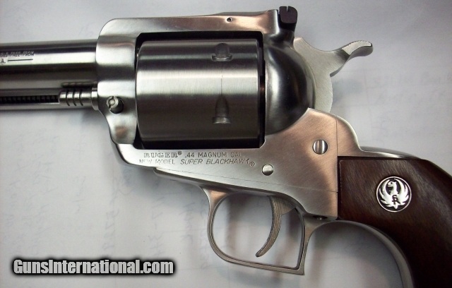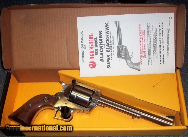 Description: This STAINLESS STEEL .44 MAGNUM is the New Model Ruger SUPER BLACKHAWK with the 7 1/2" Barrel. Dragoon style grip frame with square back trigger guard. UNFLUTED CYLINDER. ADJUSTABLE REAR SIGHT. CONDITION 98/99%. Comes with box and book. $575.00.&nb SOLD |