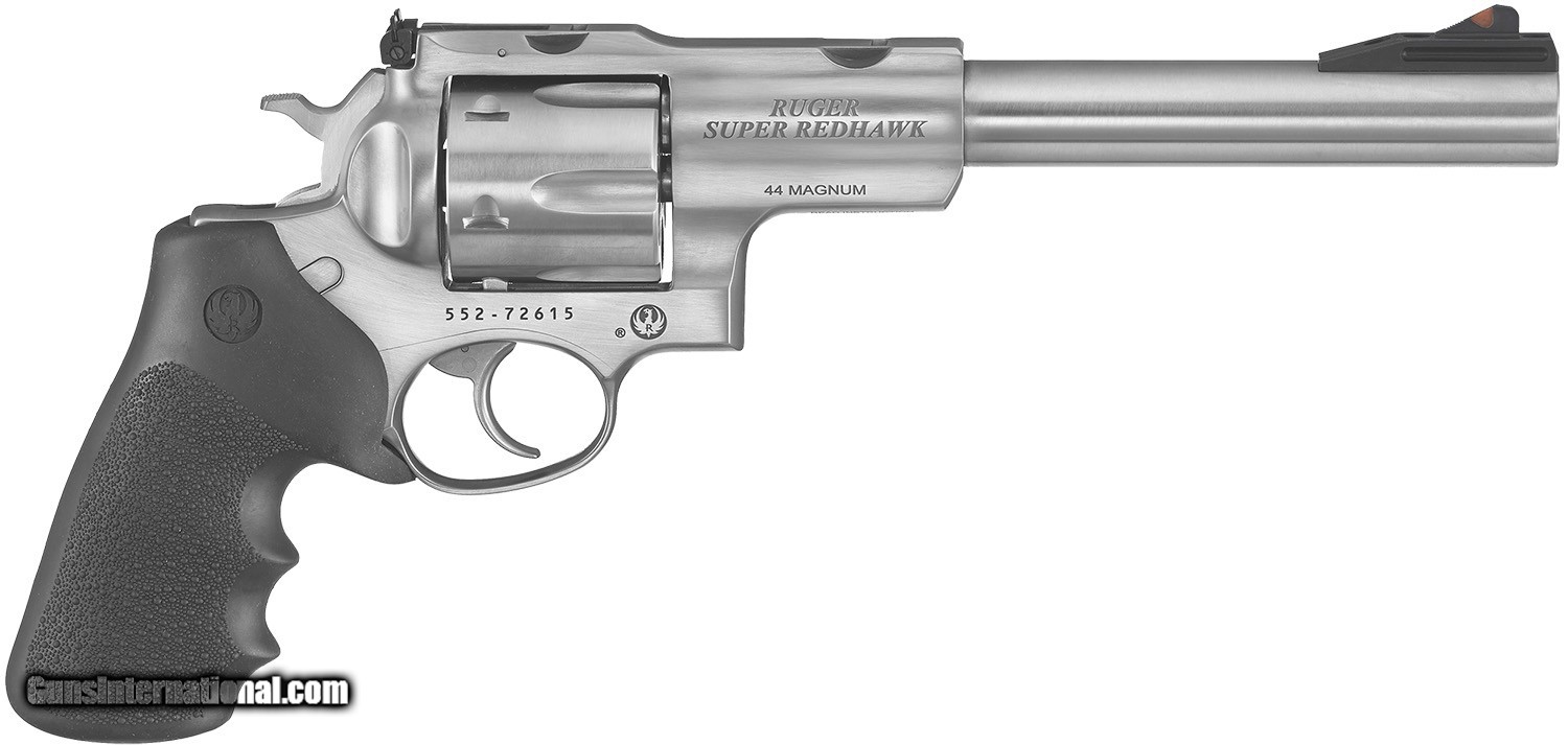 Description: Ruger 5501 Super Redhawk 44 Rem Mag/44 Special 6rd 7.50" Satin Stainless Steel w/Integral Mount Barrel, Satin Stainless Cylinder & Frame, Black Hogue Tamer Monogrip, Transfer Bar Safety ON ITS BEST PRICE! BUY NOW!! The Ruger Super Blackhawk revolvers dual chambering allows the 44 Magnum models to accept factory 44 Special cartridges. Featuring a patented transfer bar mechanism and loading gate interlock which provide an unparalleled measure of security against accidental discharge; traditional western-style, hand-filling grip is comfortable and has natural pointing of any grip style; cold hammer-forged barrel; adjustable rear and fixed front ramp sight with replaceable red ramp insert; integral mounts are machined directly on the solid-steel barrel rib to provide a stable mounting surface. Includes scope rings.