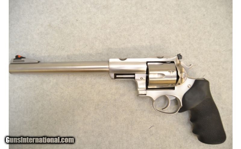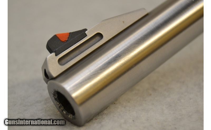 Description: The metal is in overall very good condition with the "expected" marks. There are a few minor handling marks and the cylinder has the rotation ring. There is a moderate scuff on the left side near the muzzle (see pictures). While not deep; it can be felt when sliding your fingers over it. SOLD Caliber Info: .44 Remington Magnum Chambers: 6-shot cylinder Metal Condition: Good overall; see description Wood Condition: Grips are in excellent condition Bore Condition: Excellent Barrels: 9 1/2" Barrel Triggers: Polished stainless steel with smooth surface Stock: Black rubber grips Weight: 3 1/2lbs Sights: Blade front with orange insert and adjustable rear iron sights; Ruger 1" rings included Extras: Includes the factory case with papers and the 1" Ruger scope rings. Item Location: Green Bay, WI |