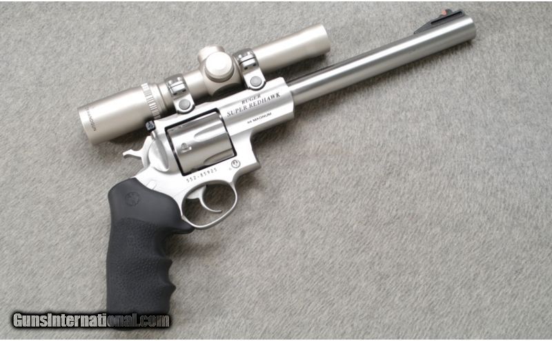 Description: This is a very nice Super Redhawk. Stainless frame and barrel, Hogue rubber grips, and topped with a Burris 2x scope. This double action revolver is ready for big game. SOLD Caliber Info: .44 Magnum Chambers: 6 shot revolver. Metal Condition: Very good, some scratches. Wood Condition: Rubber grips are in very good condition. Bore Condition: Very good. Barrels: 9 1/2" stainless. Triggers: Double action stainless trigger. Stock: Rubber grips. Weight: 74 oz. Sights: Factory iron sights / Burris 2X Handgun. Item Location: Dundee, MI |