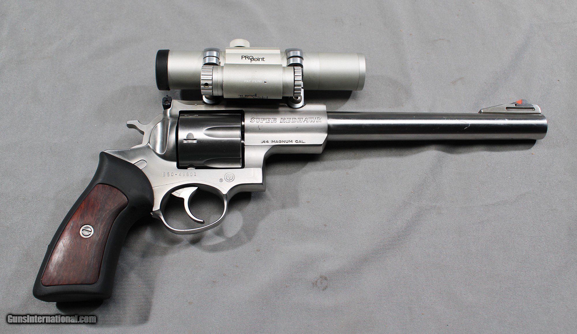 Description: Ruger Super Redhawk chambered in .44 magnum featuring 9.5 inch barrel mounted with a Tasco Pro Point scope. Overall condition is good with some scratches and a gouge in the rubber grip. .44 Magnum Chambers: .44 magnum Metal Condition: "Good, some scuffs and scratches on finish Wood Condition: Good Bore Condition: Good Barrels: 9.5'' Triggers: 6 lbs Stock Dimensions: N/A Fore End: N/A Butt Pad: N/A Weight: 3 lbs Sights: Tasco Pro Point scope Chokes: N/A Item Location: East Peoria, IL Price: $999.99 Contact Seller |