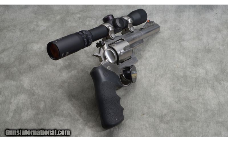 Description: Set up as a hunter with scope, take the scope off and you have a great belt carry back-up gun.Features combat finger groove grips and the convenient to carry 5-3/8 inch barrel, and stainless construction for easy maintenance. SOLD Manufacturer: 2012 based upon the S/N 552-659xx Caliber Info: .44 Remington Magnum Chambers: 6-shot revolver Metal Condition: Excellent. Evidence of firing but very well maintained Wood Condition: Excellent. Bore Condition: Bright and shiny Barrels: 5 -3/8 Inch,, stainless steel Stock: Rubber combat fingergroove grips Weight: 66 oz as shown with scope Sights: Serrated red insert ramp and adjustible notch open sights. Set up with a Burris 1.5x-4x Handgun scope Extras: Case,scope Item Location: Rogers,, MN |