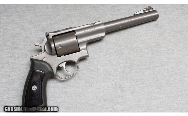Description: Very good, some finish wear small nicks and scratches, comes with original box. Large frame magnum revolver, chambered for the powerful .454 Casull cartridge. 7 1/2" Barrel, unfluted cylinder, adjustable sights. Unique gray color finish, and factory grips. .454 Casull SOLD Chambers: Revolver Metal Condition: Very good Bore Condition: Bright Barrels: 7 1/2 Triggers: Double and single action Butt Pad: Factory grips Sights: Adjustable Item Location: La Vista, NE |