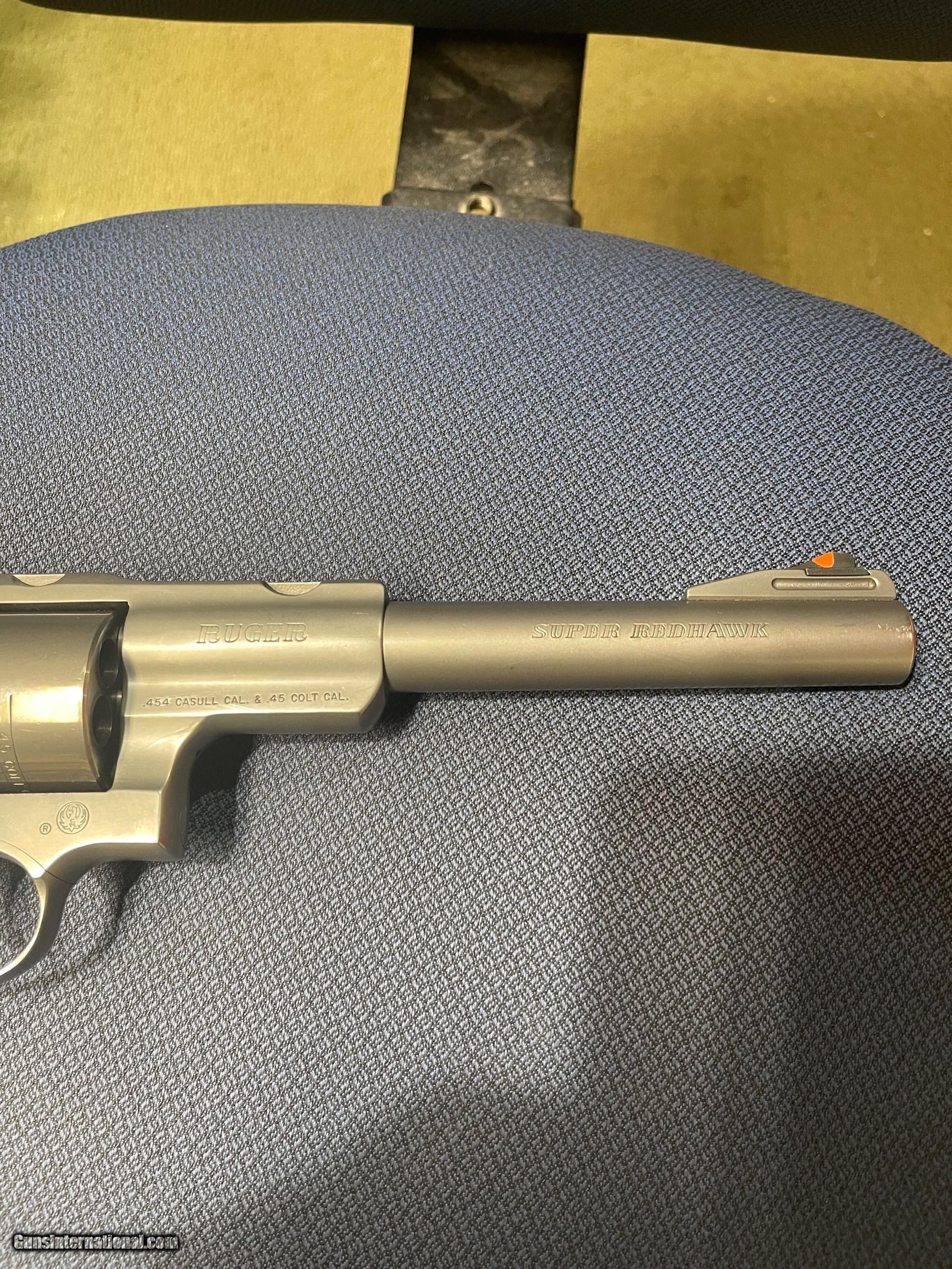 Description: Ruger Super RedHawk 454 or 45 Colt Caliber 7.5 inch barrel This is in the unique Target Gray Stainless finish Comes with factory box very attractive original rose wood grips Very accurate& tight action gun still looks new contact me for more info Thanks SOLD PENDING PAYMENT SOLD |