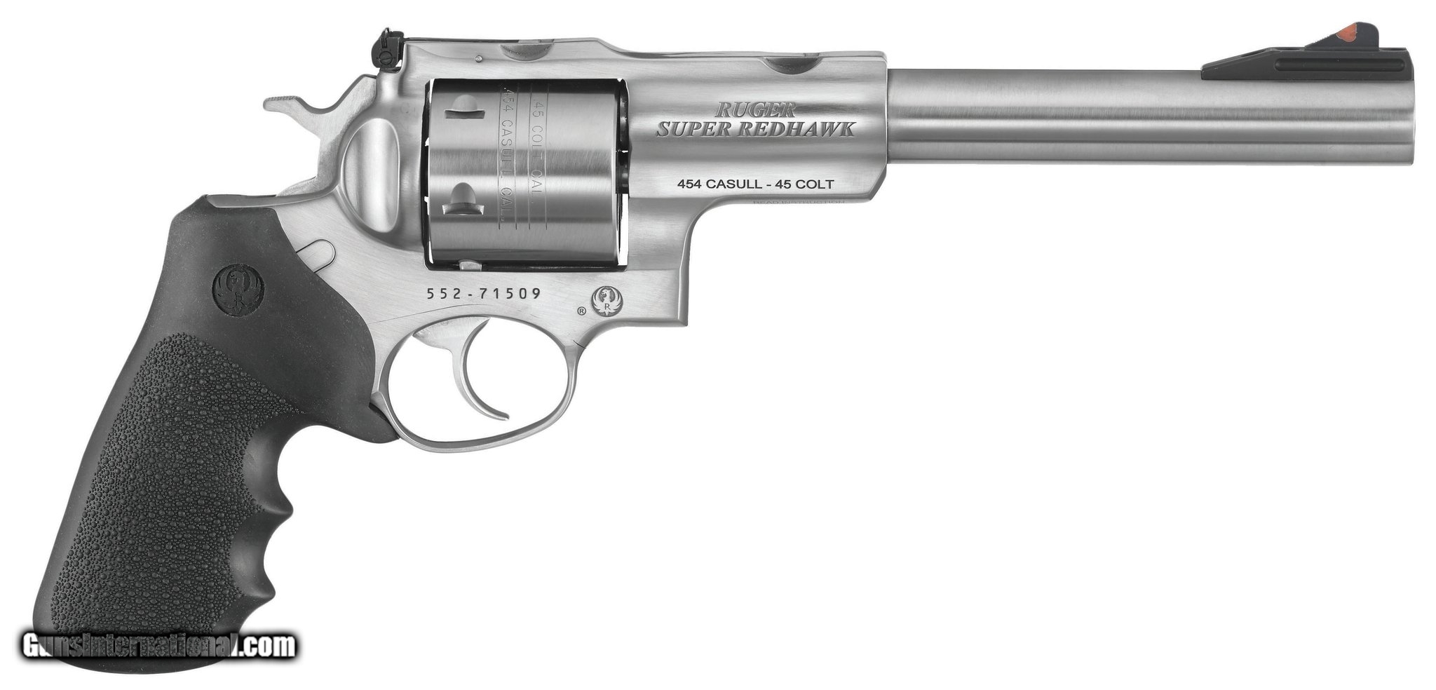 Description: Guns Listing ID: 21613 The Ruger Super Redhawk is a powerful revolver that packs the same favored features of the original Superhawk with a little extra punch. In addition to the corrosion-resistant stainless steel construction for durability the cold hammer-forged barrel for accuracy and longevity and the triple-locking cylinder to aid in alignment and reliability shot after shot the Super Redhawk also features an extra-rigid scope mounting system and frame machined to accept Ruger scope rings. Available in a number of calibers and barrel lengths the Super Redhawk is an ideal revolver for carrying in big-game country. Details Caliber 480 Ruger - Grip Hogue Tamer Monogrip - Front Sight Ramp - Capacity 6 - Twist 118 RH - Overall Length 13 - Rear Sight Adjustable - Finish Satin Stainless - Weight 53 oz. - Barrel Length 7.50 - Grooves 6 - Triple-locking cylinder is locked into the frame at the front rear and bottom for more positive alignment and dependable operation shot after shot. - Corrosion-resistant stainless steel finish boasts the durability and reliability that is the hallmark of a Ruger firearm. - Strong extended frame with extra metal in top strap sidewalls and barrel mounting areas to handle powerful big game loads. - Recoil cushioning Hogue Tamer Monogrip with an internal recoil cushion positioned under theof the hand helps reduce the impact of powerful loads while peg-style grip frame easily accommodates custom grips. - Patented transfer bar mechanism provides an unparalleled measure of security against accidental discharge. - Adjustable rear sight and fixed replaceable red ramp insert front sight. - Cold hammer-forged barrel results in ultra-precise rifling that provides exceptional accuracy longevity and easy cleaning. - Patented integral mounts are machined directly on the solid-steel barrel rib to provide a stable mounting surface for scope rings eliminating a potential source of looseness and inaccuracy in the field. SOLD Manufacturer: RUGER Model: SUPER REDHAWK Caliber Info: .480 RUGER Condition: new Barrels: 7.5 BARREL Action: DOUBLE ACTION Weight: 3.3 |