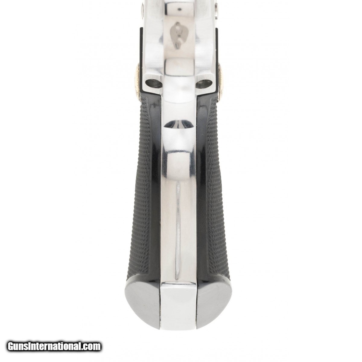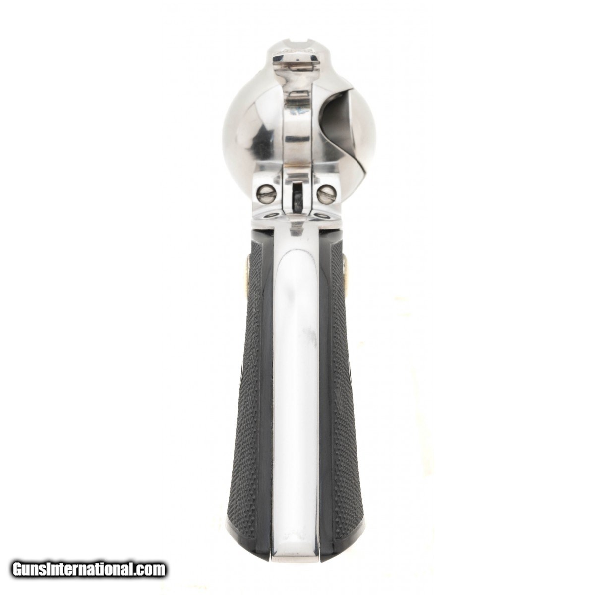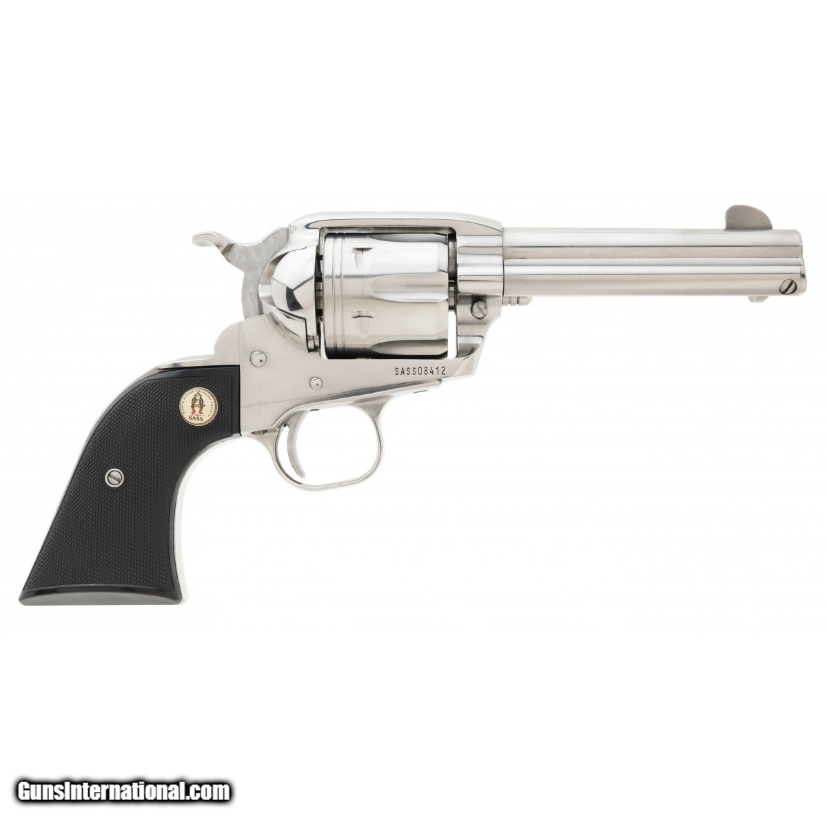 Description: " Consecutive pair of stainless steel Vaqueros with 4.625"" barrels and SASS medallions in the grips. The guns have been customized with jeweled hammers and beveled and engraved cylinders, and have super slick action jobs. A great set, in excellent condition. SOLD |