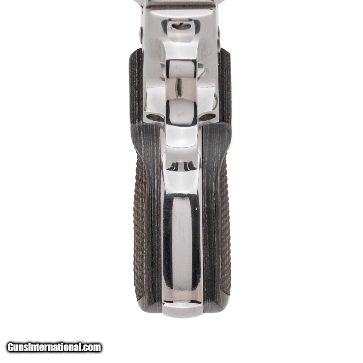 Description: " SN: 59-00993. Modern production. .44 Magnum with a 4"" barrel, bore is excellent. Single action revolver with high gloss stainless finish, blade front sight and checkered laminated wood grips. Overall excellent condition. Comes with box. (Consignment) SOLD |