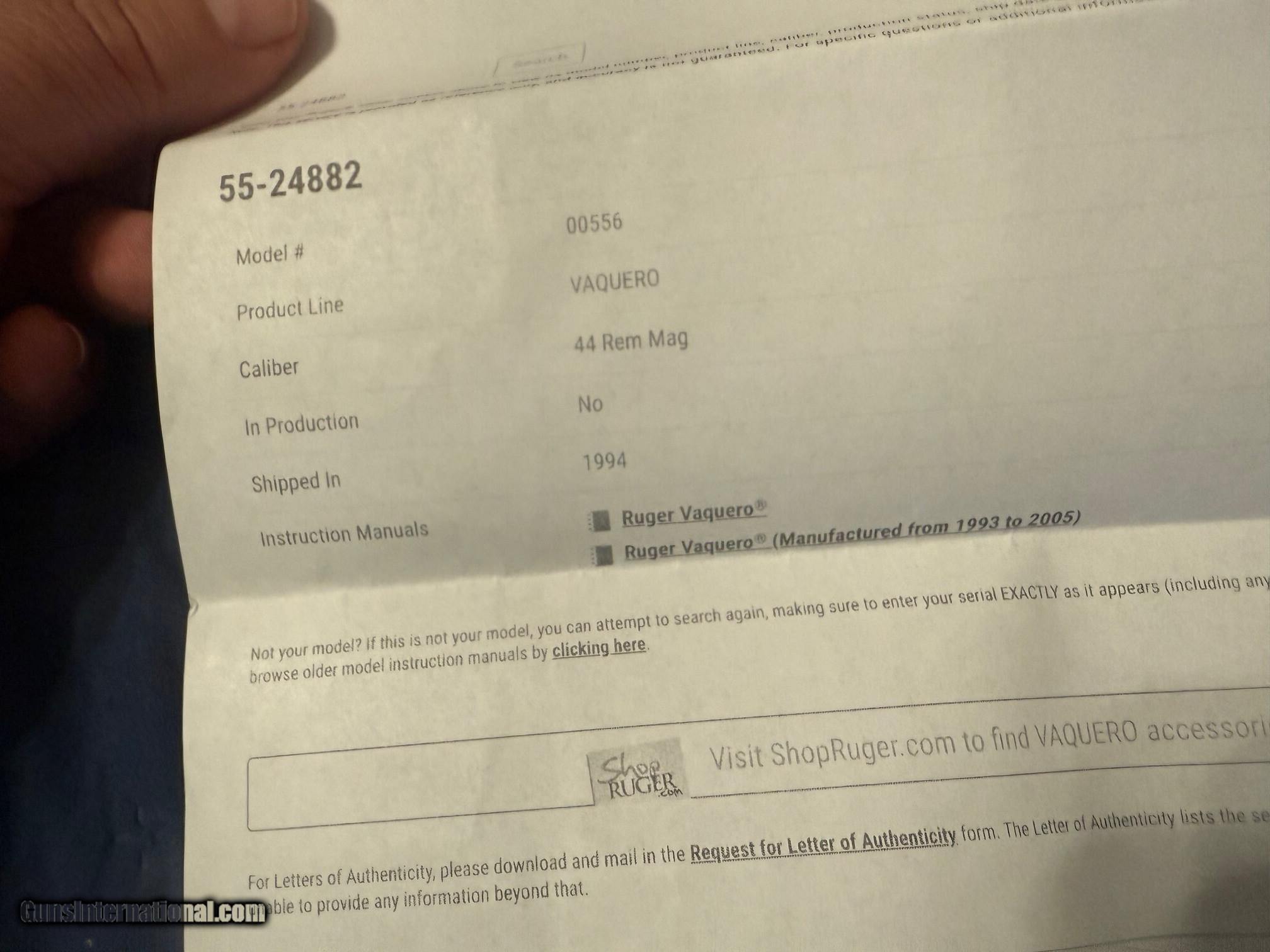 Layaway: 1/3 down, 90 days Shipping $30 Insurance is an extra that must be requested and paid for by the buyer 3-day inspection period for non-firing or disassembly Payment: Personal Check, Money Order, Cert. Check, or Zelle 20% restocking fee on all returned items randywine2000yahoo (703) 858-2881 Handgun Caliber: .44 Remington Magnum Manufacturer: Ruger Model: Vaquero Serial Number: 55-24882 Barrel Length: 4 3/4 Bore Info: Twist 1:20" RH Chambers: 6 Condition: Excellent Metal Condition: Excellent Wood Condition: Excellent Bore Condition: Excellent Action: Single Action Triggers: Single Finish: Stainless Steel Weight: 39 ozs Manufacture Date: 1994 Case: Factory Box Grips: Walnut Price: $999.00 Buy Now Contact Seller |