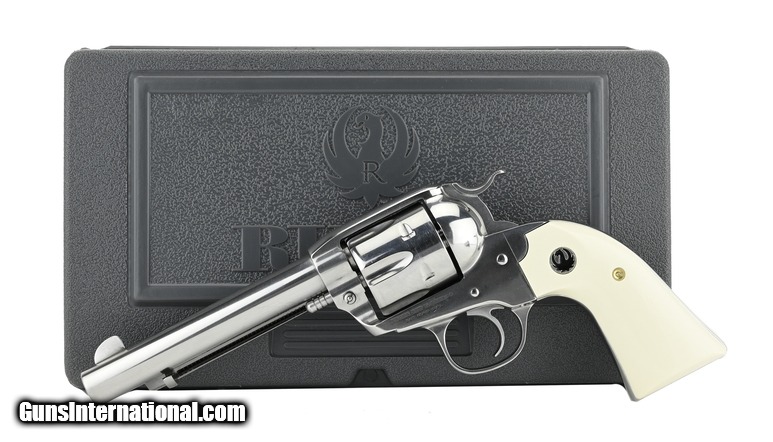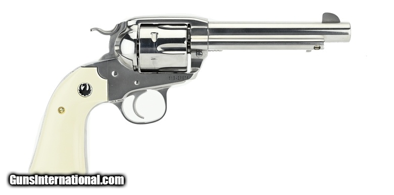 Description: Ruger New Vaquero .357 Magnum caliber revolver. 5 ½” Bisley with bright stainless and fancy grips. With box.