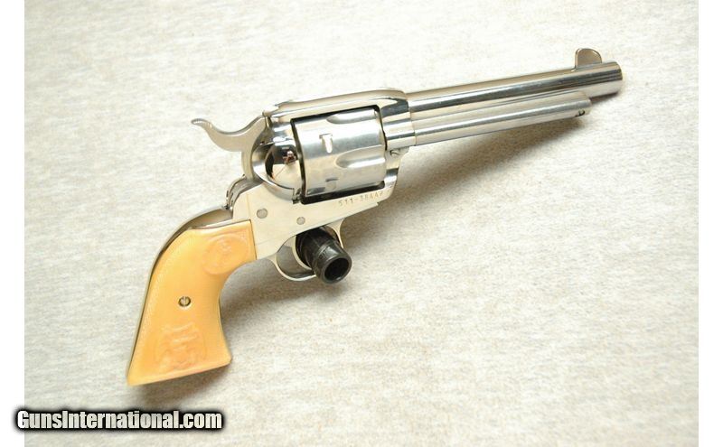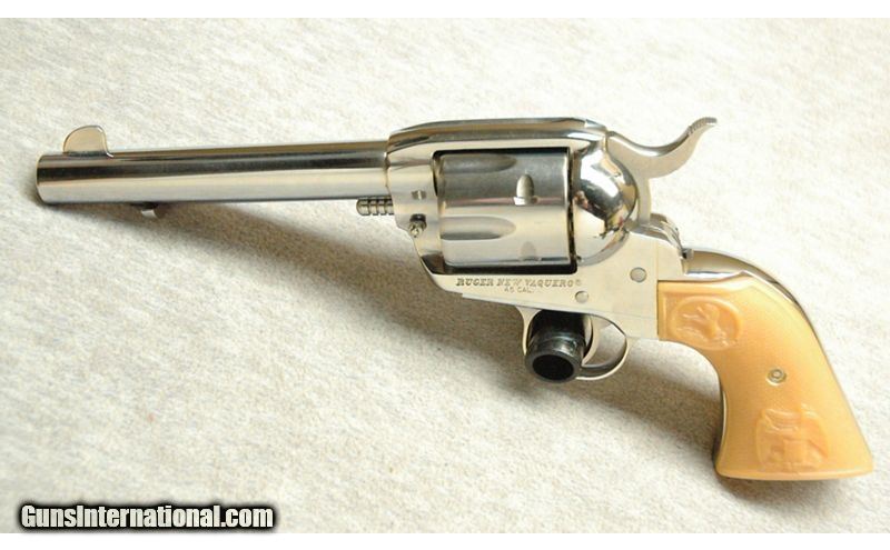 Description: Ruger New Model Vaquero Revolver. Excellent condition. Single action .45 caliber revolver with 5 1/2" barrel, stainless finish, and aftermarket grips. .45 Colt SOLD Chambers: Revolver Metal Condition: Excellent Bore Condition: Bright Barrels: 5 1/2 Triggers: Single action Butt Pad: Aftermarket grips Sights: Fixed sights Item Location: La Vista, NE |