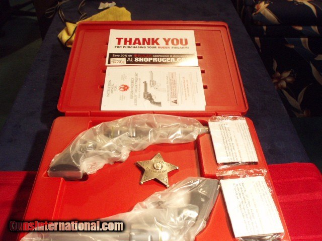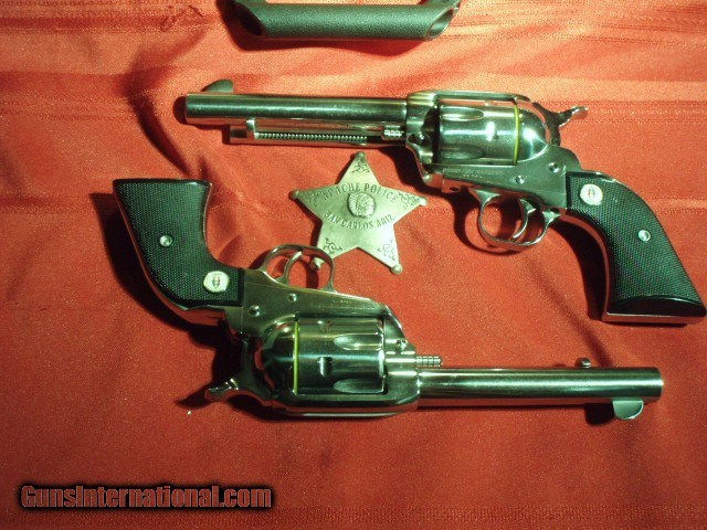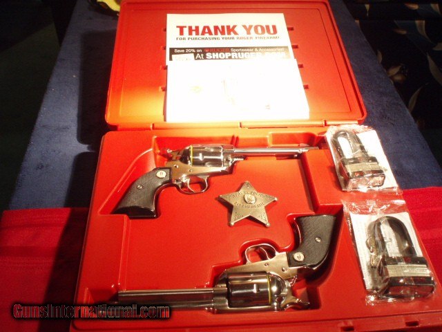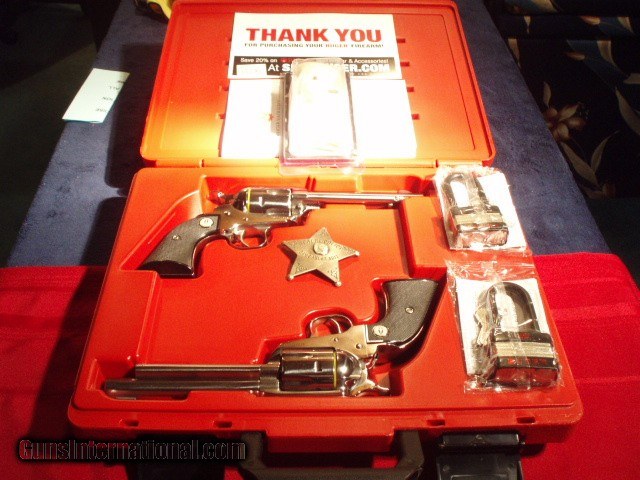 Description: PAIR OF SASS, NEW SET (2 REVOLVERS) OF RUGER NEW VAQUERO (SASS, COWBOY MODEL), 5 1/2" BARREL, BRIGHT STAINLESS, CONSECUTIVE SERIAL NUMBERS REVOLVERS, WITH MONTADO TURNED-DOWN HAMMERS & BLACK CHECKERED (SASS BUTTONED) GRIPPS. THEY ARE IN THEIR (RED) PROTECTIVE SHOW CASE & REALLY NICE & CLEAN (BRAND NEW ) WITH ALL ALL THE FACTORY SPEC PAPERS ETC. THEY ARE ALSO TUNED & WITH ACTION JOB FOR SMOOTHER THUMB ACTION HANDLING (FAST DRAW OR MOUNTED SHOOTING). SOLD Handgun Caliber: .45 Colt Manufacturer: RUGER Model: SASS #05134 Serial Number: SASS56297 & SASS56298 Caliber Info: 45LC Chambers: 45LC Ejectors: EJECTOR ROD Condition: New & Perfect Metal Condition: NEW & SPOTLESS Bore Condition: NEW Barrels: SINGLE Barrel Type: ROUND SMOOTH Action: SINGLE Triggers: COWBOY STYLE Manufacture Date: 2020 Case: 2 REVOLVER RED PROTECTIVE |