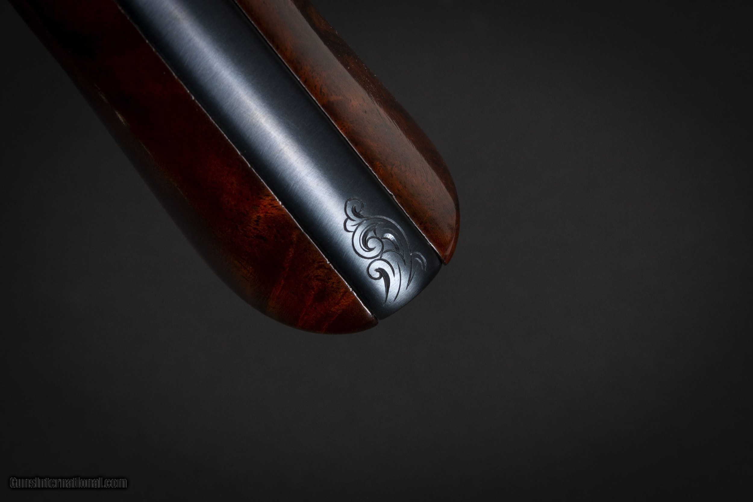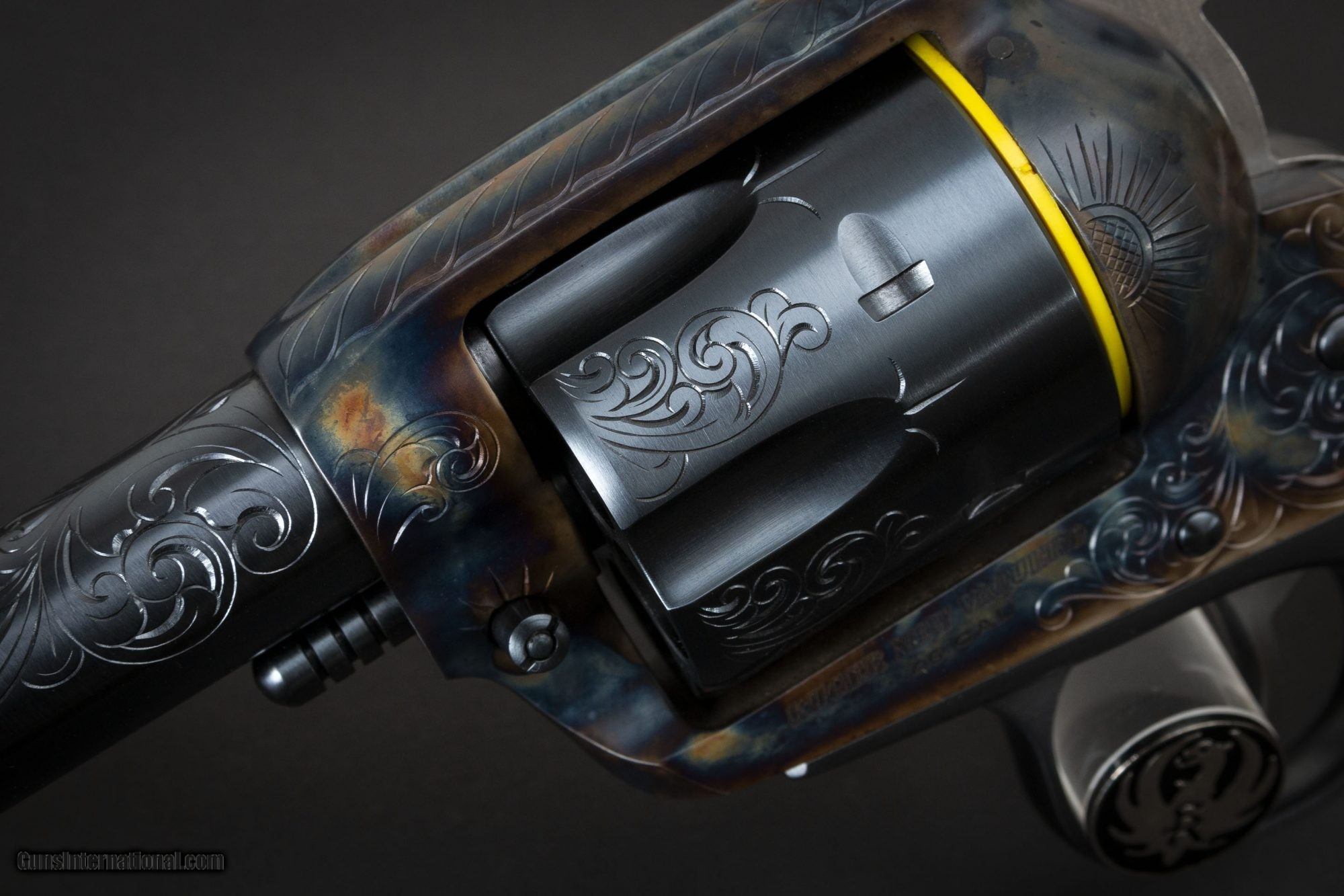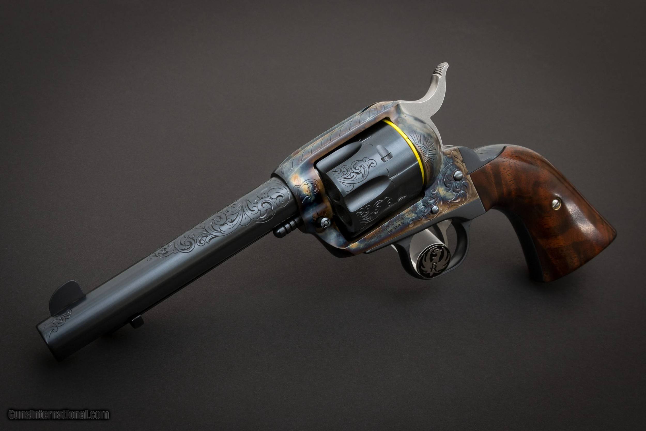 Description: Starting life as a factory-new Ruger Vaquero 5.5”, this example of the perennial favorite American revolver features signature Turnbull Restoration touches throughout. Engraving