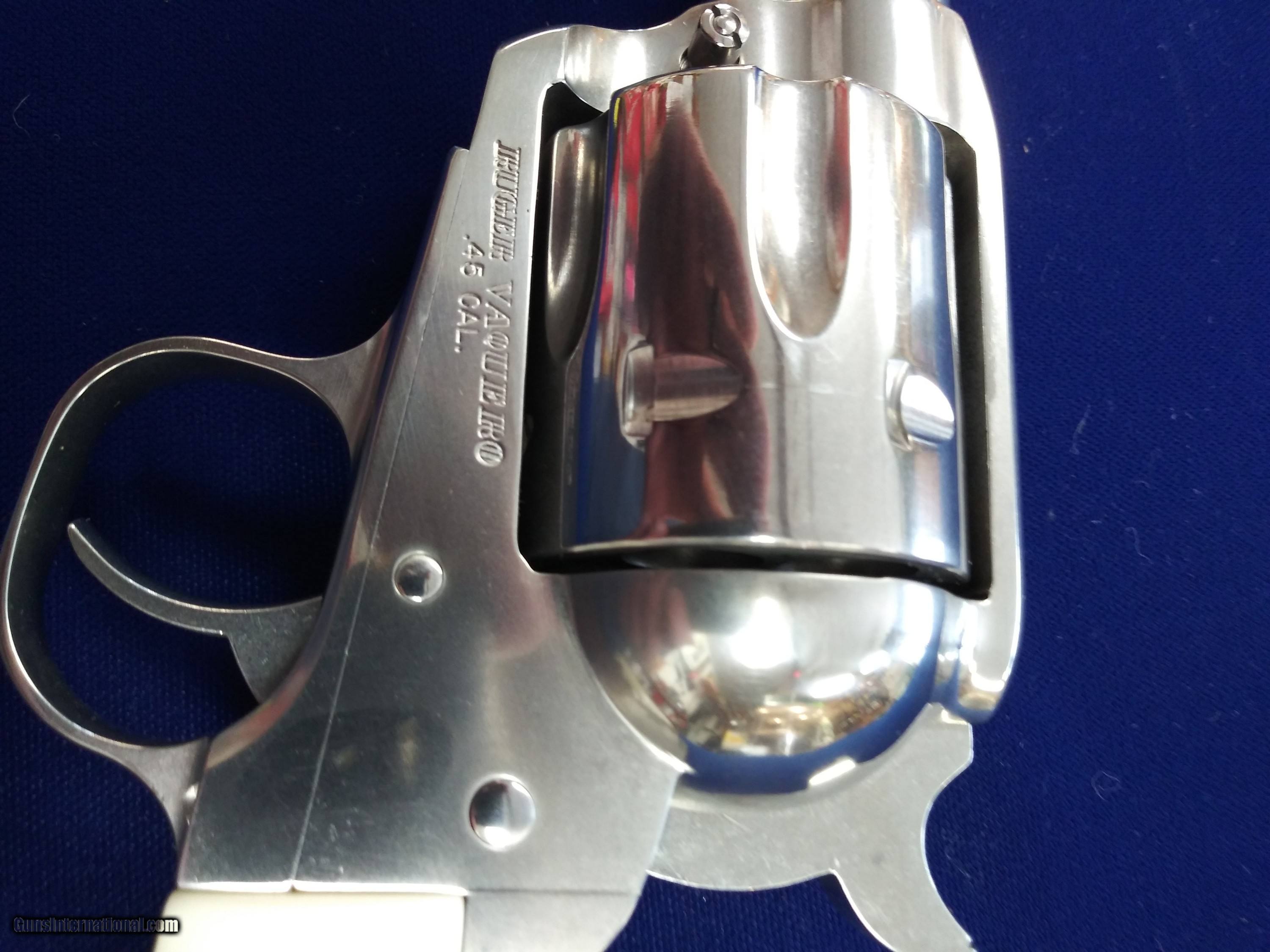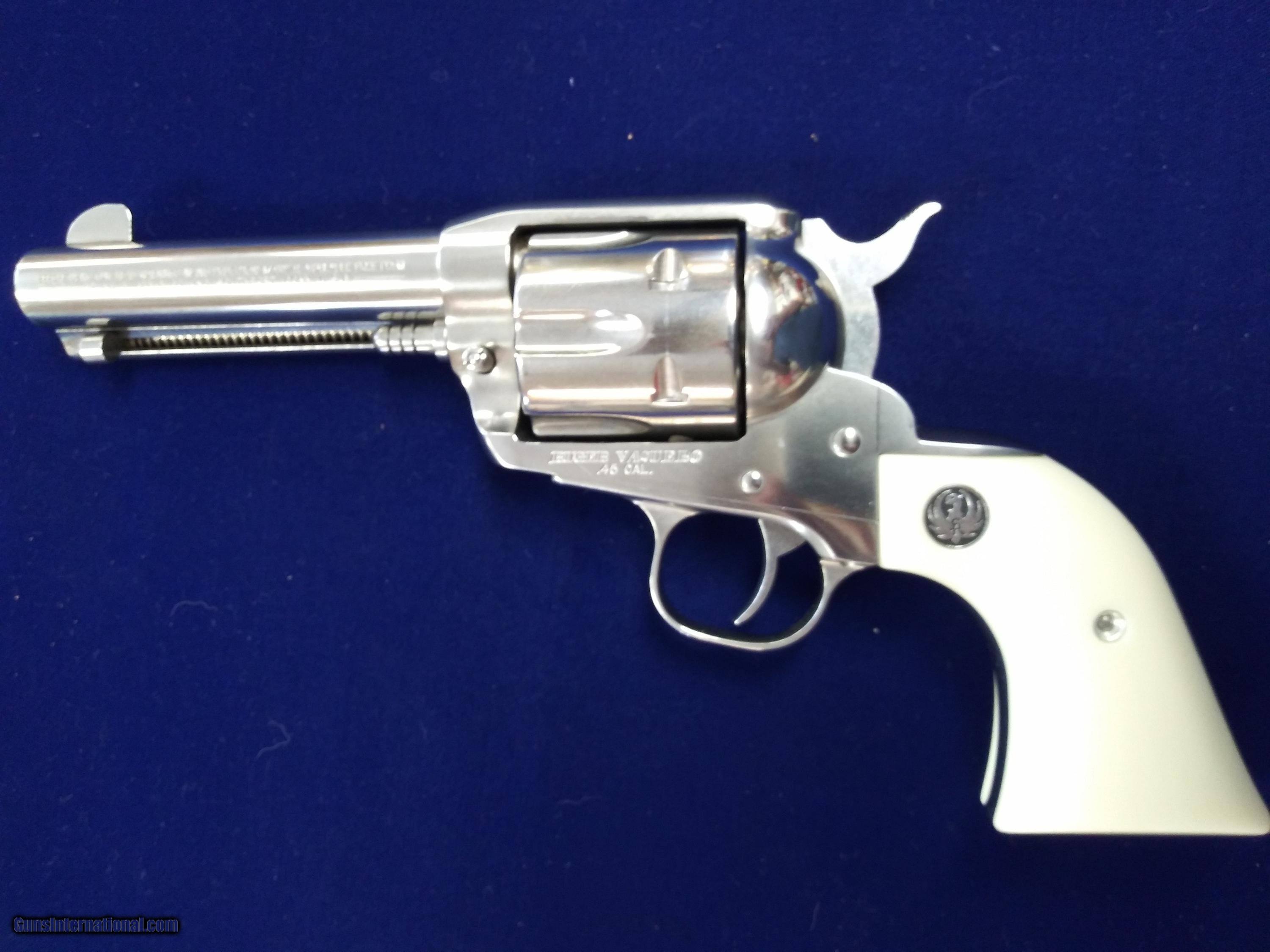 Description: Ruger Old Model Vaquero. 45 Colt caliber. 4 5/8 inch barrel. Stainless Steel. Simulated Ivory grips. Mfg 1996. Used very little, excellent condition, as seen in pictures. No box, No manual. Just the gun. $725 includes shipping to FFL Only. SOLD Manufacturer: RUGER Model: VAQUERO Barrel Length: 4 5/8 Caliber Info: 45 LONG COLT |