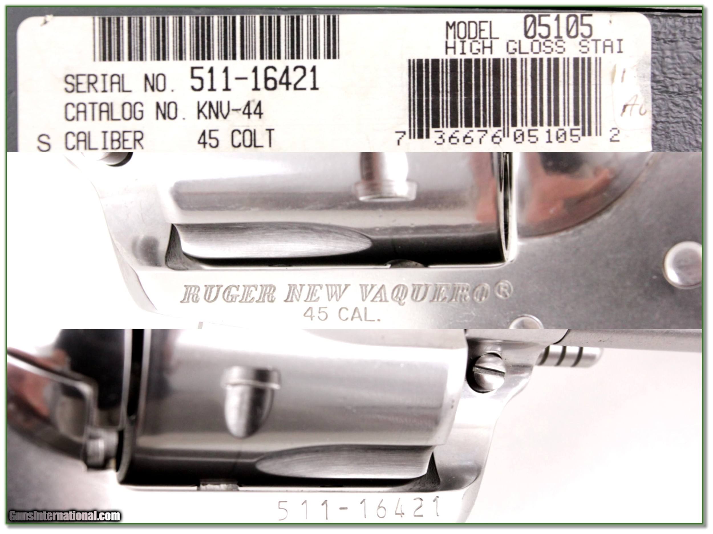 Description: This is an excellent condition Stainless Ruger Vaquero New Model 45 Colt. It has a 4.5in barrel and comes as seen in original case with papers. I am selling this one on consignment and as such lay-a-way can’t be used. It does of course have the standard 3-day inspection. Shipping and insurance is $39. Please email me with any questions or larger pictures. (Consign your quality firearms with Shooting Investments for only 12%! Let me know if you have any you would like to sell!) 19-1020 Payment: Payment is by Money Order, Cashiers Check or Personal Check. I can now also accept MasterCard and Visa with a 3% convenience fee. PayPal can be used for some items but never firearms. Please let us know if you would like to pay via PayPal. Shipping: The shipping charge will be listed in each description. It is $39 for most long guns and $29 for most handguns. Some heavy guns or those insured for over $2000 will be higher. Shipments to Alaska and Hawaii are higher because air shipment is required. Most firearms are shipped on Tuesday and Thursday and usually in 5 days of receipt of payment. We package all shipments carefully and insure them. For long guns you can purchase a new Plano case for $19. They now cost us $22 when buying 100 at a time. Optics are shipped Priority Mail and most other non-firearm shipments are shipped First Class. Returns: Our return policy is simple. If for any reason you are not pleased with your purchase, you may return your item for a full refund of purchase price. Ammunition cannot be returned. It is important to us that you are happy. Guns cannot be fired or dissembled before returning them and they must be returned in the same condition as received. Notification of a return must occur with-in 3 days of receipt at your dealer. Shipping, convenience and dealer fees are not refundable and are the responsibility of the buyer. Lay-a-way: If needed, we offer a 60 day lay-a-way option on most firearms. It is 1/3 now, 1/3 in 30 days and 1/3 in 60 days. Lay-a-way firearm sales are final and if not completed the first payment cannot be returned. Consigning your firearms with Shooting Investments: We will help you get top dollar for your firearms. While most local guns shops charge 20% or more, our fee is only 12% with a minimum of $75. At your local gun shop it might take months to sell. Selling on-line provides instant access to thousands of interested buyers. You won’t find any other on-line dealer willing to sell your firearms for only 12% or listing every gun on 3 separate s. Selling through an House typically costs the seller 15% and the buyer an addition 15% (so 30%) and you have to wait several months to sell and longer to receive funds. If properly priced, we will sell your firearms in a few weeks. Send us an email or give us a call and we’ll explain how easy it is for you to get top dollar. Trading: Trading for use is really just buying your gun to re-sell. If you have a gun you want to trade, please email a picture and we will let you know what we can give or it. You will always get more if we sell it for you on consignment. Help for California Buyers: We are happy to ship to California. It is the buyer’s responsibility to make sure any item you buy is legal in your state. We are also happy to help with your purchase of a firearm from someone other than us. If you see a gun you would like to buy but the seller can’t or won’t ship to California they can ship to use and we’ll then ship it to your California dealer. The cost for this service is only $30 + shipping. Let us know if we can help! SOLD |