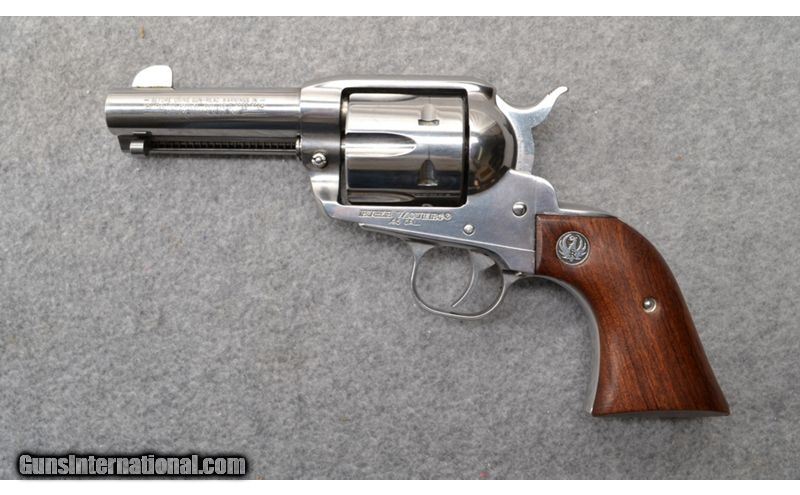 Description: Ruger Vaquero .45 Long Colt with 3.75" stainless steel barrel with front blade sight. Bore is bright and rifling is sharp. Stainless steel frame, cylinder, and barrel are in excellent shape with only some light handling marks noted. Factory wood grips have a few light handling marks. Comes with factory case. .45 Colt SOLD Metal Condition: "Stainless frame, cylinder, and barrel show some very light handling marks. Wood Condition: Factory wood grips show a few handling marks. Bore Condition: Bright bore with sharp rifling. Barrels: 3.75" stainless steel barrel. Triggers: Single action trigger. Weight: 2 lb 8 oz Sights: Factory front blade with grooved receiver. Item Location: Mitchell, SD |