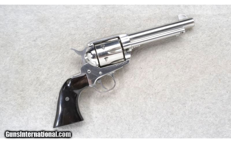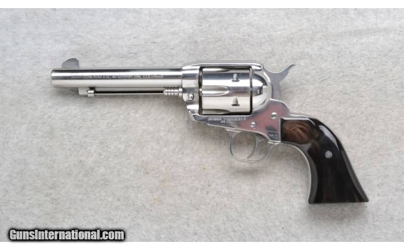 Description: This Ruger Model Vaquero is a 6 shot stainless steel single action revolver in .45 Long Colt Cal. It has a 5.5 inch barrel. A blade front sight and an integral notch rear sight. The grip is a smooth hard brown plastic. .45 Long Colt SOLD Chambers: 6 shot. Metal Condition: Very good. Has some very minor handling/use marks. Bore Condition: Excellent. Barrels: 5.5 inch. Triggers: Single Action. Weight: 42 oz. Sights: Blade front. Integral notch rear. Item Location: Richfield, WI |