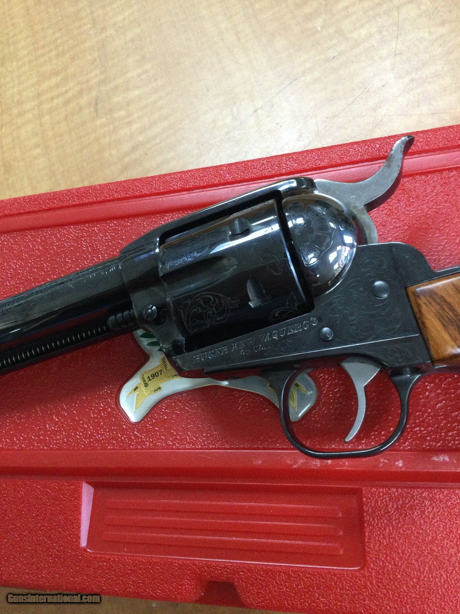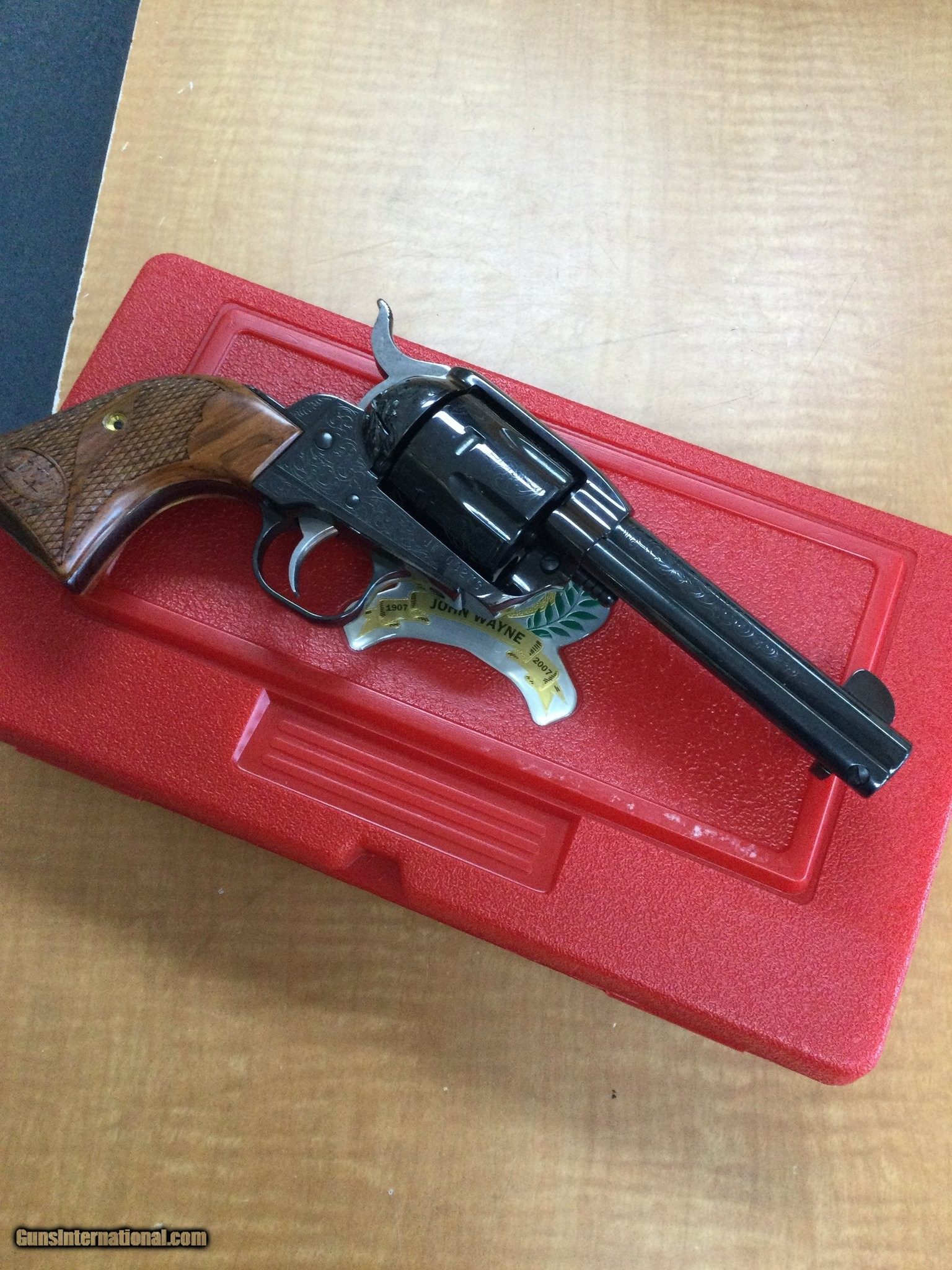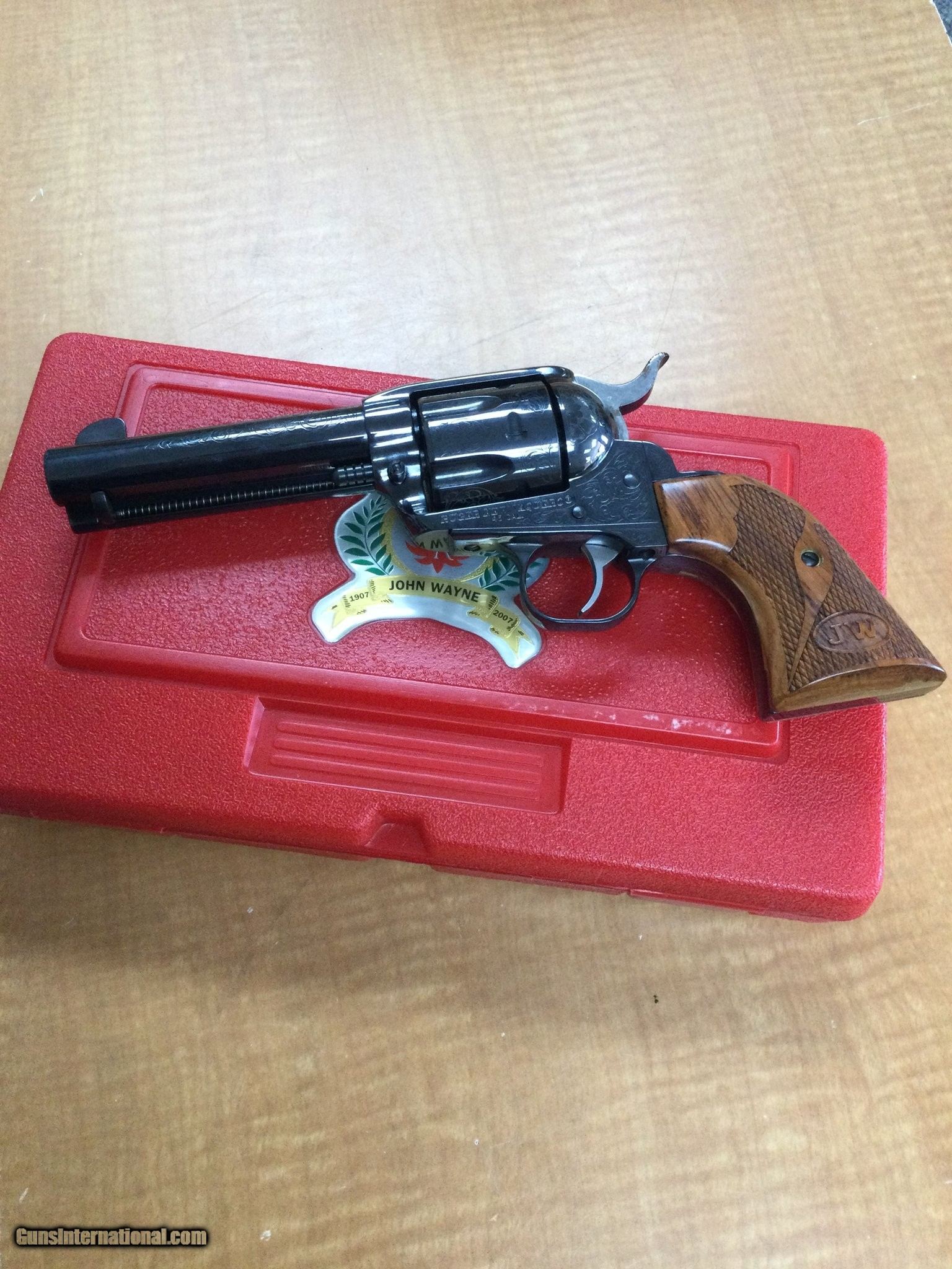 Description: Guns Listing ID: 554801 Limited edition Ruger Vaquero John Wayne commervative never fired and in excellent comes with everything pictured a serial number is Jw00273 chambered in 45lc holds 6 rounds. SOLD Manufacturer: RUGER Model: vaquero John Wayne Caliber Info: .45 LC Condition: Used - Non-Certified Barrels: 4 BARREL Action: REVOLVER Finish: black blued engraved |