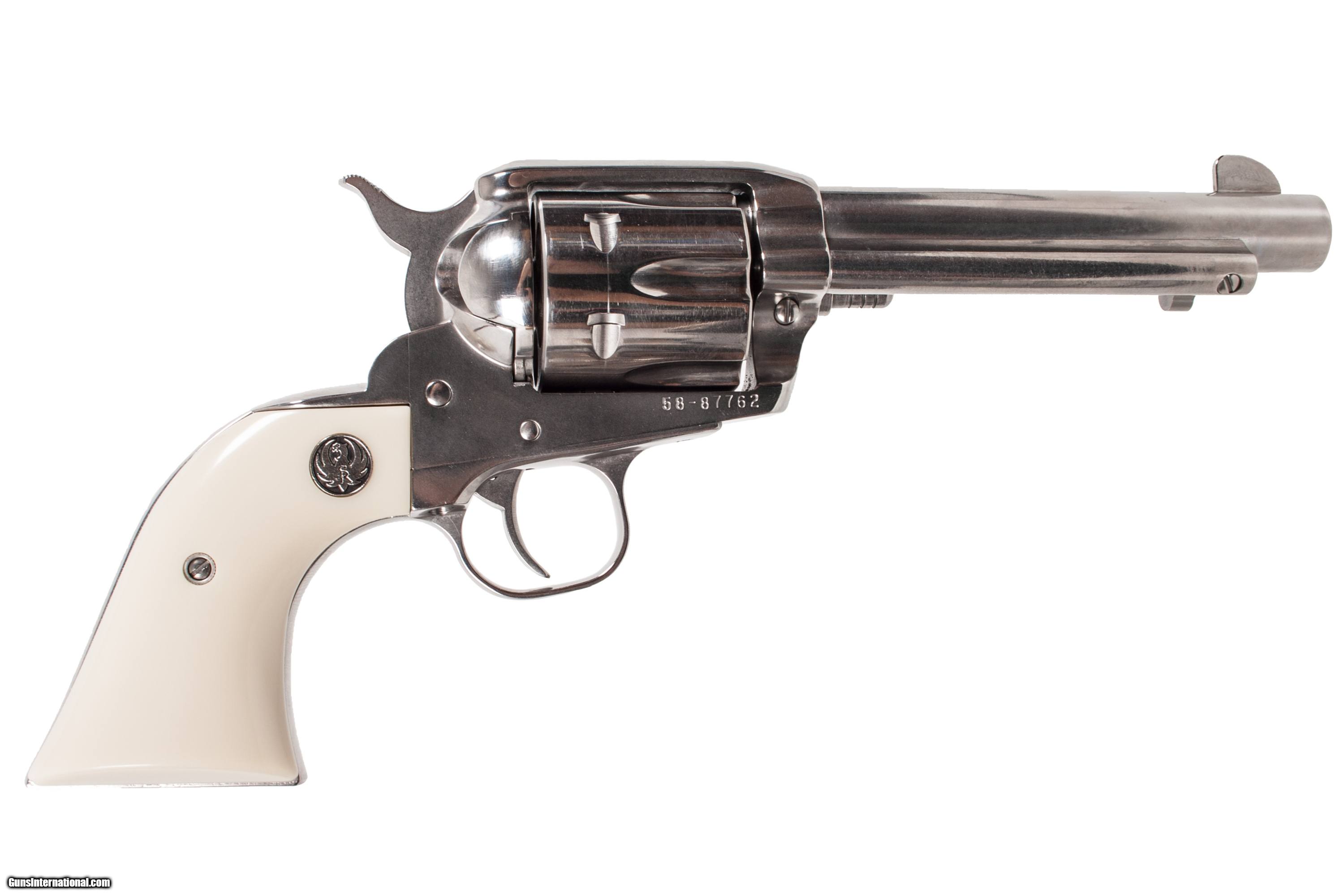 Description: Ruger Vaquero Stainless Steel chambered in 45 LC with a 5.5 inch barrel and a case. This gun is in excellent condition and is covered by Dury's Lifetime Warranty.