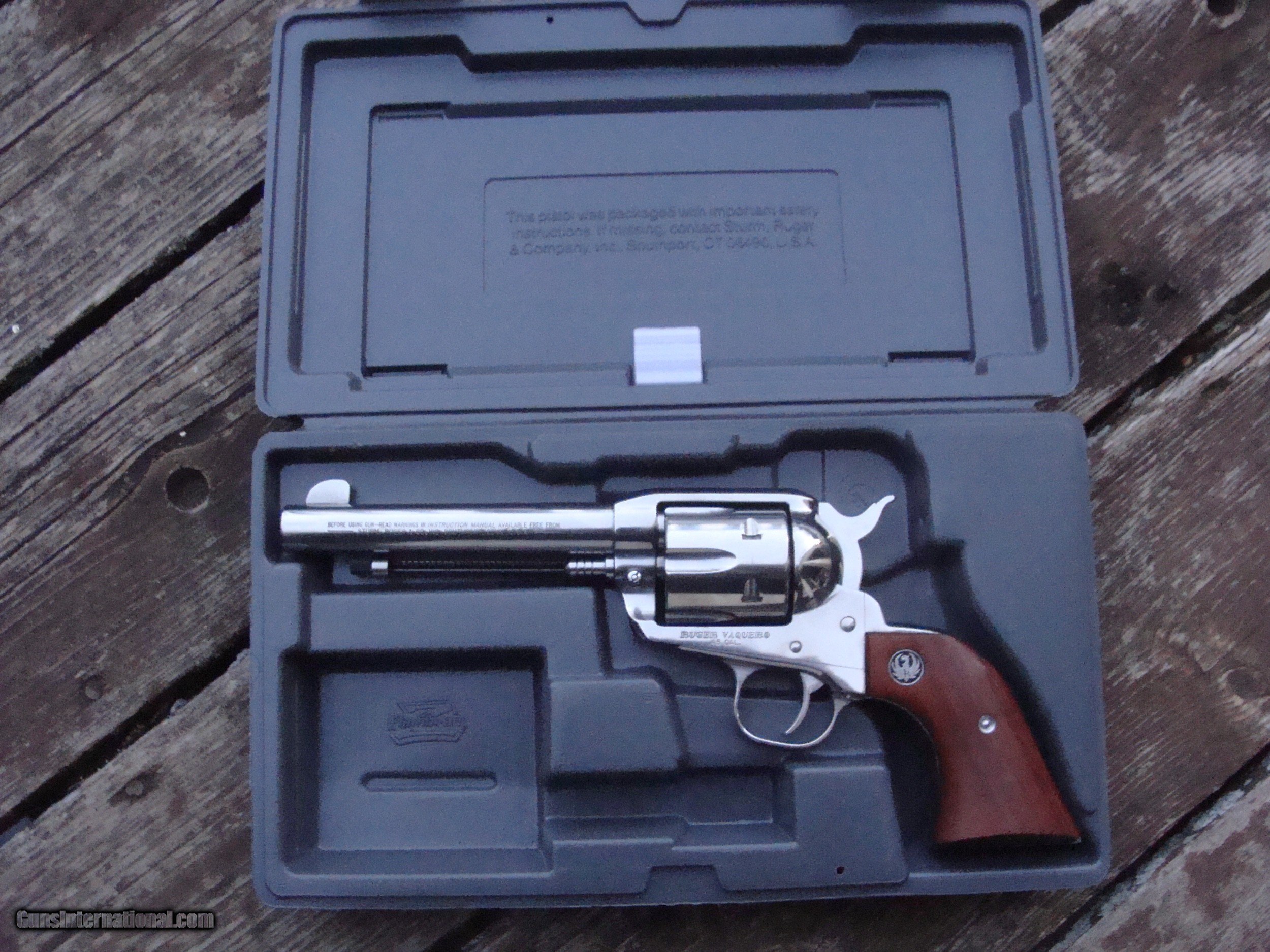 Description: Nice Bright Stainless Vaquero In Box VG to EX Cond. 45 Long Colt Shipping is 28.00 SALE PENDING VICKI L. 3/14/22 PLEASE READ EVERYTHING BELOW IN BOLD: IF IT DOES NOT SAY..."SALE PENDING OR UNDER DEPOSIT OR ON HOLD"..IT IS AVAILABLE. WE DO NOT REPLY TO INQUIRIES THAT SAY "INTERESTED IN THIS GUN" OR "IS IT AVAILABLE" IF YOU WOULD LIKE TO BUY THIS OR ANY OF OUR GUNS WE SUGGEST YOU PHONE US; WE ARE OFTEN AVAIALABLE LONG HOURS. IF YOU ARE INTERSTED IN A GUN THAT IS UNDER DEPOSIT AND WOULD LIKE TO BE NOTIFIED IF A SIMILAR GUN COMES IN DROP US A LINE AND WE WILL MAKE EFFORTS TO CONTACT YOU WHEN ONE DOES COME IN. WE HAVE OVER 2000 SALES ON ALL SITES WITH AN A+ RATING ON ALL WE ALSO KEEP AN INVENTORY OF OLDER PERIOD CORRECT SCOPES; CALL WITH NEEDS WE MOSTLY PICK VERY CLEAN AND LIGHLTY USED GUNS. WE ARE HAPPY TO TAKE CONSIGNMENT GUNS AND COLLECTIONS OR WILL BUY YOURS OUTRIGHT. WE SOMETIMES ARE EMPLOYED FOR ESTATE PURPOSES AND VALUATIONS. CT RESIDENTS MUST CONTACT US TO UNDERSTAND OUR IN STATE TRANSFER POLICIES. PAYMENT USPS MONEY ORDER ONLY AT THIS TIME. ( WE CAN TAKE A DEPOSIT WITH A CARD BUT THE GUN MUST BE PAID WITH A USPS MONEY ORDER) IT IS THE BUYERS RESPONSIBILITY TO GET US A COPY OF YOUR RECEIVING FFL'S LIC AND A COPY OF YOUR PHOTO ID BEFORE THE GUN SHIPS YOU MUST CALL YOUR FFL.WE DO NOT CALL FOR YOU. LAYAWAY PURCHASES NOT COMPLETED OR ANY RETURNED ITEM UNLESS NOT AS DESCRIBED OR DAMAGED ARE SUBJECT TO A 10% RELISTING/RESTOCKING FEE AND MUST BE RETURNED WITH NO NEW MARKS OR SCRATCHES, SENT BACK INSURED, PRIORITY SIGNATURE REQUIRED. ALL INFORMATION CONTAINED HEREIN IS BELIEVED TO BE ACCURATE BUT IS NOT GUARANTEED. WITH ANY OLDER OR USED GUN IT SHOULD BE EXAMINED BY A GUNSMITH OR COMPETENT EXPERT PRIOR TO USE) SOLD |