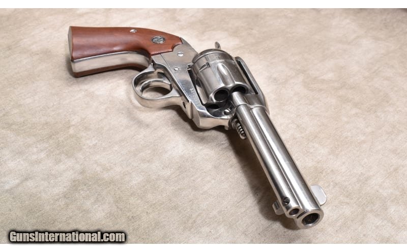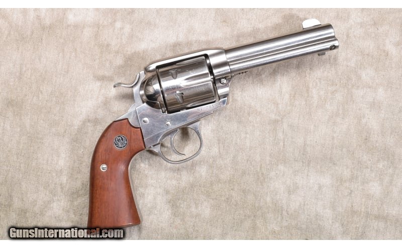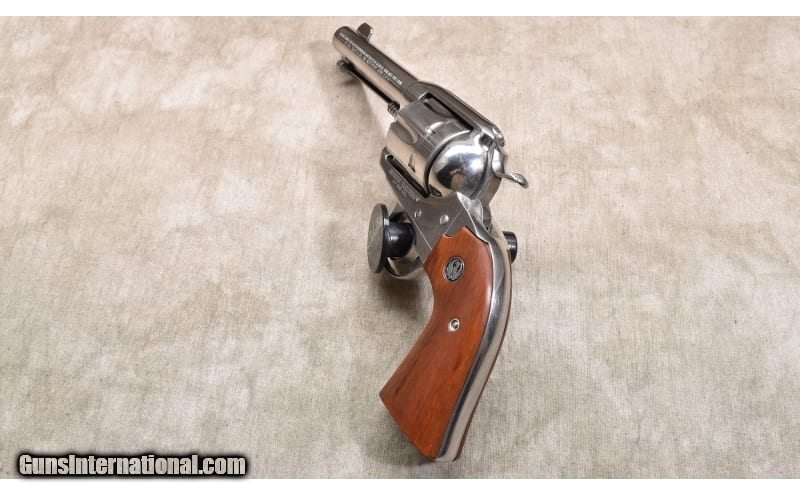 Description: Very nice nickel-plated Single action revolver featuring Bisley style grips. The S/N 57-281xx puts the manufacture date in 2000. .44 Magnum SOLD Chambers: 6 rounds Metal Condition: "Very good.There are a few fine handling marks, and powder residue on the face of the cylinder. Wood Condition: Excellent. Bore Condition: Shiny and bright with good rifling. Barrels: 4-3/4 inch Triggers: Factory single action. Butt Pad: Smooth walnut with Ruger medallions. Weight: 44 oz. Sights: Blade and top-strap notch. Item Location: Rogers |