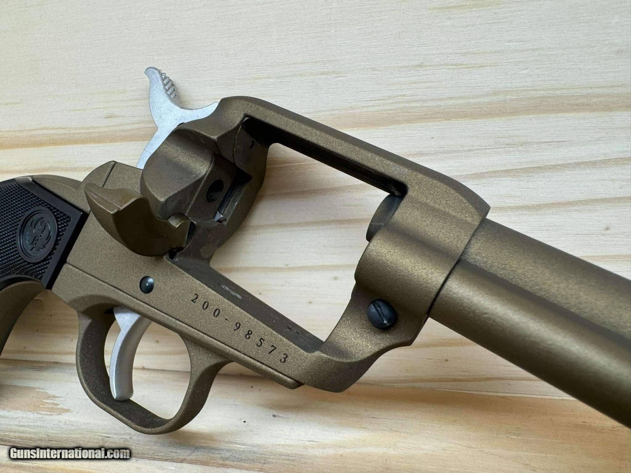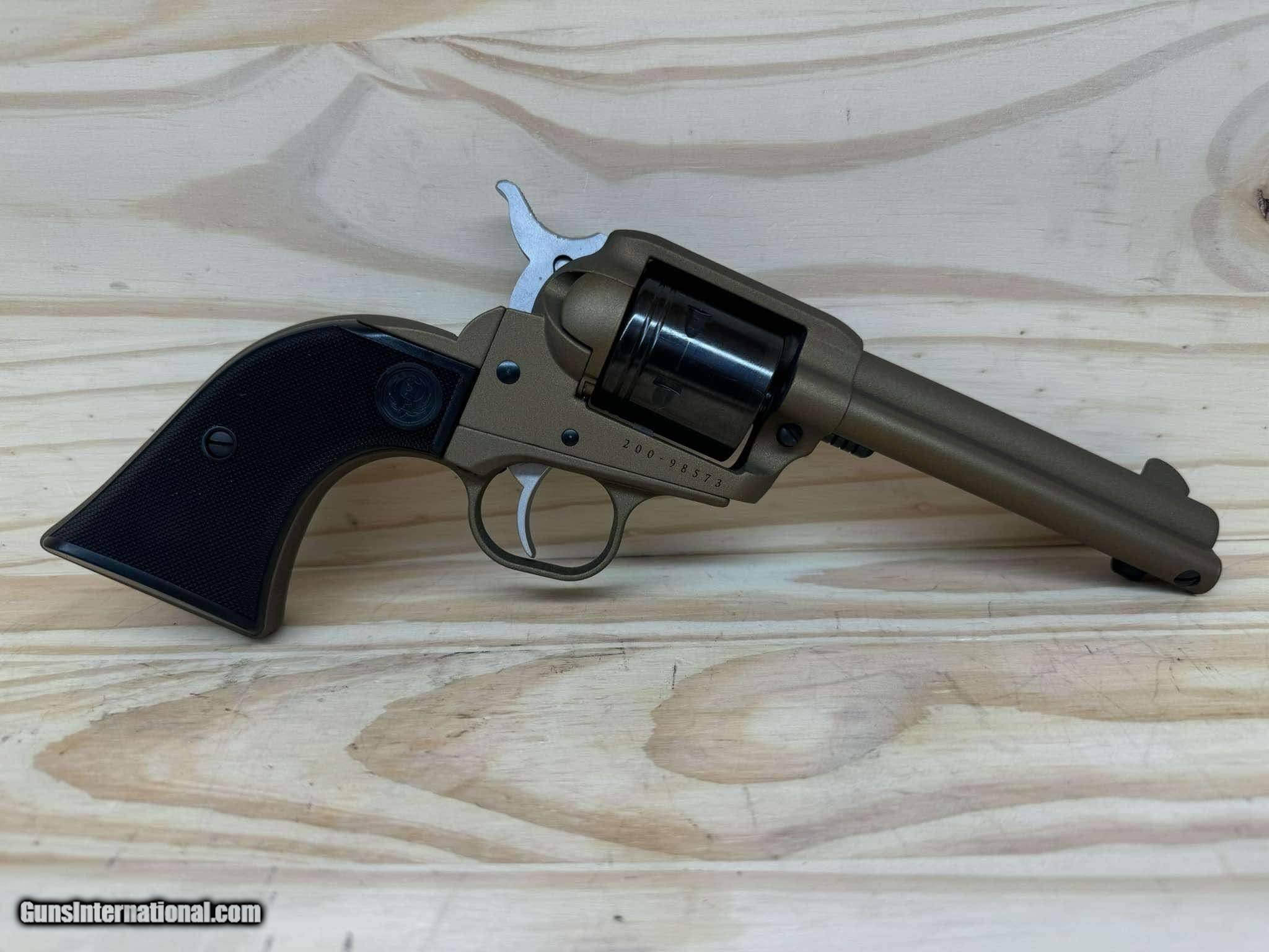 Description: Guns Listing ID: 459944 RUGER WRANGLER Burnt Bronze / Black - .22 LR - 6 ROUNDS - 4.5 \" BARREL Blade front and integral notch rear sights. Chambered for affordable .22 LR ammunition. Transfer bar mechanism and loading gate interlock provide an unparalleled measure of security against accidental discharge. Cold hammer-forged barrel results in ultra-precise rifling that provides exceptional accuracy and longevity. Cerakote® finish provides rugged reliability in all environments. Checkered synthetic grips on a Single-Six® pattern grip frame. Manufacturer: RUGER Model: WRANGLER Caliber: .22LR Magazines: N/A Sights: INTREGAL - REAR / FRONT - BLADE Weight: 30OZ Overall Length: 10.25\" Barrel Length: 4.62\ SOLD Manufacturer: RUGER Model: WRANGLER Condition: Used - Non-Certified Barrels: 4.62 Gauge Info: .22 LR Finish: burnt bronze/black |