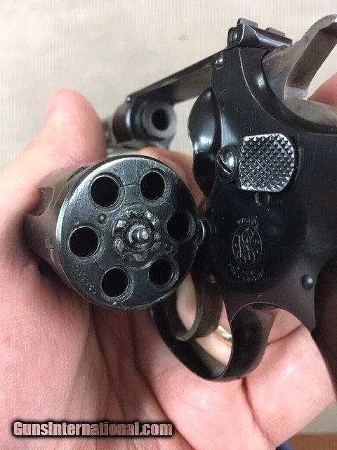 Description: REDUCED - A very nice S&W Model 22/32 Target Model with the desireable early checkering pattern on the grips, and in excellent original condition with a perfect bore and recessed chambers. Revolver has 95% or better original pre war blue and most all of the case color on the hammer and trigger. Finish on the grips is excellent also. Serial range is 52985x. Don't we wish they made them this nice today! SOLD |