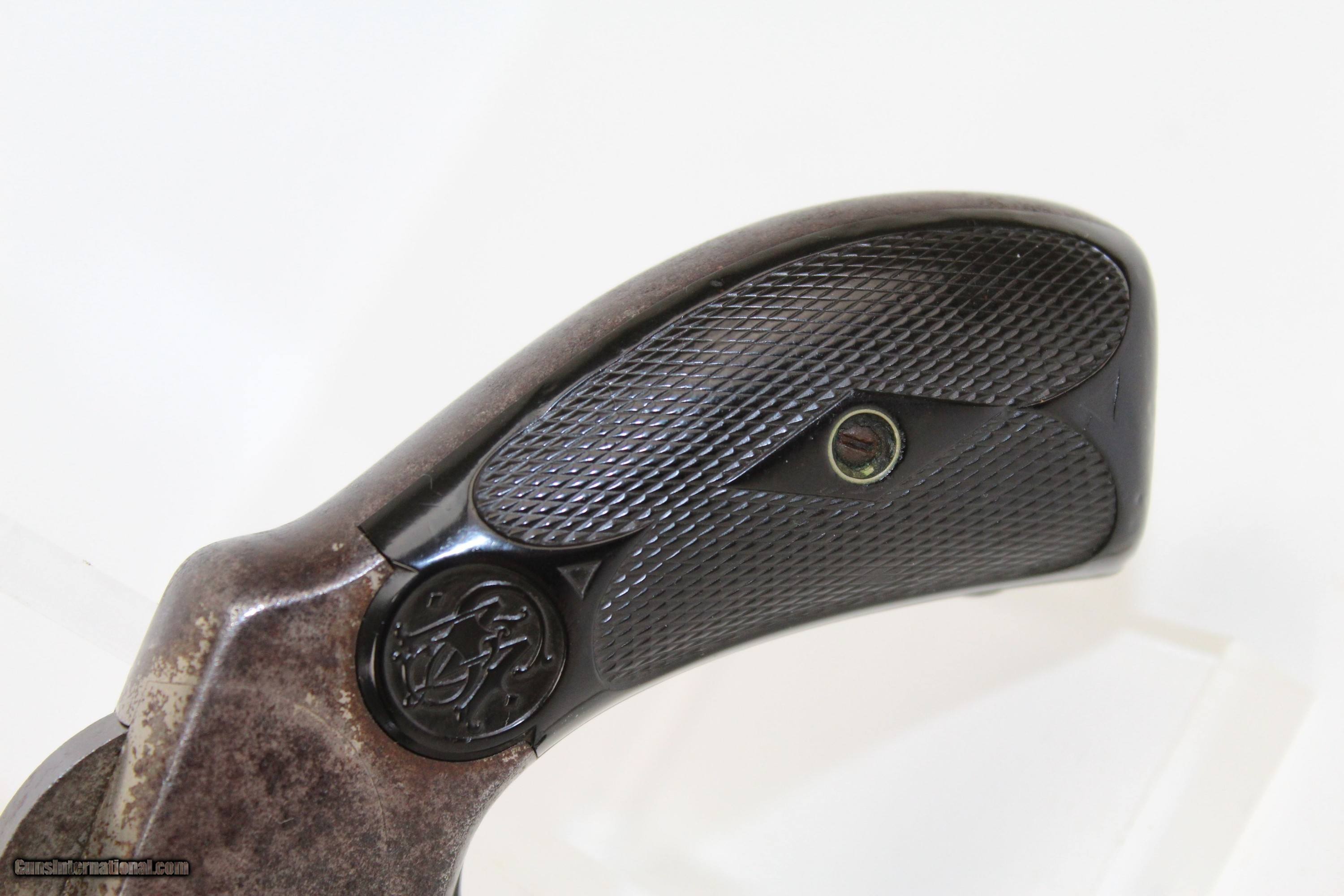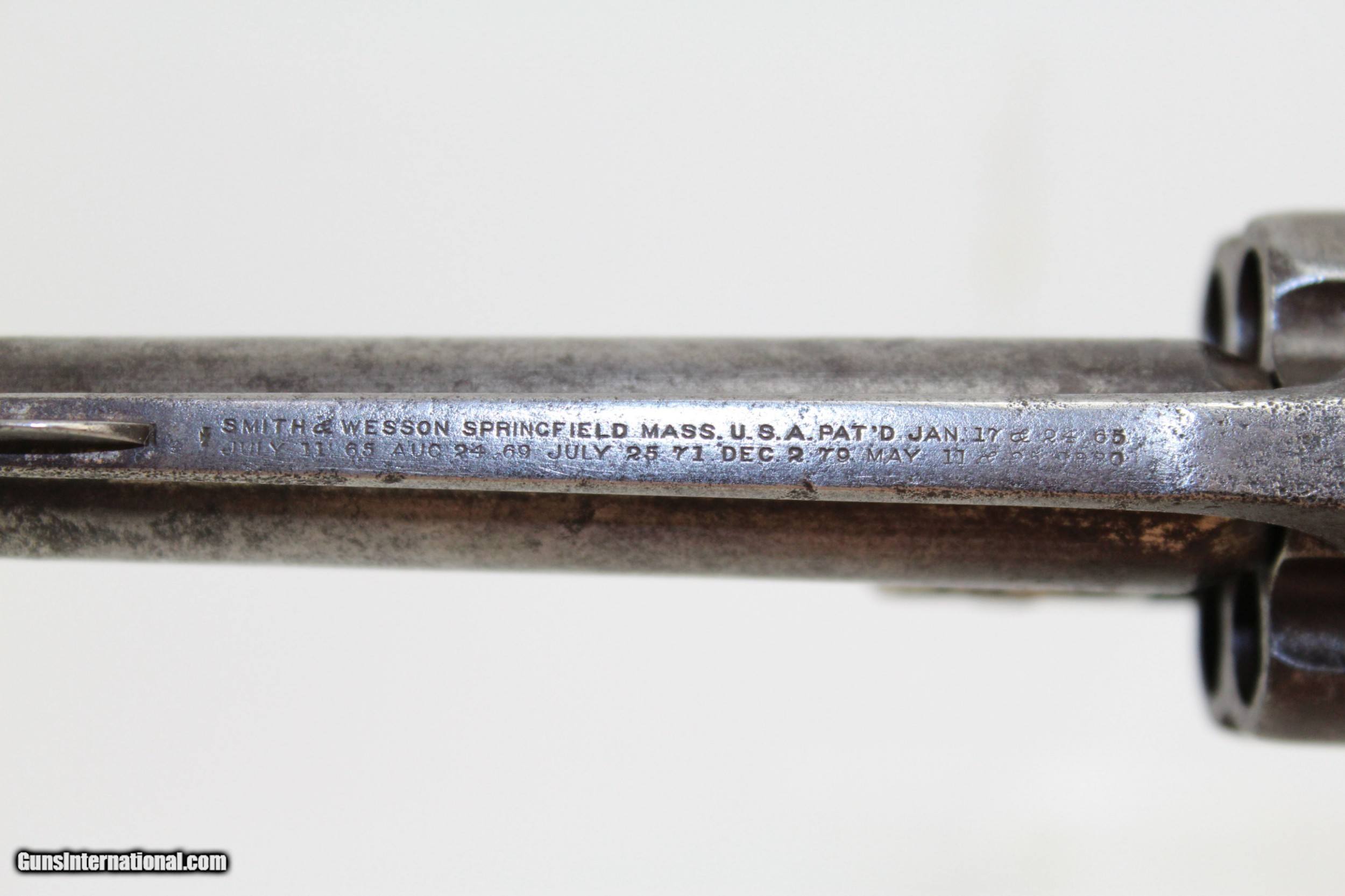 Description: Antique SMITH & WESSON First Model DA Revolver .44 Russian Made Circa 1881 Here we present an antique Smith & Wesson First Model .44 Double Action Revolver, made circa 1881 in Springfield, Massachusetts. This was an excellent offering from Smith & Wesson that competed well with Colt’s 1877 “Lightning” and “Thunderer” as well as their 1878 “Frontier”, all double action revolvers. There is certainly an argument to be made that S&W bested the Colt offerings in design and longevity, though Colt certainly made more sales. Infamous names such as John Wesley Hardin, notorious outlaw, and Belle Starr, the Bandit Queen of Indian Territory, were two such notable users of the type. The top of the barrel is marked “SMITH & WESSON SPRINGFIELD, MASS. U.S.A. PAT’D JAN. 17&24, ‘65/JULY 11, ‘65AUG. 24, ’69, JULY 25, ’71, DEC. 2, ’79, MAY 11 & 25, 1880”. The overall condition is good. The metal surfaces are dark with age with traces of the original nickel finish remaining. The markings are clear and legible. The trademarked hard rubber grips are in great shape. The bore is in very good condition, clean with nice rifling. The action on this revolver is excellent. Here is one that looks like it has been there and done that and works as well as ever! Own the original! This is a legitimate antique and not a reproduction. Barrel is 4 inches. Caliber: .44 S&W Russian Overall condition as seen in photos. Very Fast. Very Safe. FREE SHIPPING WORLDWIDE. Delivered directly to your door by express mail! Guaranteed AUTHENTIC & Includes CERTIFICATE OF AUTHENTICITY. ancestryguns $1450 #7321 SOLD Antique: Yes |