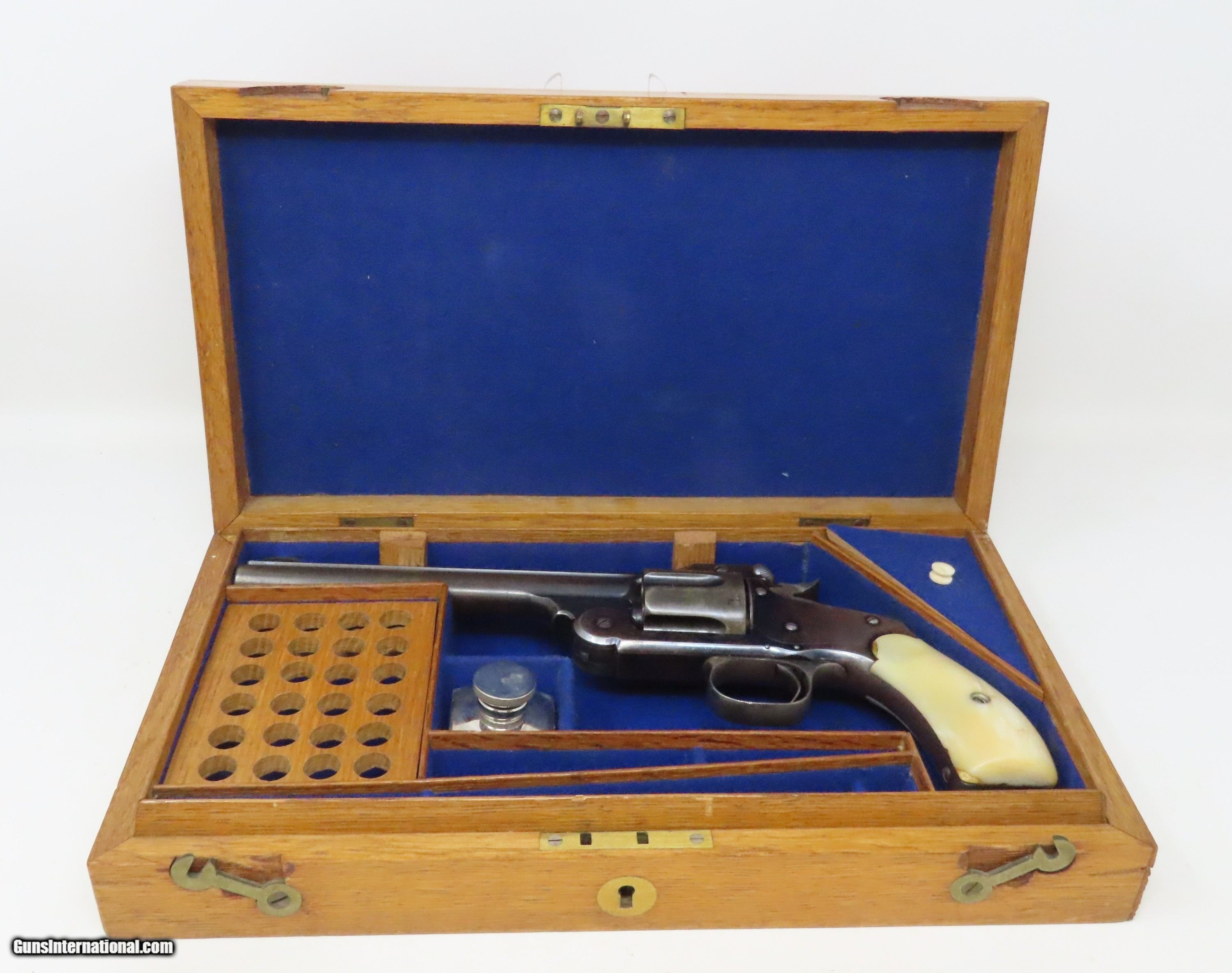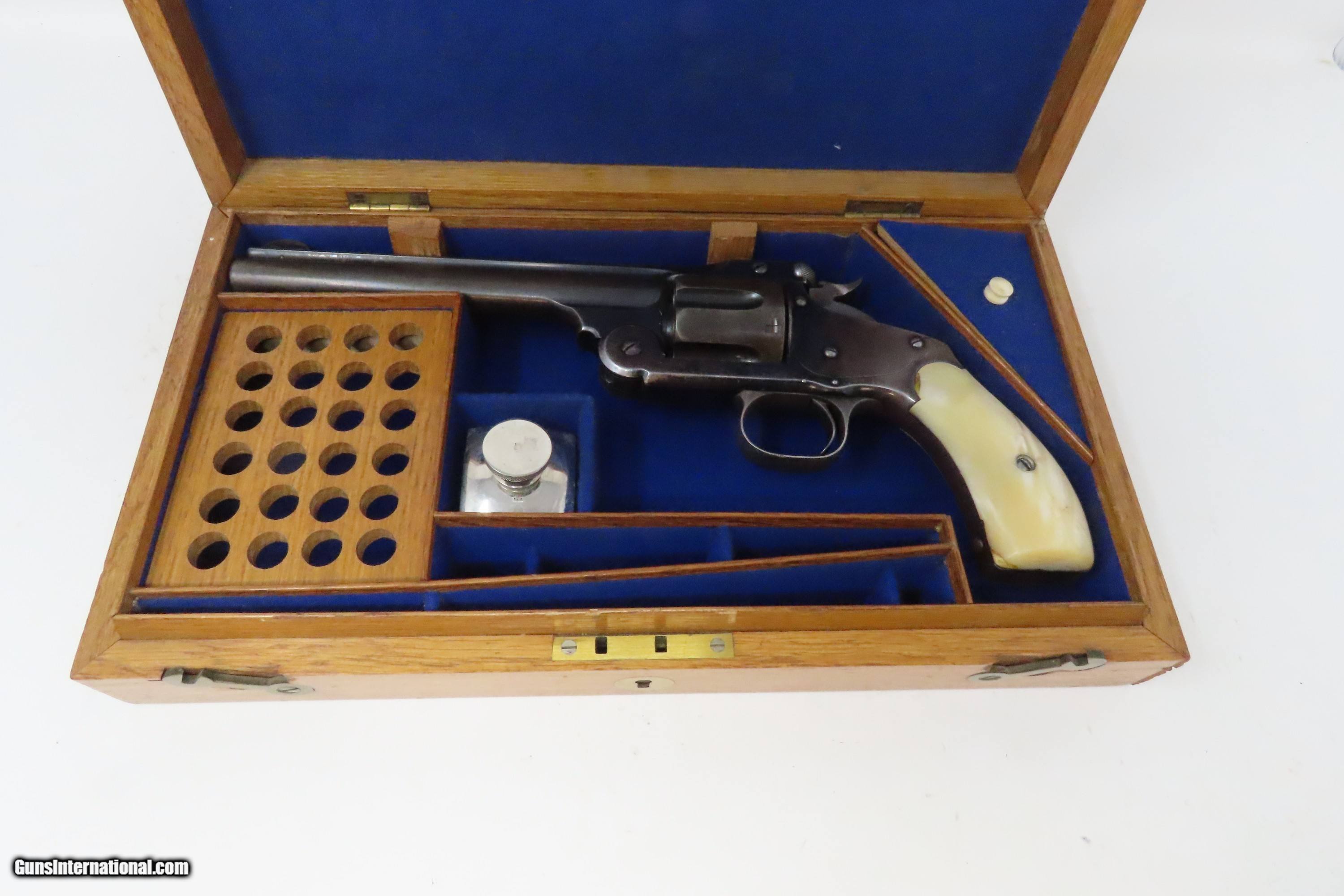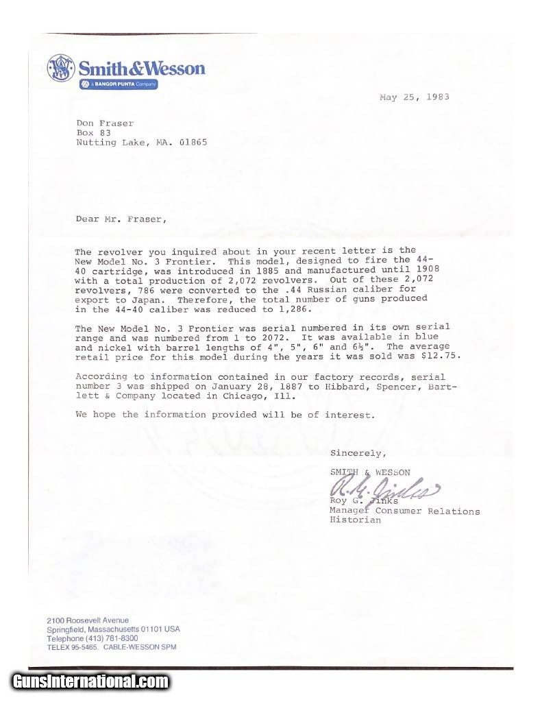 Description: SERIAL No. 3 Antique SMITH & WESSON Single Action FRONTIER .44-40 WCF S&W With Provenance from the Collection of Jim Supica Here we present an antique Lettered Serial Number “3” Smith & Wesson New Model No. 3 Frontier Single Action Revolver in .44-40. This revolver comes from the collection of Jim Supica, the renowned firearms expert who has specialized in Smith & Wessons as well as serial number ones. Per the 1983 letter by S&W historian Roy G. Jinks, this revolver was shipped 28 January 1887 to large Chicago hardware dealer Hibbard, Spencer, Bartlett & Co., a major supply hub that was on the edge of the Western Frontier at the time. The letter explains that out of 2,072 revolvers so chambered, 786 were rechambered for Japan, thus leaving the number of originally .44-40 chambered guns at 1,286. The overall condition is fine. Original blue finish and case colors. The action is excellent. The bore is bright with sharp rifling. The mother of pearl grips are in good condition overall with a few minor chips. The numbers match: no. 3! The oaken case fits nicely and is of the style that English handguns, specifically Colts typically came in from London retailers in the late-19th Century. The case is near-fine as it does show some use and wear. Both of the letters are on Smith & Wesson letterhead with the 1983 letter showing the company watermark and the 2015 letter from Jinks to Supica is handwritten and wet signed. When else might you get the opportunity to own a single digit Smith & Wesson in a rare chambering that was once in the collection of Jim Supica? Own the original! This is a legitimate antique and not a reproduction. Barrel is 6-1/2 inches. Caliber: .44-40 WCF (Winchester Center Fire) Overall condition as seen in photos. Very Fast. Very Safe. FREE SHIPPING WORLDWIDE. Delivered directly to your door by express mail! Guaranteed AUTHENTIC & Includes CERTIFICATE OF AUTHENTICITY. ancestryguns $8400 #230150 SOLD Antique: Yes |