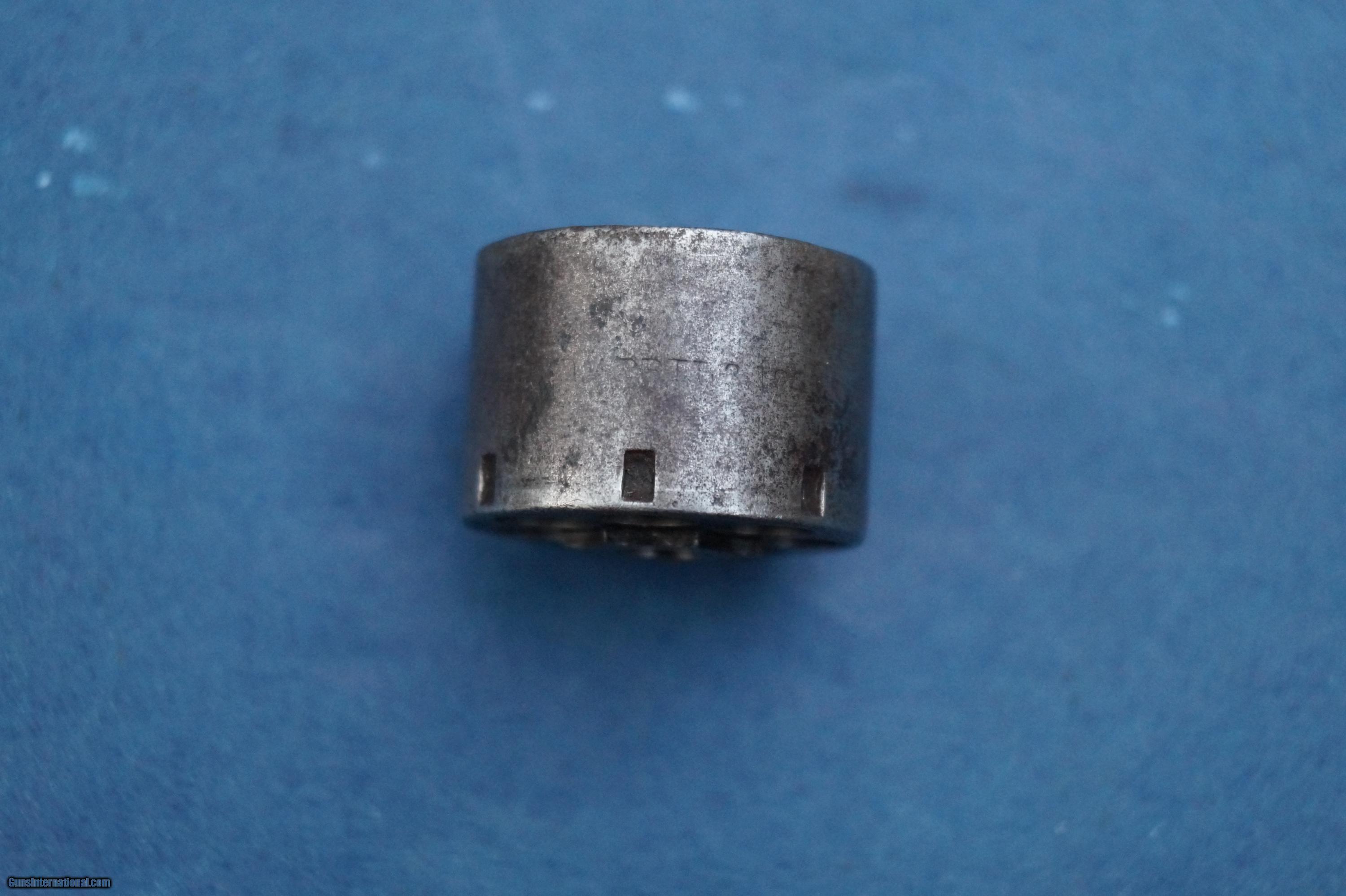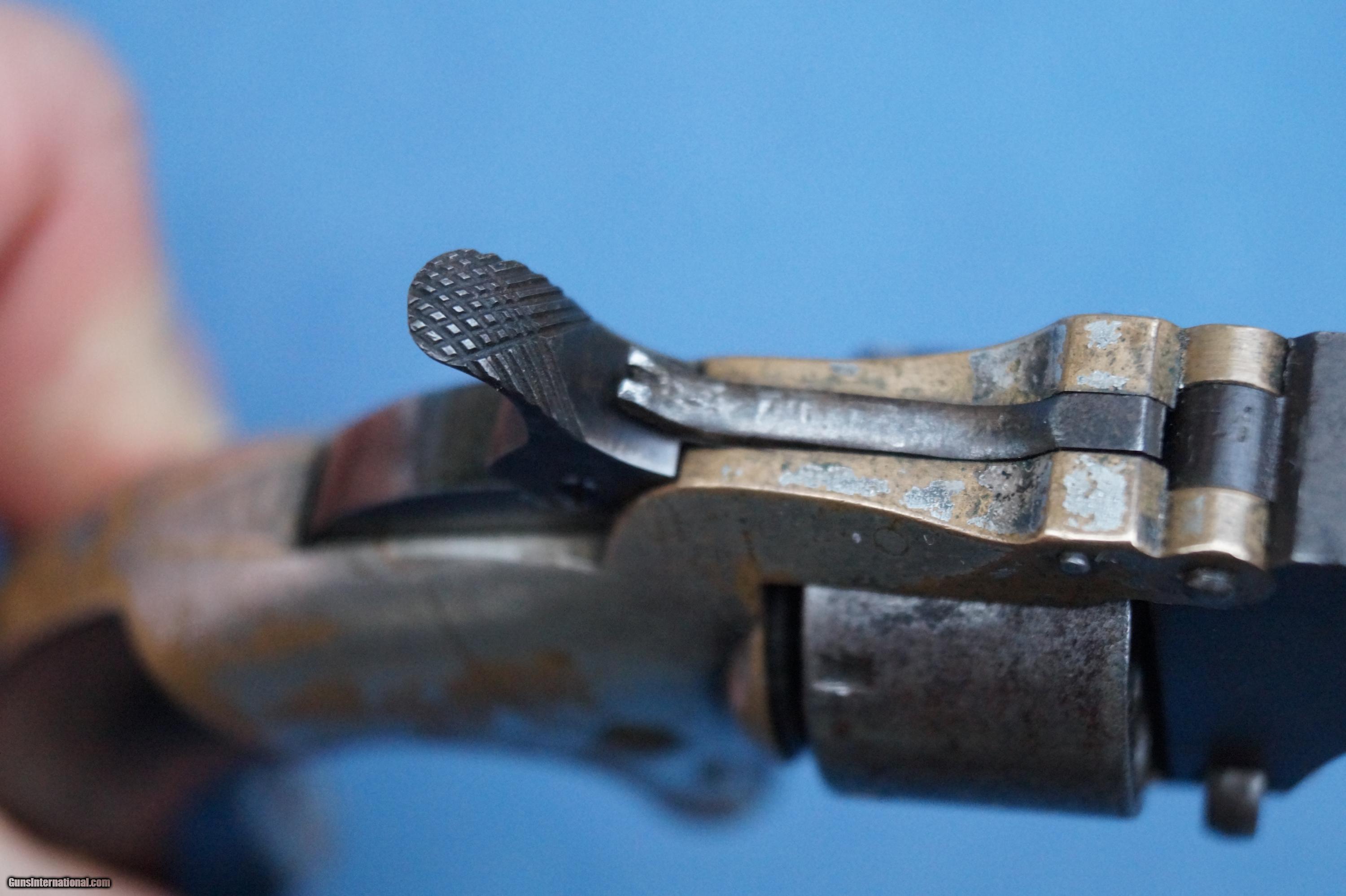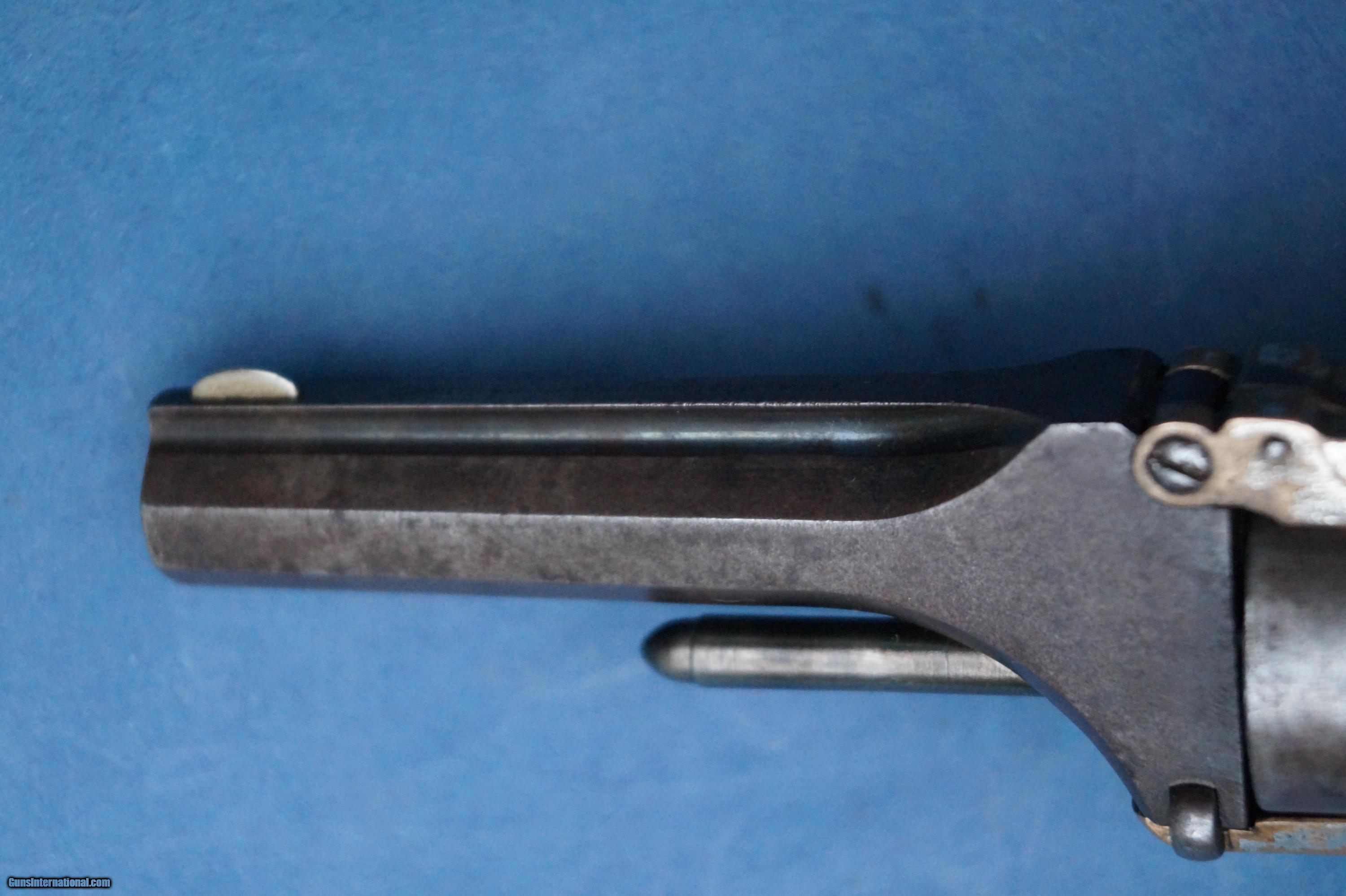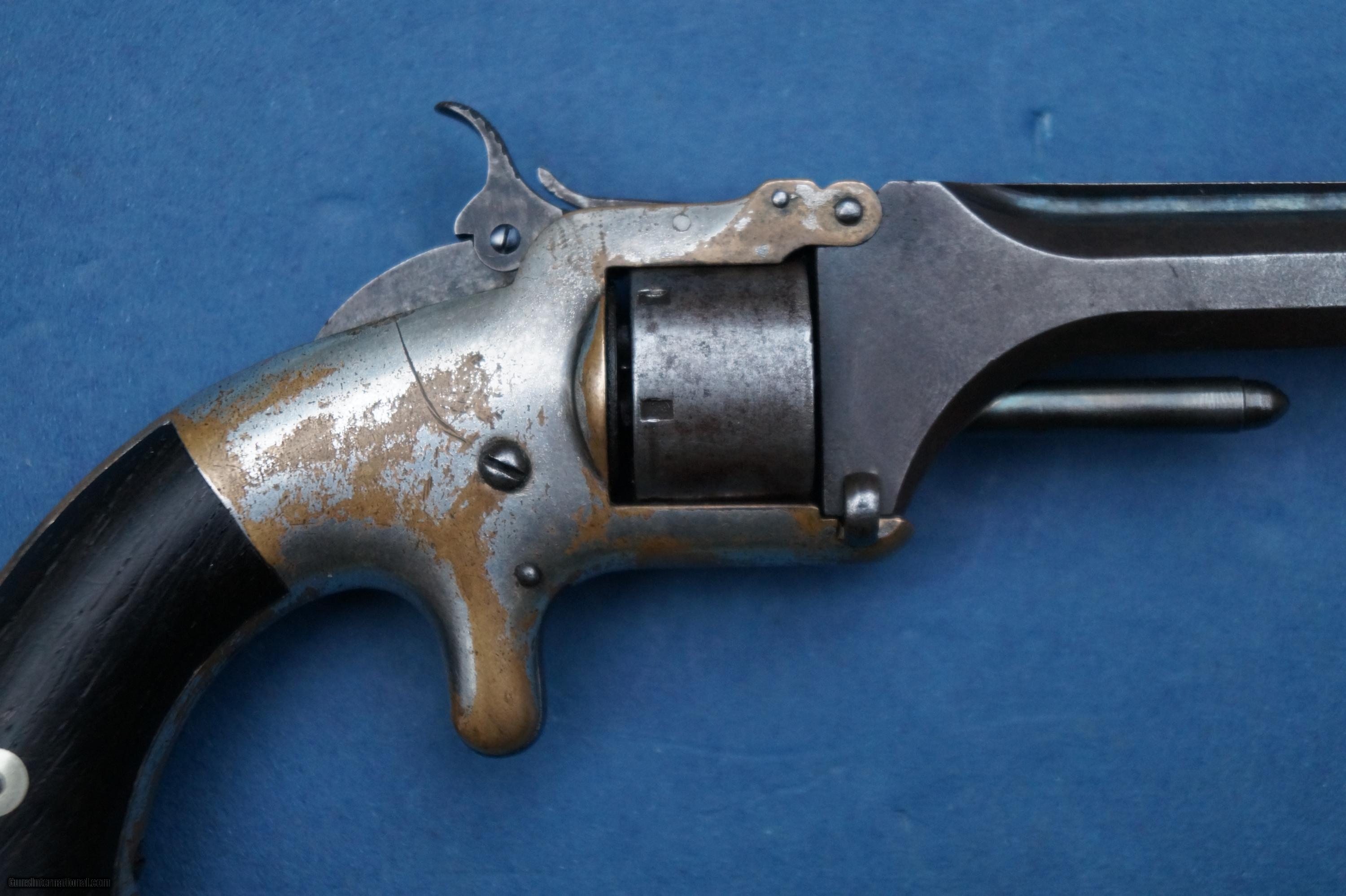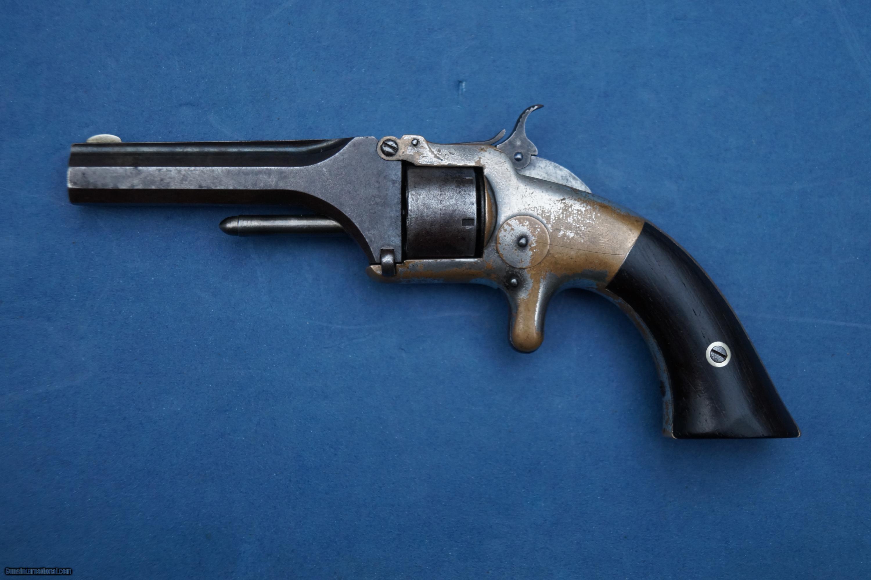 Description: Nice example of a Smith & Wesson Model One, First Issue Revolver. Standard single action spur trigger with 7 shot cylinder. This landmark gun was the World's First Successful Cartridge Gun making it the Great Grandfather to all cartridge weapons. It was introduced 1857 and produced until 1860. While it was small and fired a small .22 caliber self contained cartridge (Mark Twain once compared it to a "homeopathic pill") its technological impact spelled the beginning of the end for 500 years of muzzleloading. Really amazing when you think that in less than a 50 year span, the world went from hand-made flintlocks to cartridge guns with interchangeable parts. When this revolver came out in the late 1850s, it made powder, cap, and ball weapons extinct in less than 20 years. As it was produced in the early years of the industrial revolution, Smith and Wesson made only about 11,000 of these revolvers and they sort of learned and made improvements all along the way. During the 3 years of production of the Model One, Daniel and Horace made 6 notable improvements. Today, collectors note this variations as Type 1 through Type 6 with Type 1 thru 2 being the scarcest and most valuable. This particular example is one of the lower serial numbers we've had as its in the 2100 range. It is a Type 3 and was built (according to S&W records) between September and December 1858. As the barrel tip-upwards via a small hinge located at the top front of the frame, Smith and Wesson had to find a way to latch the lower portion of the barrel lug tightly to the frame. The first two Types used a long spring nicknamed the "bayonet latch". The 3rd Type used an improved latch spring loaded latch on the bottom of the barrel which locked into a small notch on the lip of the frame. Today, there are only a handful of known Type 1's that fetch 5 figure price tags and Type 2's usually bring $5-10K. That said, the Type 3 is the earliest variation of the Model One that is affordable and it still has some very interesting early features. This includes the fascinating revolving recoil shield design with an internal ratchet. See Photo. Usually, we think of a revolver as having its ratchet as a part of the cylinder but S&W broke this down into two components at first. The barrel attaches to the face of the shield via a small pin or key. It also has the early 3 groove rifling. Then there are the features that all Model Ones share such as the rounded frame, the small round sideplate to access the mechanics, and the two-piece hammer design with pivoting spur to unlock the cylinder bolt from the top of the frame. These were all great features but they were delicate and prone to breakage not to mention the small access plate probably caused a great deal of angst to early gunsmiths. Today, its hard to find one that is in good mechanical order but this one works perfectly. Oveall condition grades to NRA Antique Very Good with 60% original silver plating remaining on the brass frame and 10% original blue on the barrel in the protected areas. The balance of the steel on the barrel and cylinder have turned to a smooth grey to brown patina with nice edges. The Smith and Wesson Barrel address is perfect and the tiny April 3, 1855 Rollin White Patent on the cylinder is worn but still legible. The original rosewood grips are solide and numbered to the gun. Cylinder still cocks, indexes, and locks while the barrel latches tights to the frame with a good solid hinge. For such a complex piece of machinery, its in amazing shape for 159 years old. Many of these Model Ones saw service in the Civil War as they were popular with soldiers who privately purchased them as back-up weapons. During the war where Armies lived for the most part out in the elements, these early Seven Shooters gained a good reputation due to fact their .22 caliber self-contained cartridges were water-proof. SOLD Antique: Yes Manufacturer: S&W Model: Model One, First Issue, Type III Caliber Info: 22 Barrel Type: Octagon Action: Single Finish: Blued / Silver Manufacture Date: 1858 |