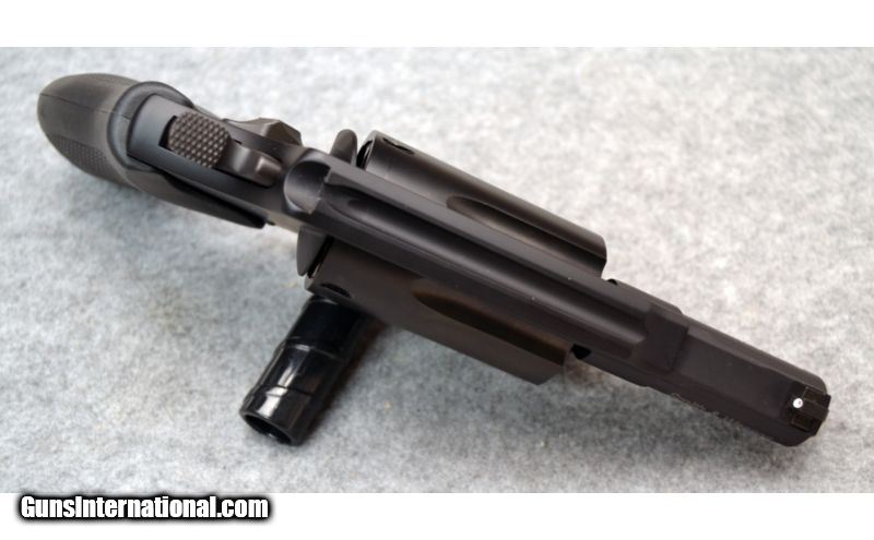 Description: Double action revolver with factory case, moon clips, and other accessories. SOLD Caliber Info: .45 Long Colt/ACP, .410 Gauge Metal Condition: Excellent Bore Condition: Excellent Barrels: 2 1/2 Triggers: Double action Stock: Black checkered rubber Smith & Wesson grips Sights: Front fixed night sight, rear square notch Item Location: Christiana, DE |