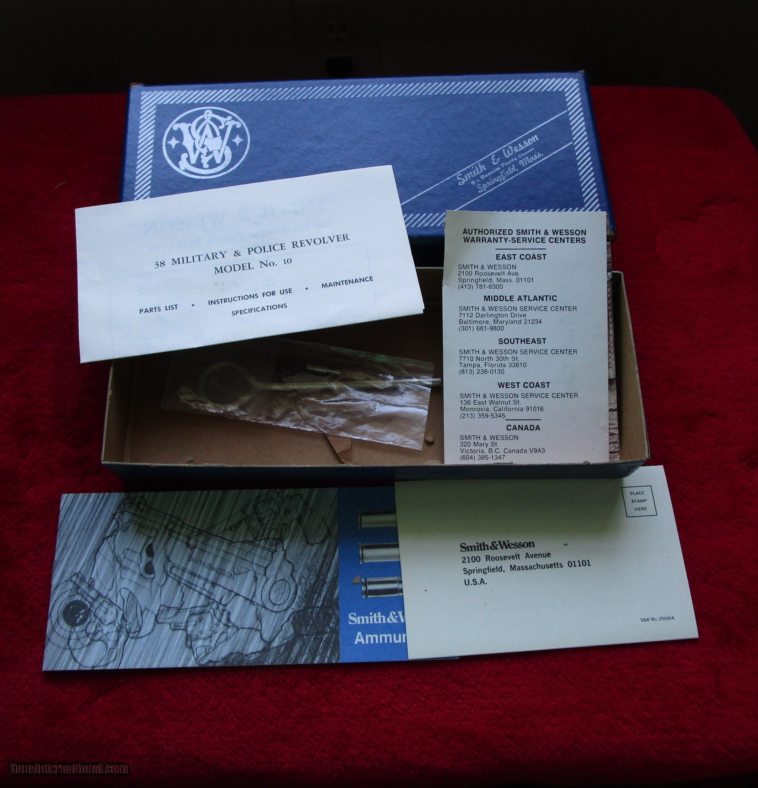 Description: Excellent condition Smith & Wesson Model 10-7 .38 Special Revolver with 4" barrel. Comes with original box. $30.00 Shipping FFL required for shipping; All items shipped Priority Mail Please contact Gloria at 540-580-2762 (after 12 noon eastern time) or email commonwealthcollectiblesyahoo 4% Credit Card Fee Thanks for looking! SOLD Manufacturer: Smith & Wesson Model: 10-7 Serial Number: 23526 Caliber Info: .38 Special Bore: Excellent Condition: Excellent Barrels: 4 Finish: Blue |