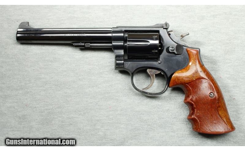 Description: Very good condition, light finish wear, small nicks and scratches. Classic S&W .38 Special revolver, 6" pinned barrel, polished blue finish, 6 shot fluted cylinder, adjustable sights, checkered hammer & cylinder latch and checkered wood grips. .38 Special SOLD Chambers: Revolver Metal Condition: Very good Bore Condition: Bright Barrels: 6 Triggers: Double and single action Butt Pad: Wood grips Sights: "Adjustable rear, blade front sights Item Location: La Vista, NE |