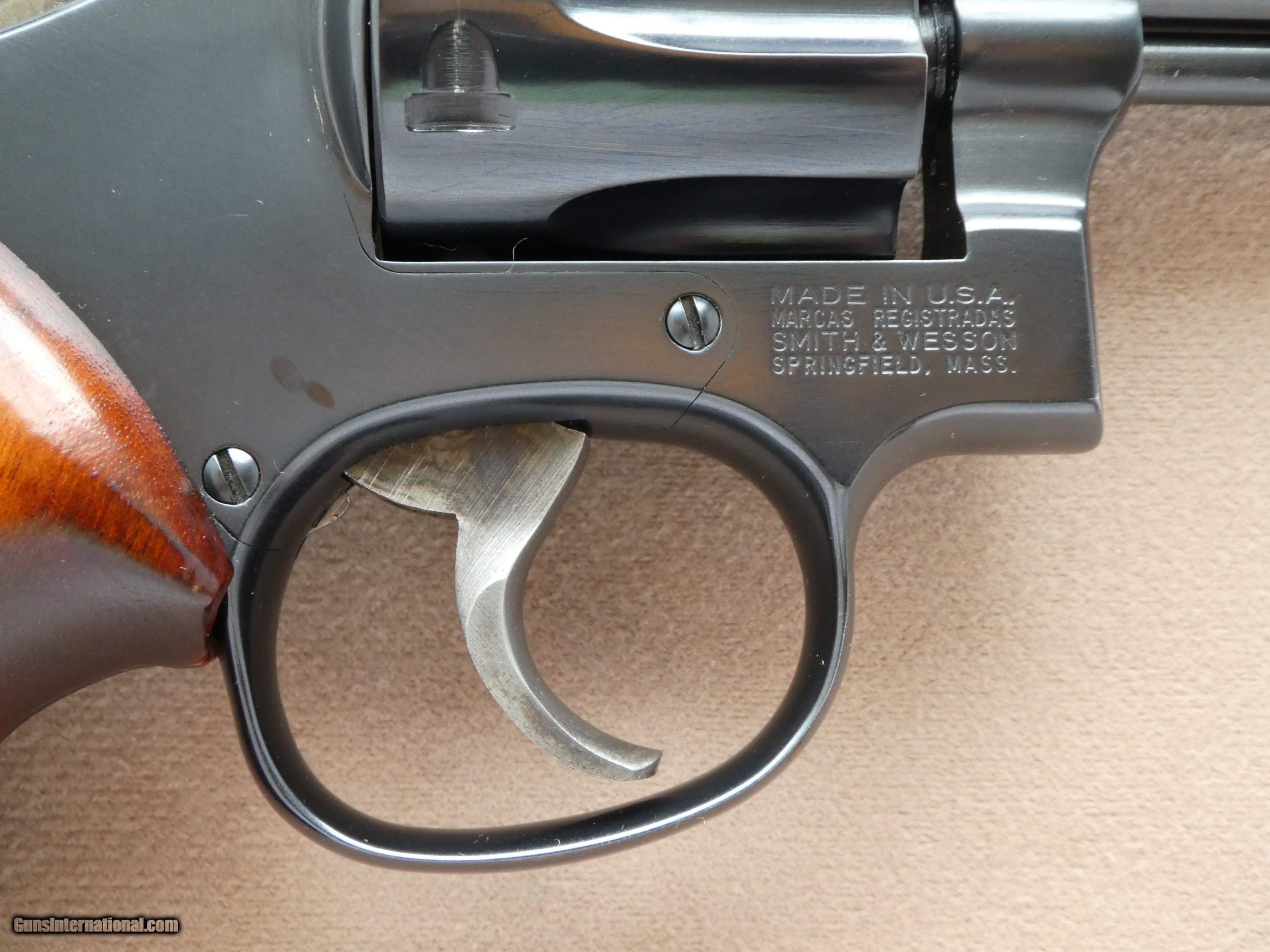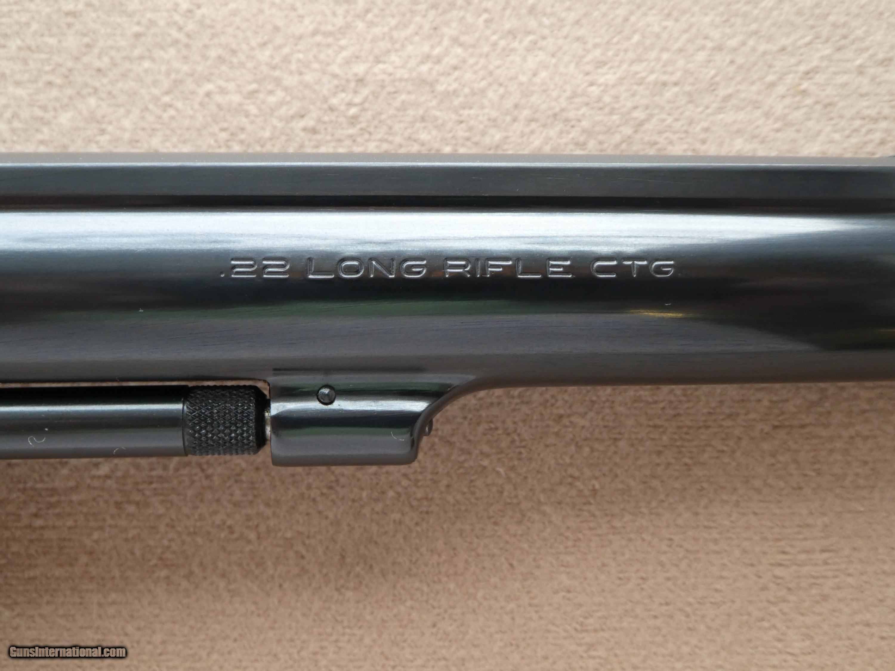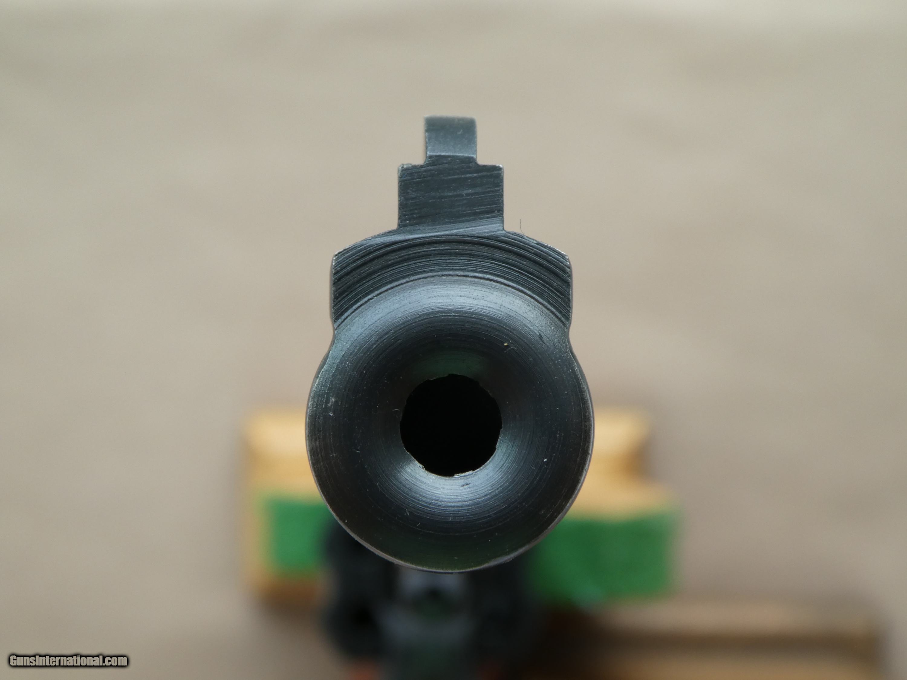 Description: This is a beautiful all-original Smith & Wesson Model 17-5 "K22 Masterpiece" revolver with a 6" inch barrel made in the late 1980's. The original factory blue finish rates 97% or better with only some tiny handling marks visible under close inspection and one small dark blue spot on the right side above the trigger (close up picture provided). The overall appearance of this S&W is excellent as you can see from the pictures. The bore is minty and bright in this S&W. The rifling still shows sharp lands and grooves and there is no pitting or erosion visible whatsoever. The cylinder bores are equally as clean and pristine. The factory iron sights are in excellent condition. Both the windage and elevation adjustments on the target-style rear sight work perfectly. This K22 Masterpiece has particularly attractive factory Cocobola target grips that are in excellent shape. They show lots of nice contrasting figure and grain, and are free from cracks, chips, or repairs. The original checkering is still clean and the grips are nicely fit to the gun and tight to the metal. The action on this Model 17-5 is smooth and crisp. It is perfectly "in time" and locks up tight. The trigger is exceptional in single or double action modes of operation. All of the controls on this Smith work 100% like the day it left the factory. These K22 Masterpieces are very collectible and nice examples seldom last long on the market. If you have been looking for a collector quality Model 17 for your collection, this 17-5 model would be a perfect choice. SOLD Manufacturer: Smith & Wesson Model: 17-5 Serial Number: AYU7865 Caliber Info: .22 Rimfire Bore: Minty Condition: Excellent Manufacture Date: Late 1980's |