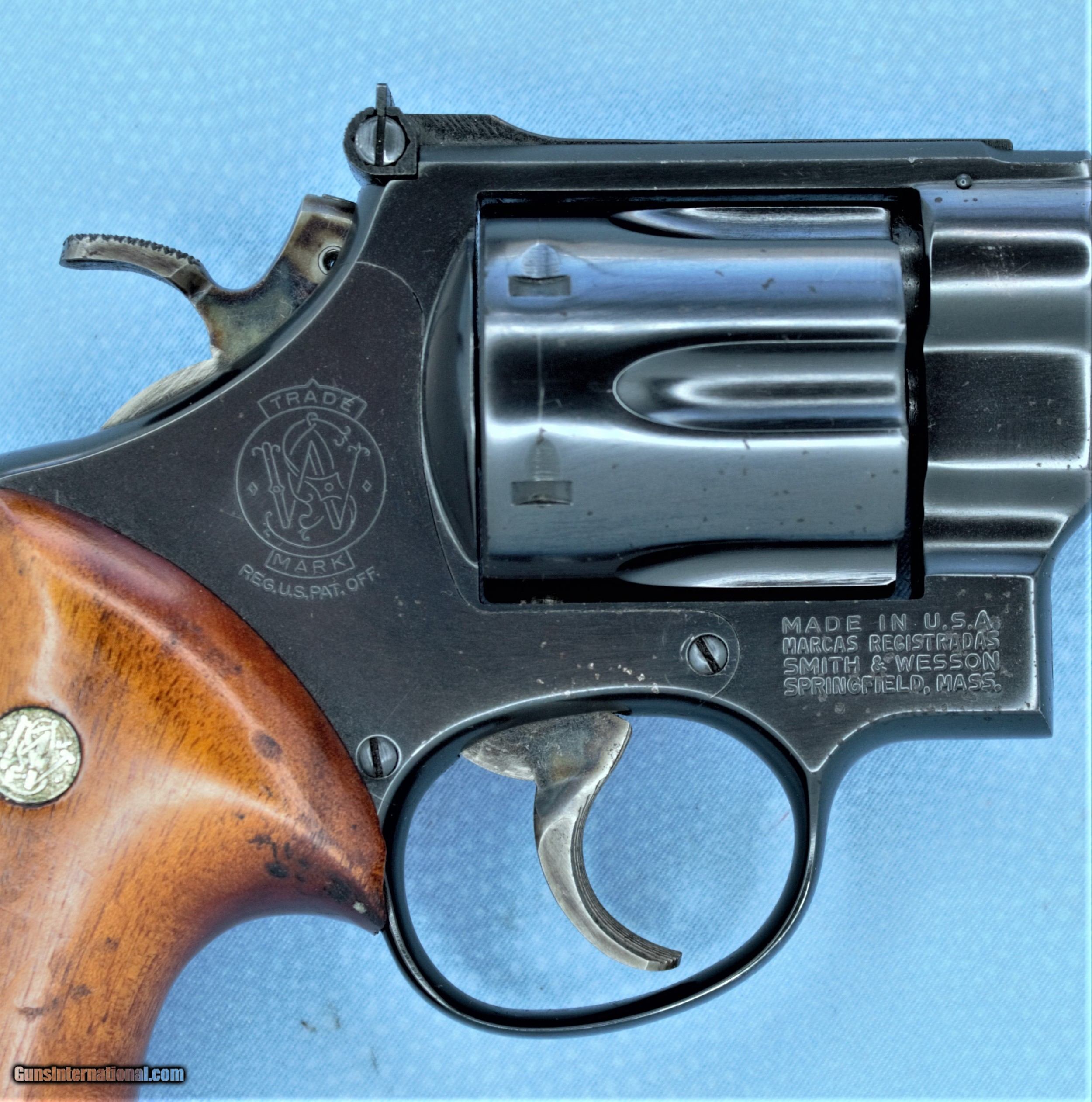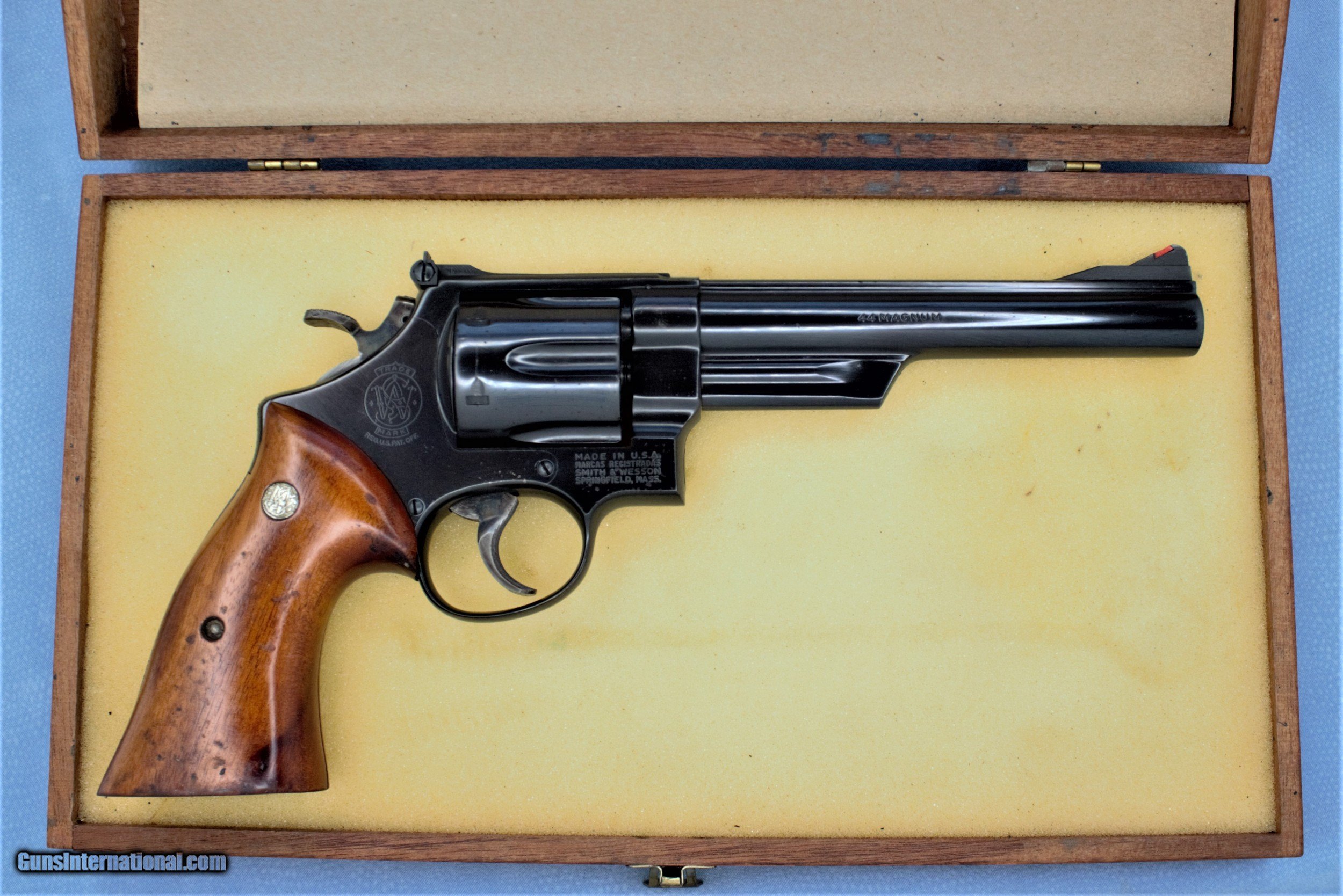 Description: Smith and Wesson Model 29-2 with a wooden presentation box. This Smith has a 6-1/2 inch pinned barrel which is typical of a "-2" variation. The blue still retains most of it's luster. But there is some scatter "pin-pricking" on the barrel and frame. The grips have a large percentage of the varnish worn off. But, are free from any imperfections. This Model 29 has been fired but the cylinder still locks up tight and the trigger pull is silky smooth. The bore's bright and there's strong rifling. This will be a super addition to any Smith and Wesson collection and/or a great revolver for hunting. We are Antique & Modern Firearms in Lexington, KY, dealer of fine firearms since 1974. PH. 859-276-1419 We Buy, Sell and Trade Firearms & Knives. Have a Individual Firearm, Firearms Collection, or Firearms Estate to sell, let us know, we can buy or consignment sell it for you. NOTE: No additional fee for a Credit Card payment. Price: $ SOLD SOLD Handgun Caliber: .44 Remington Magnum Manufacturer: Smith & Wesson Model: 29-2 Serial Number: N135368 Barrel Length: 6.5 INCHES Condition: Very Good Metal Condition: Very Good Wood Condition: GOOD Bore Condition: Very Good / Excellent Action: SA/DA |