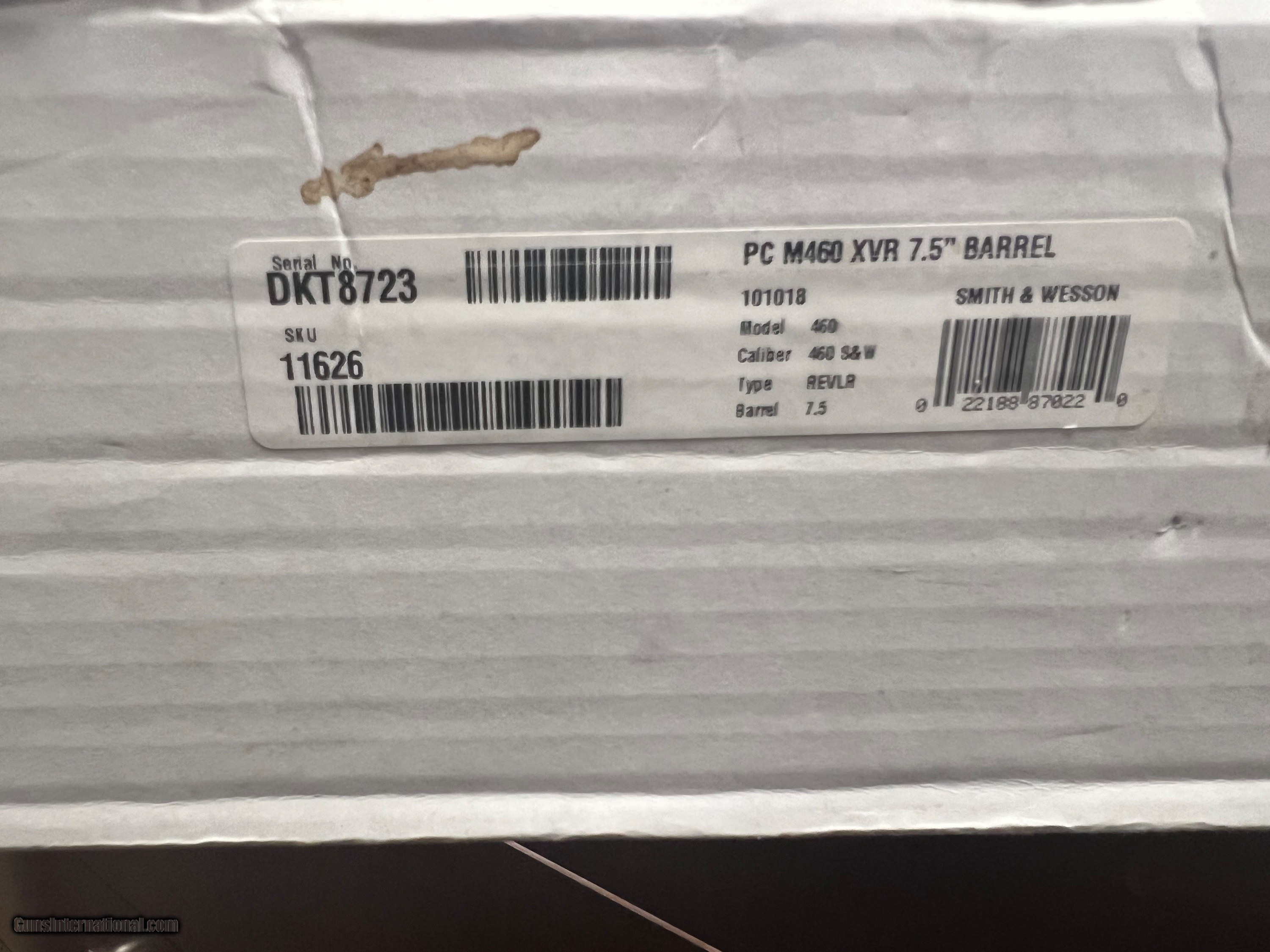 Description: This is a unfired Smith & Wesson 460 XVR PC 7.5" in the box. It has a Leupold M8 2X E.R. Stainless scope. It has stainless warne rings also. The gun comes from the factory with a sling and swivels. Shipping is $50.00. SOLD Handgun Caliber: .460 S&W Magnum Manufacturer: Smith & Wesson Model: 460 XVR Barrel Length: 7.5 Condition: New |