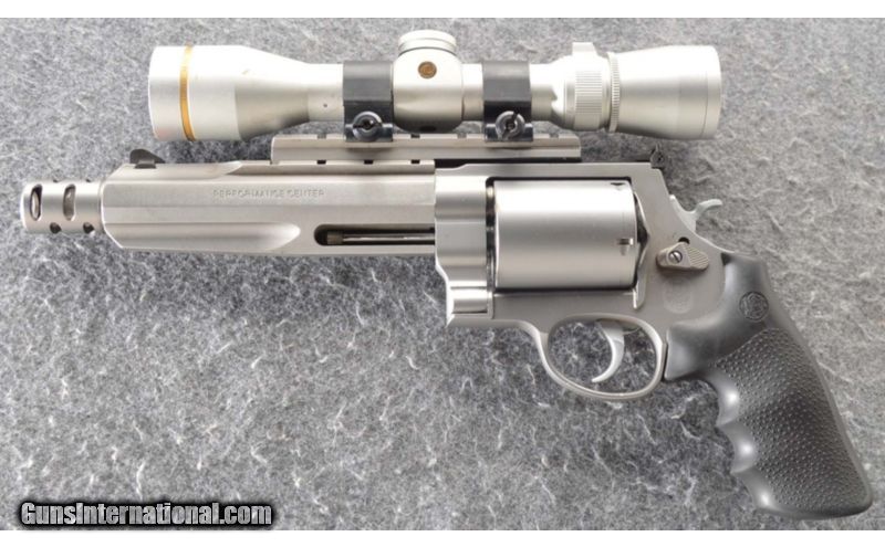Description: S&W 500 stainless steel with matte silver finish SOLD Caliber Info: S&W 500 Magnum Metal Condition: Few noticable scratches and handling marks Bore Condition: Bright and shiny. Excellent rifling Barrels: 6" with muzzle break Triggers: SA/DA chrome with trigger stop Stock: Stock rubber grips Weight: 5 lbs 8 oz Sights: Orange ramp front sight black adjustable rear blade, Leupold VXIII 2.5 by 8 handgun scope Extras: Scope,soft case Item Location: Sidney, NE |
