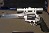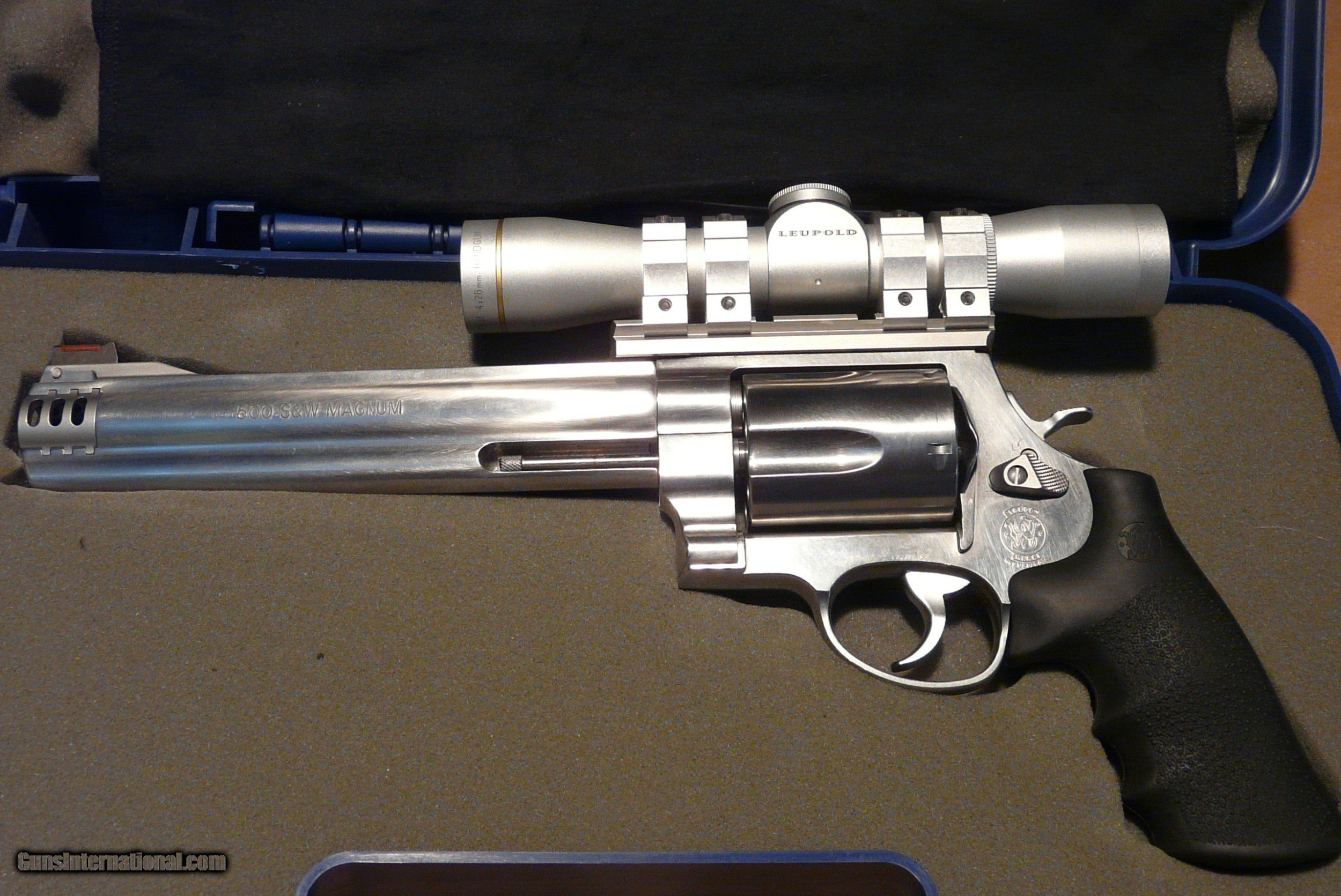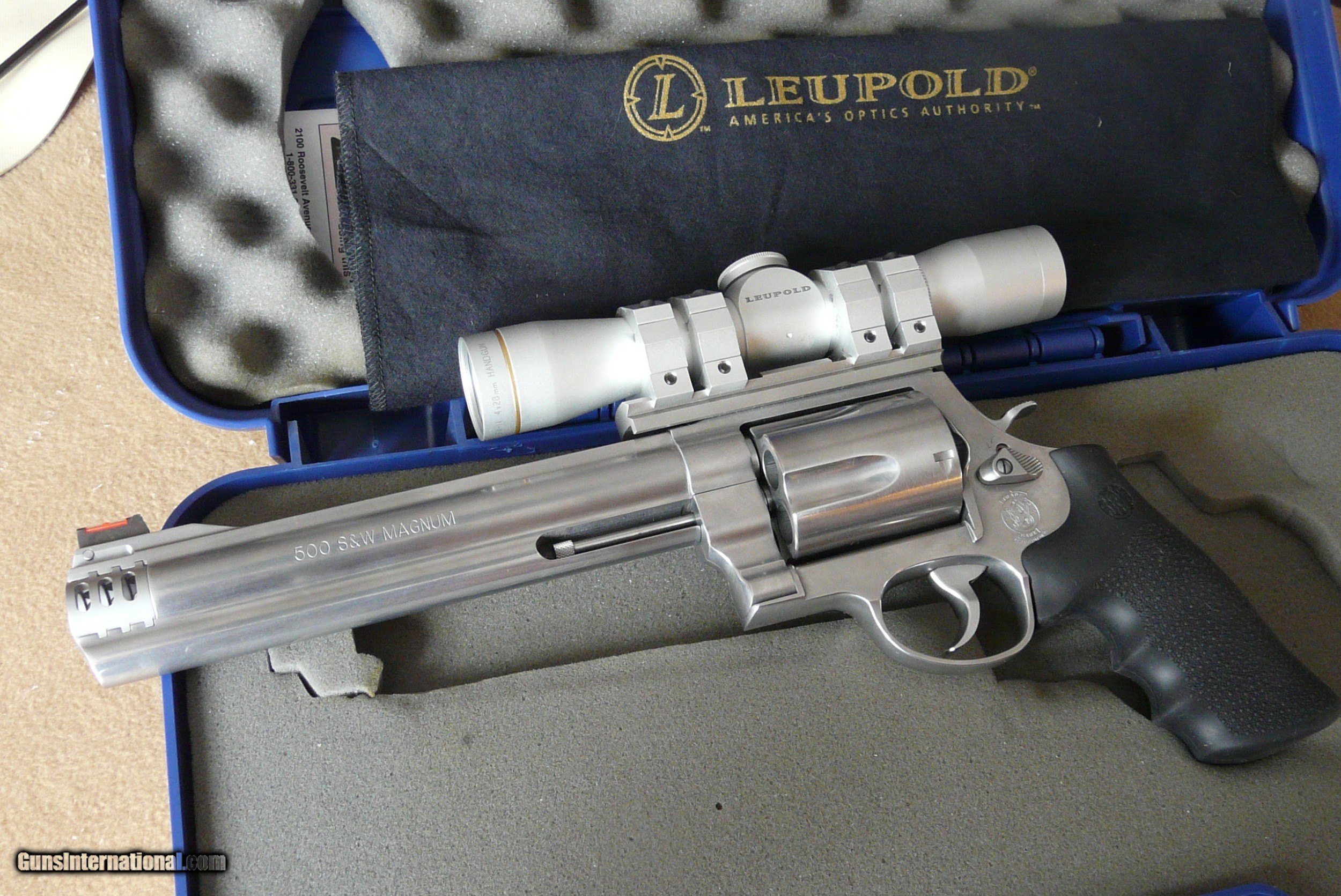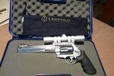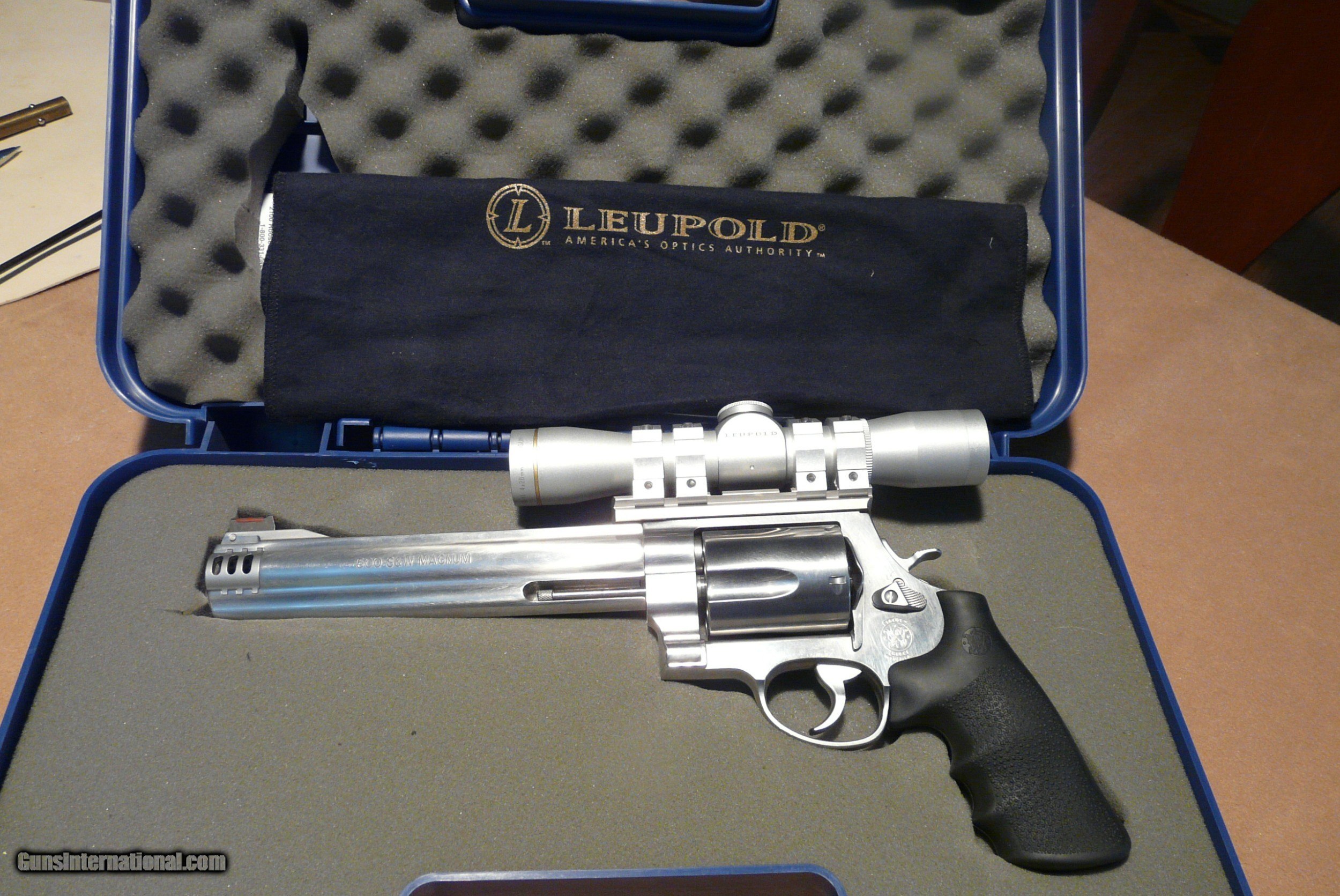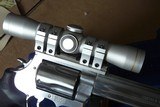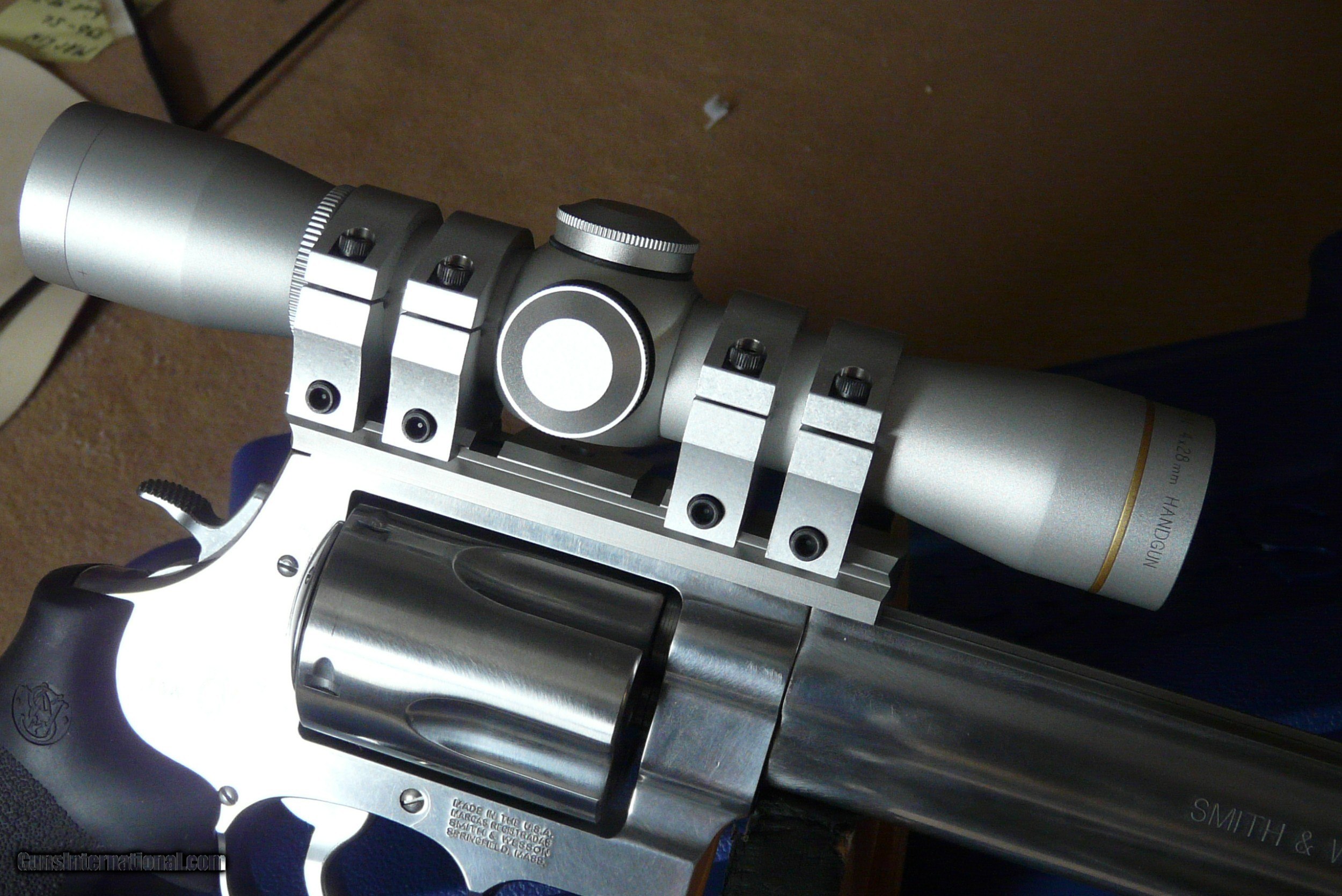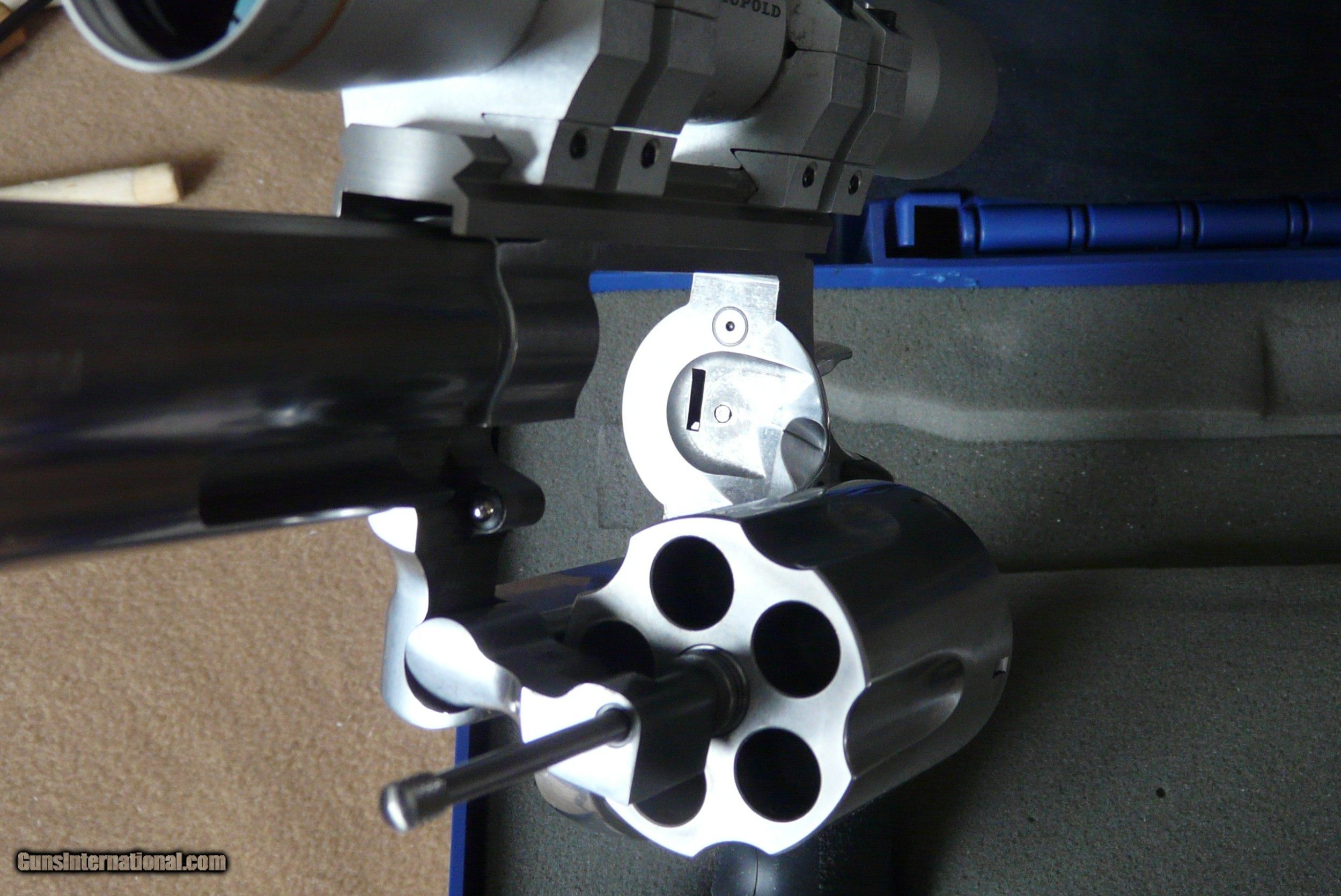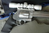 Description: This has been fired a few times only, not a mark on the factory Stnls finish, with Leupold 4X28 Handgun scope, in double ring mount, in original box ! They do not get better than this, for hunting Big Game !! SOLD |
