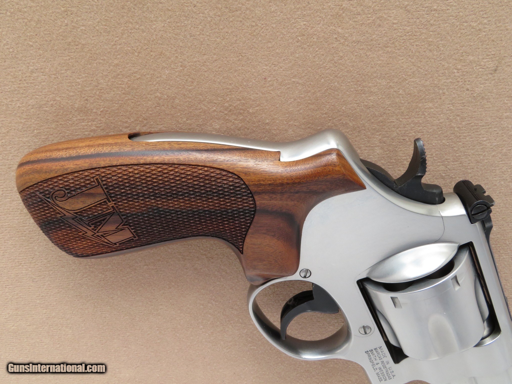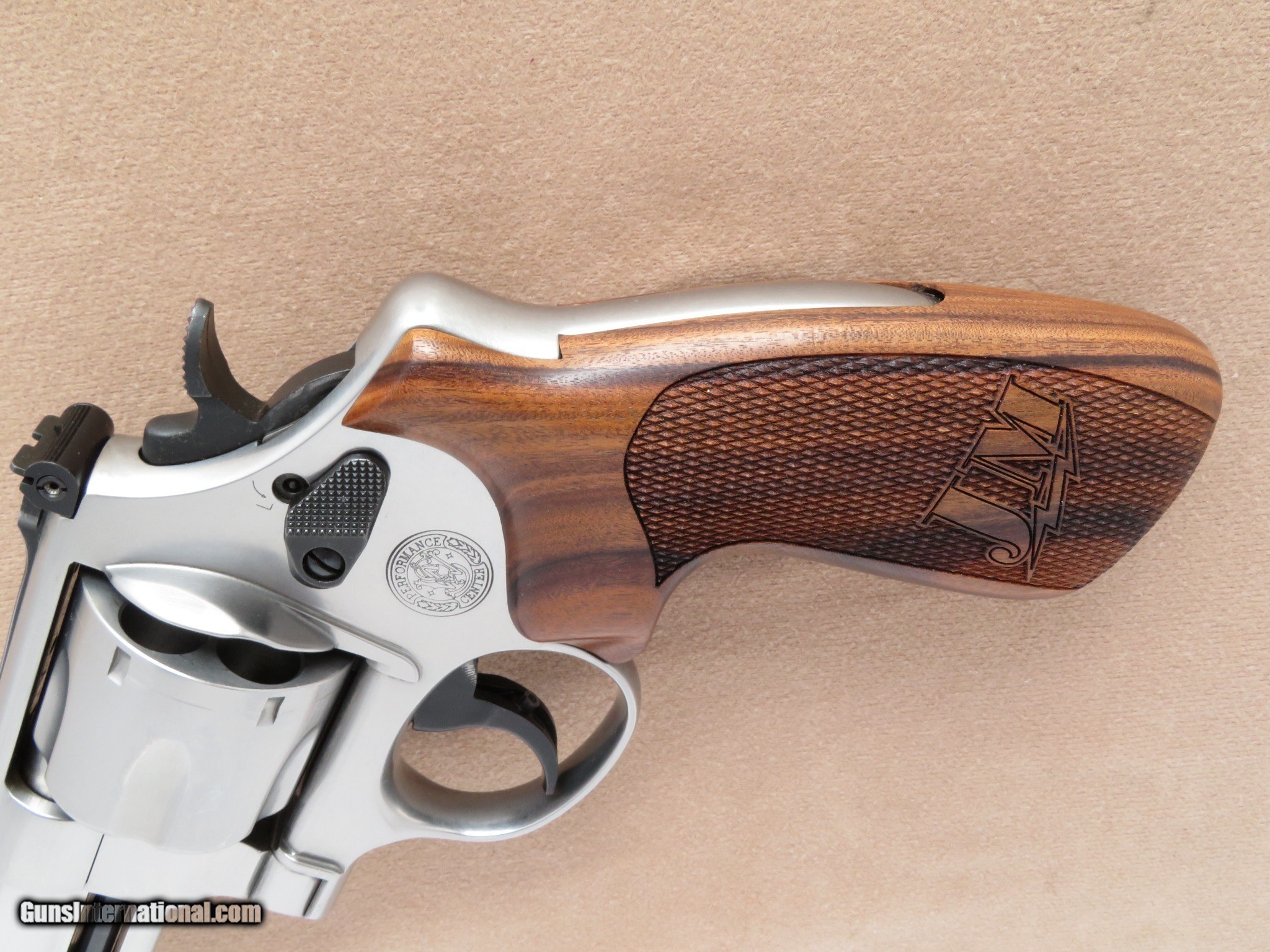Description: Smith & Wesson Performance Center (S&W SKU 170161) Model 625-8 fitted with a 4 inch barrel with deep cut broached rifling, gold bead front sight, black adjustable rear sight, altamont red, white & blue laminated grips (comes fitted with accessory Jerry Micelek checkered walnut grips), PC tear drop hammer, PC trigger with stop, PC tuned action, chamfered charge holes, cylinder cut for moon clips, and chambered in .45 ACP. Performance Center guns originate from standard designs or are created from the ground up. From hand-cutting and fitting to fine tuning for precision, these firearms are top performers. Products from the Performance Center are the ultimate expression of old-world craftsmanship blended with modern technology. This Model 625-8 Performance Center is in excellent condition, with only some minor surface scuffs/scratches on the cylinder and under the trigger guard. The bore is as new and the action functions the same. Comes with its original numbered to the gun box, moon clips, and all paper-work. PRICE: $775 We are Antique & Modern Firearms in Lexington, KY, dealer of fine firearms since 1974. PH. 859-276-1419 We Buy, Sell and Trade Firearms & Knives. Have a Individual Firearm, Firearms Collection, or Firearms Estate to sell, let us know, we can buy or consignment sell it for you. NOTE: No additional Fee for Credit Card Purchases. SOLD Manufacturer: Smith & Wesson Model: 625-8 Caliber Info: .45 ACP |