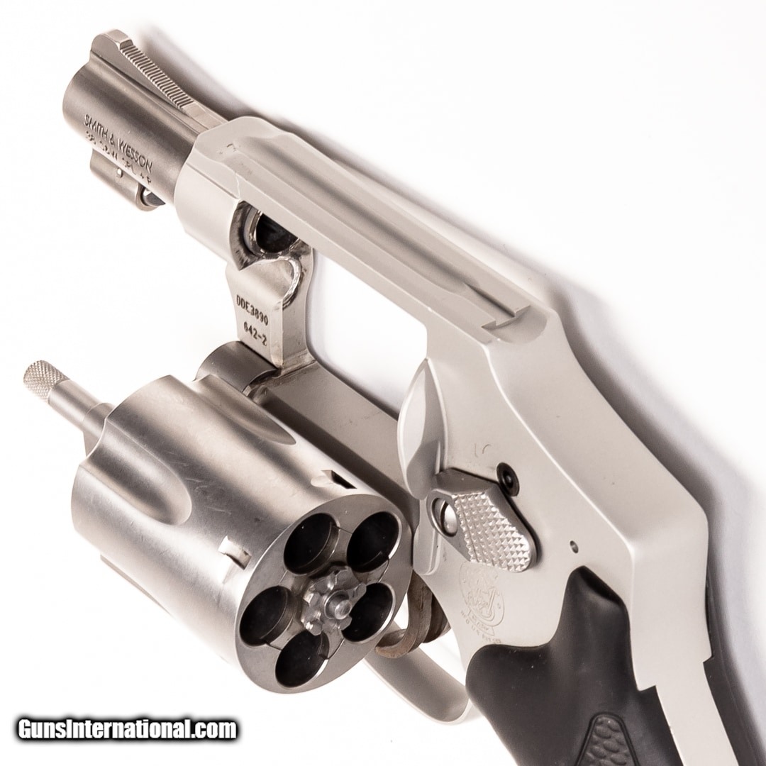 Description: Guns Listing ID: 458135 The Smith & Wesson Model 642-2 is a snub-nosed 5-shot revolver chambered in .38 Special. Compact and powerful, this J-frame configuration has been the go-to carry gun for countless off-duty officers and private citizens. SOLD Manufacturer: SMITH & WESSON Model: 642-2 Caliber Info: .38 SPL Condition: Used - Certified Barrels: 19 BARREL Finish: STAINLESS |